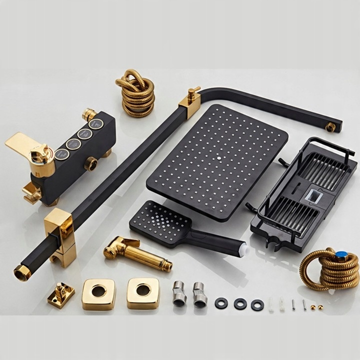 Душовий набір із змішувачем для ванної кімнати золотого та чорного кольорів оснащено тропічним душем, який розміщується над головою користувача. Вода, що витікає з квадратного тропічного душа, приймає форму дощу, приємно кроплячи голову і тіло. Він справляє враження масажу та забезпечує неймовірні враження від релаксації