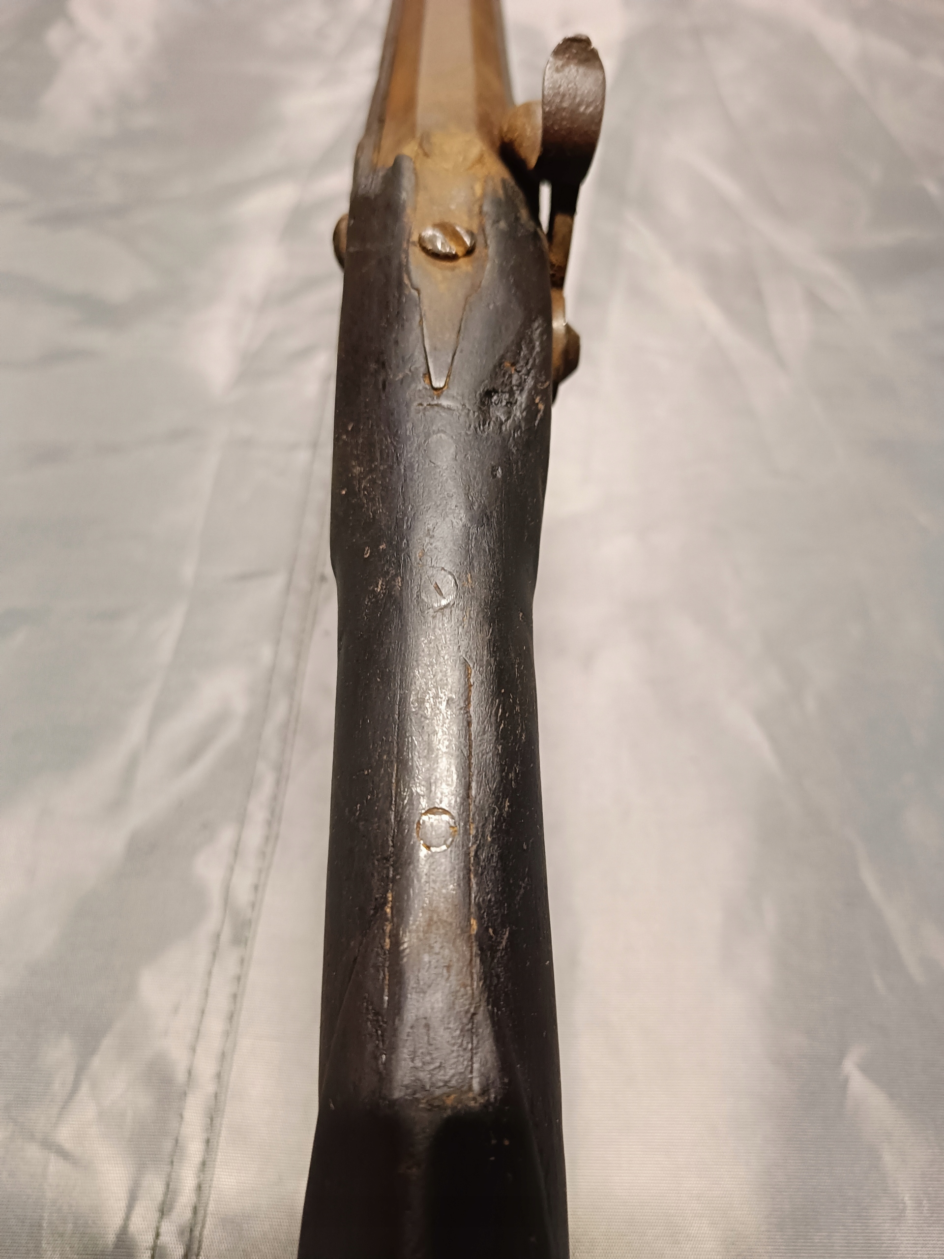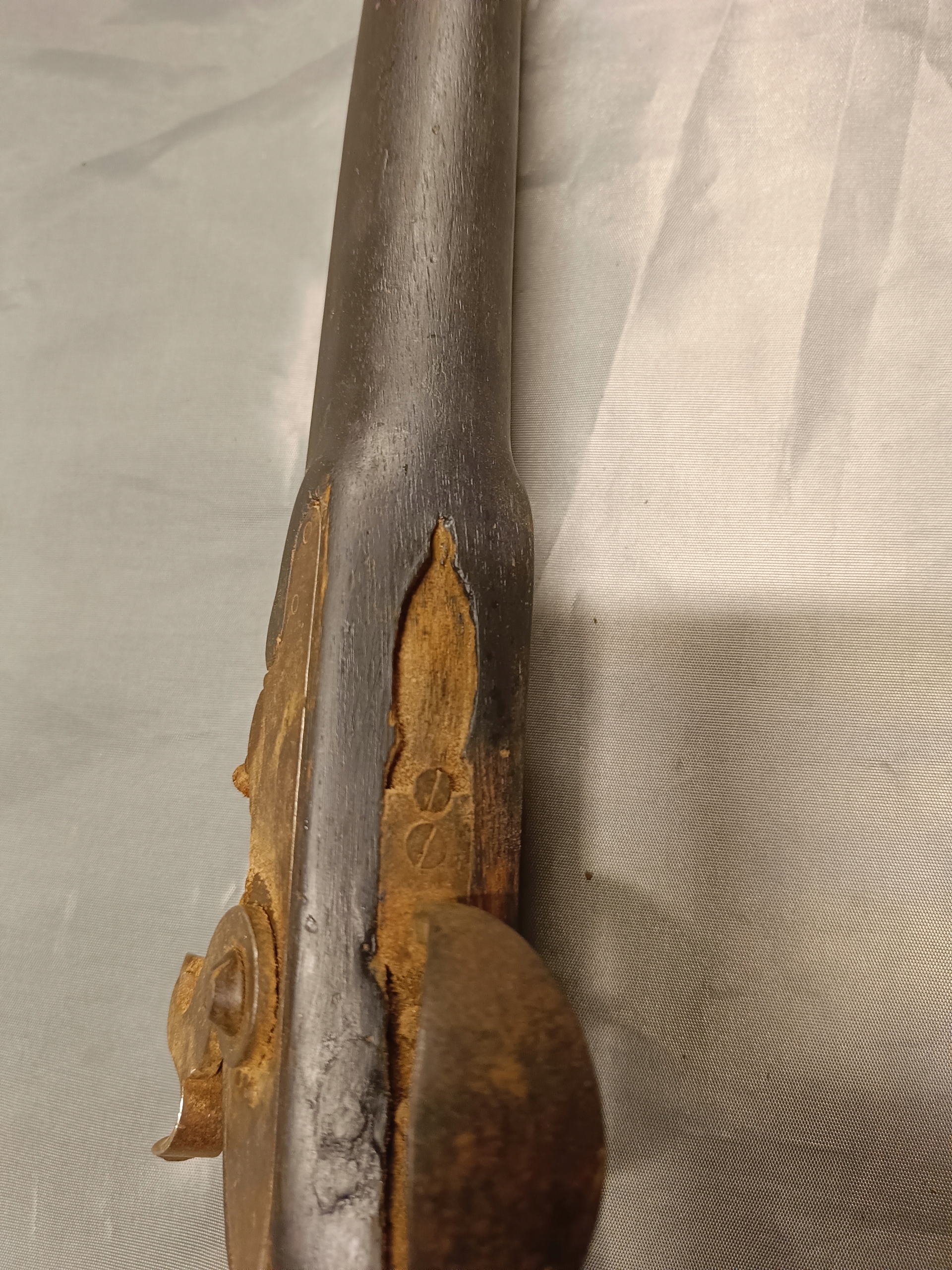 Фронтальне заряджання. Можна зробити сухий постріл. Замок курка затягується з двох причин. На стовбурі є невеликі ямки, спричинені плином часу, і відсутня мушка. На дереві ледве помітні сліди ремонту та сліди колишнього коня. Камін потрібно замінити - він не заблокований.