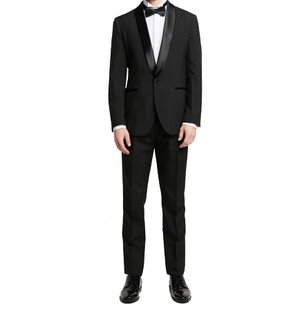 Надзвичайно елегантний чорний смокінг. Куртка має шалений комір атласу та кнопку, покритий атласом. Гладкі штани, притиснуті до класичного краю, значно зменшить силует чоловічої статі.