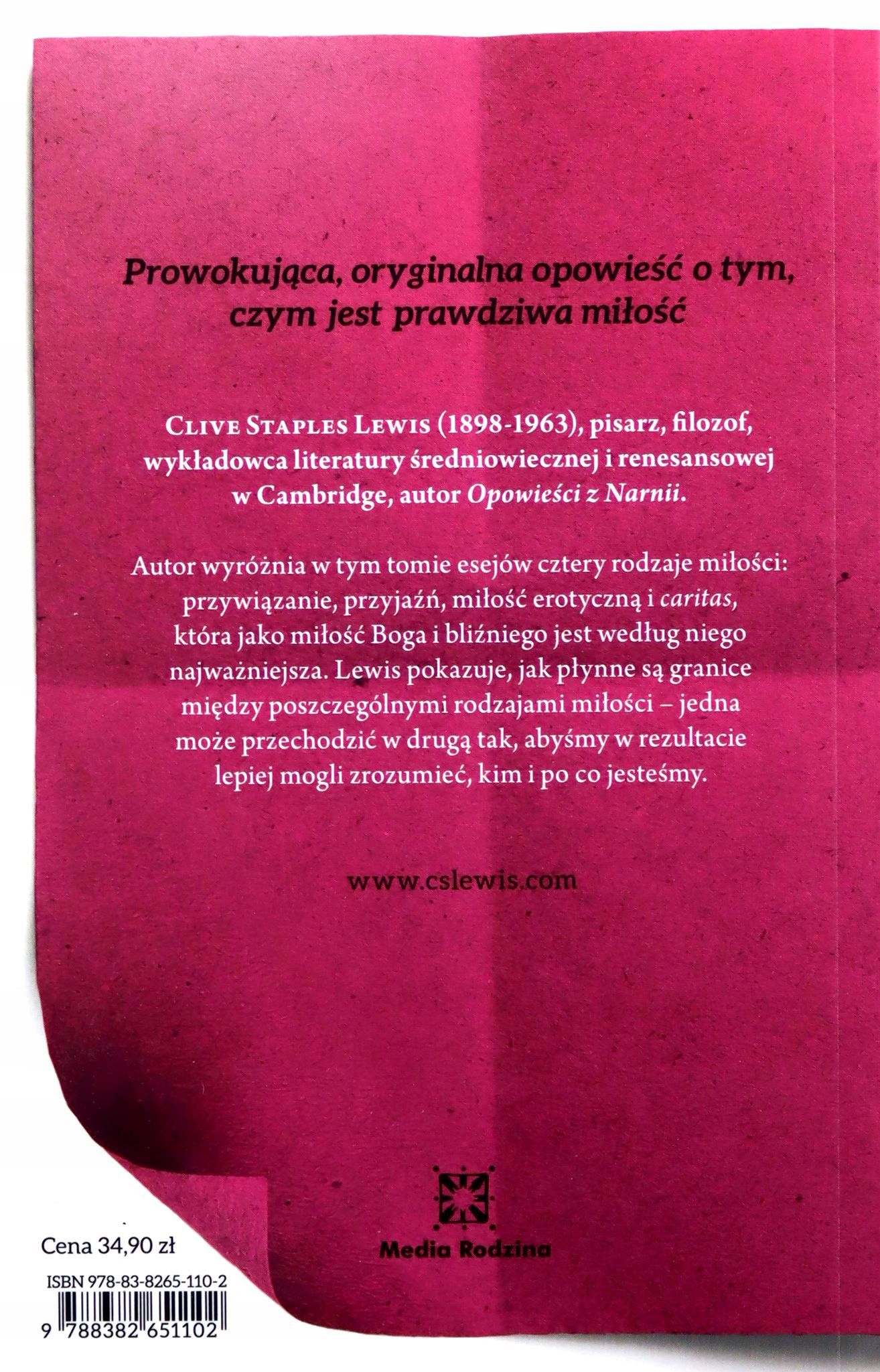 C.S. Льюїс (1893-1963), письменник, філософ, викладач Оксфордського університету, автор знаменитих «Хронік Нарнії». У томі есе «Чотири кохання» Клайв Стейплз Льюїс виділяє чотири типи кохання: прихильність, дружбу, еротичне кохання та карітас. Остання, як любов до Бога і ближнього, є найважливішою з них. Льюїс показує, наскільки мінливі межі між певними типами кохання. Тому що одне може перетворюватися на інше, щоб ми могли краще зрозуміти, хто ми і навіщо ми. Провокативна, оригінальна історія про те, що таке справжнє кохання. Клайв Стейплз Льюїс, професор середньовічної літератури в Оксфорді. Таємна земля, прихована за дверима старої гардеробу в маєтку в англійській місцевості. Він став місцем пригод для чотирьох братів і сестер, які знайшли притулок у цьому будинку перед Другою світовою війною. Незважаючи на популярність серіалу «Нарнія», Льюїс більшу частину свого часу і роботи приділяв серйозним науковим трактатам і роздумам про Бога і християнську віру. «Чотири кохання» — одна з кількох збірок есе К. С. Льюїса, опублікованих Media Rodzina. Разом із такими книгами, як «Просте християнство», «Листи старого диявола до молодого» та «Останній розділ», вона видається в новому графічному оформленні.