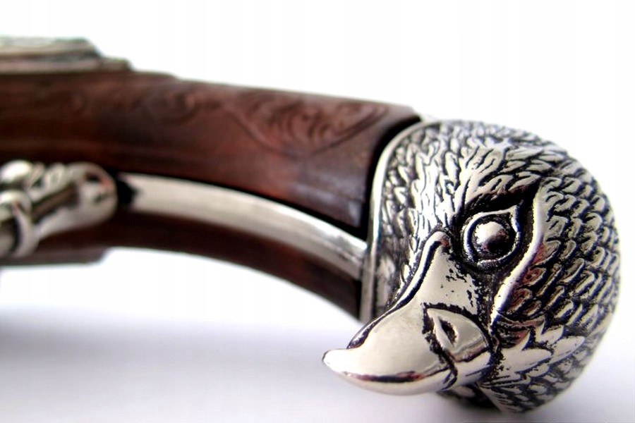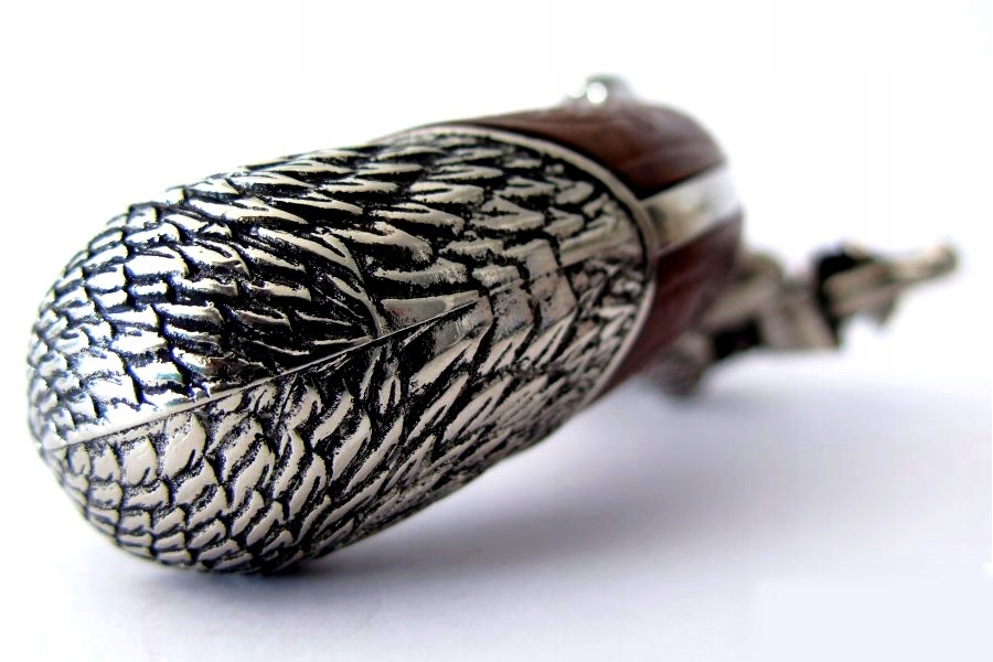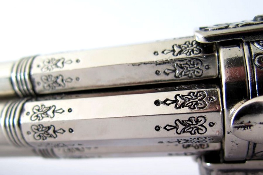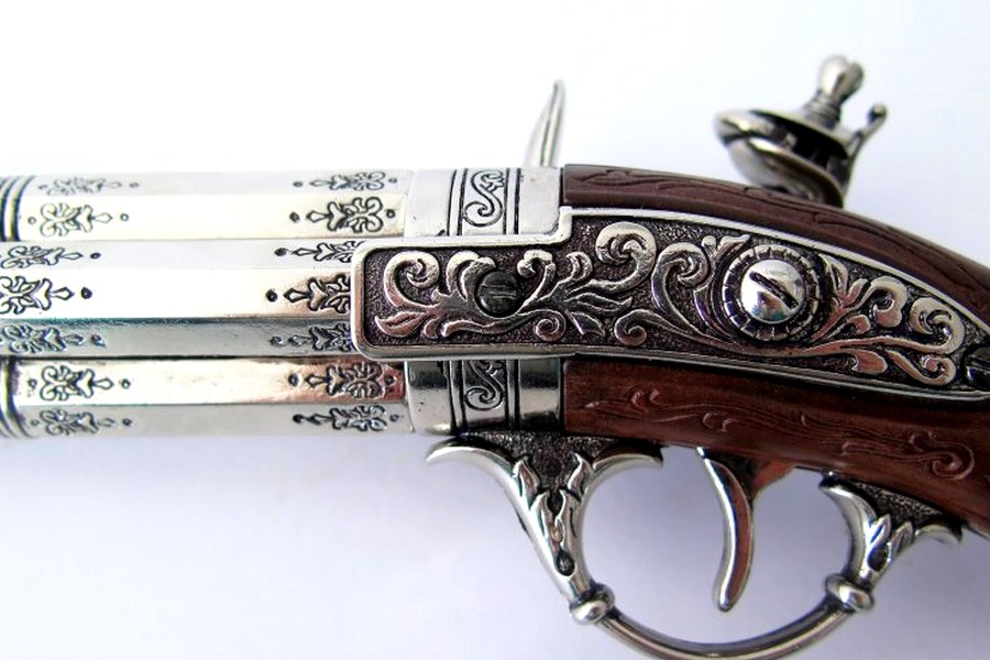 Представлена копія оригінального чотириствольного французького кремневого пістолета, який використовувався піратами у XVIII столітті. Використовувався для одноразового пострілу, оскільки перезаряджання зброї займало багато часу. Тому після стрільби боєць був змушений тягнутися до шаблі чи шпаги. Репліка виготовлена з ZnAl - сплаву цинку та алюмінію. Багато декорована, темно-коричнева ручка. Репліка має 4 обертових бочки! Репліка оснащена робочим механізмом замка. Звівши курок і натиснувши на спусковий гачок, можна стріляти т. зв сухий постріл. Копія механізму не створює іскри!