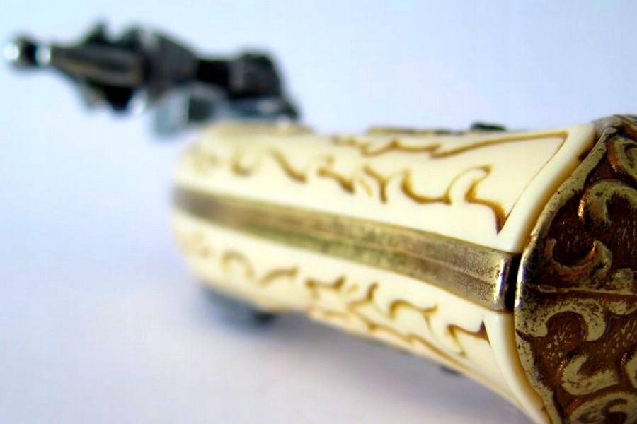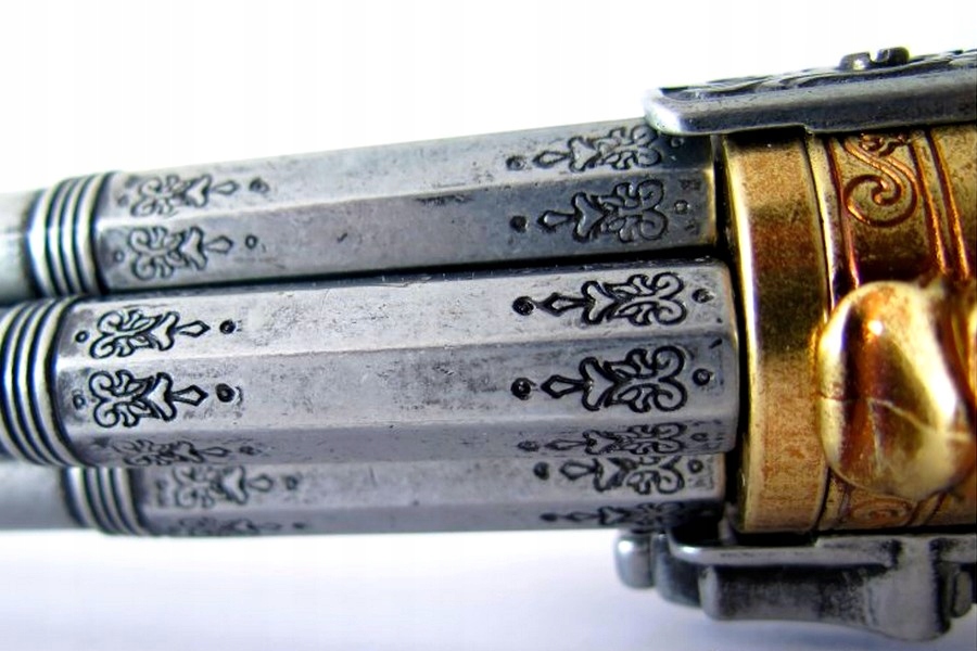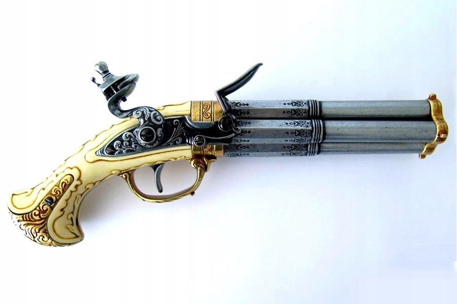 Його характерною рисою була невелика, але ефективна дальність стрільби, яка використовувалася для одного пострілу, оскільки перезаряджання зброї займало багато часу. Тому після стрільби боєць змушений був тягнутися до шаблі чи шпаги. Репліка виготовлена з ZnAl - сплаву цинку та алюмінію. Багато прикрашена ручка — матеріал кремового кольору, який дуже нагадує слонову кістку. Репліка має 4 обертових бочки! Репліка оснащена робочим механізмом замка. Звівши курок і натиснувши на спусковий гачок, можна стріляти т. зв сухий постріл. Копія механізму не створює іскру!
