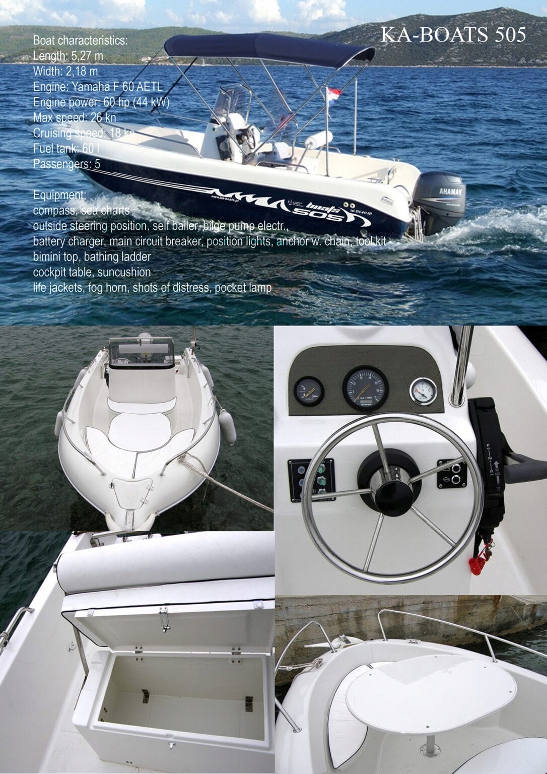 KA- ЧОВЕН 505 - моторний човен найвищої якості, призначений для водного туризму та риболовлі. Характеризується високою стійкістю і швидкістю стругання. Це човен із відкритою сонячною палубою, що робить його дуже функціональним у використанні.