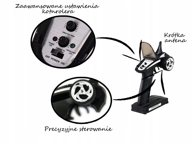 - Передавач 24 ГГц забезпечує точне керування моделлю, менше перешкод і більший радіус дії до 150 м без втрати контролю над моделлю та її стабільністю, а також можливість грати з багатьма моделями RC на один і той же час (до 10-15 моделей!), не турбуючись про виникнення перешкод на лінії модель-передавач.