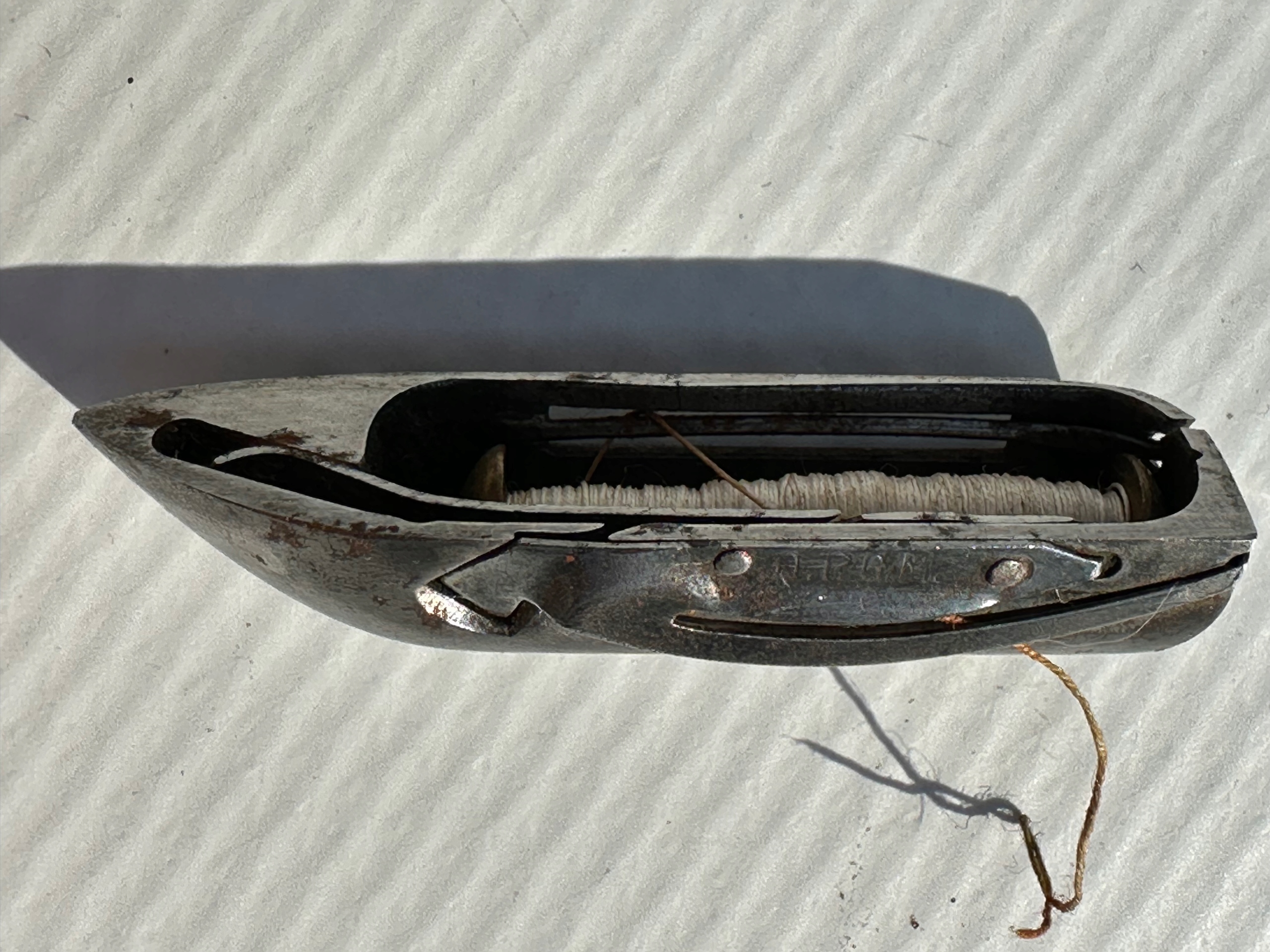 Предмет продажу човник від старої швейної машинки (№7). Цікавий екземпляр, що зустрічається в старих моделях, додатково позначений D.R.G.M. - Deutsches Reichs Gebrauchs Muster (зареєстрований зразок). Оригінальна шпуля збереглася. Стан - як на фото. Точні розміри - фото №8 (супорт в продаж не входить). Якщо ви шукаєте щось оригінальне, цей аукціон саме для вас.