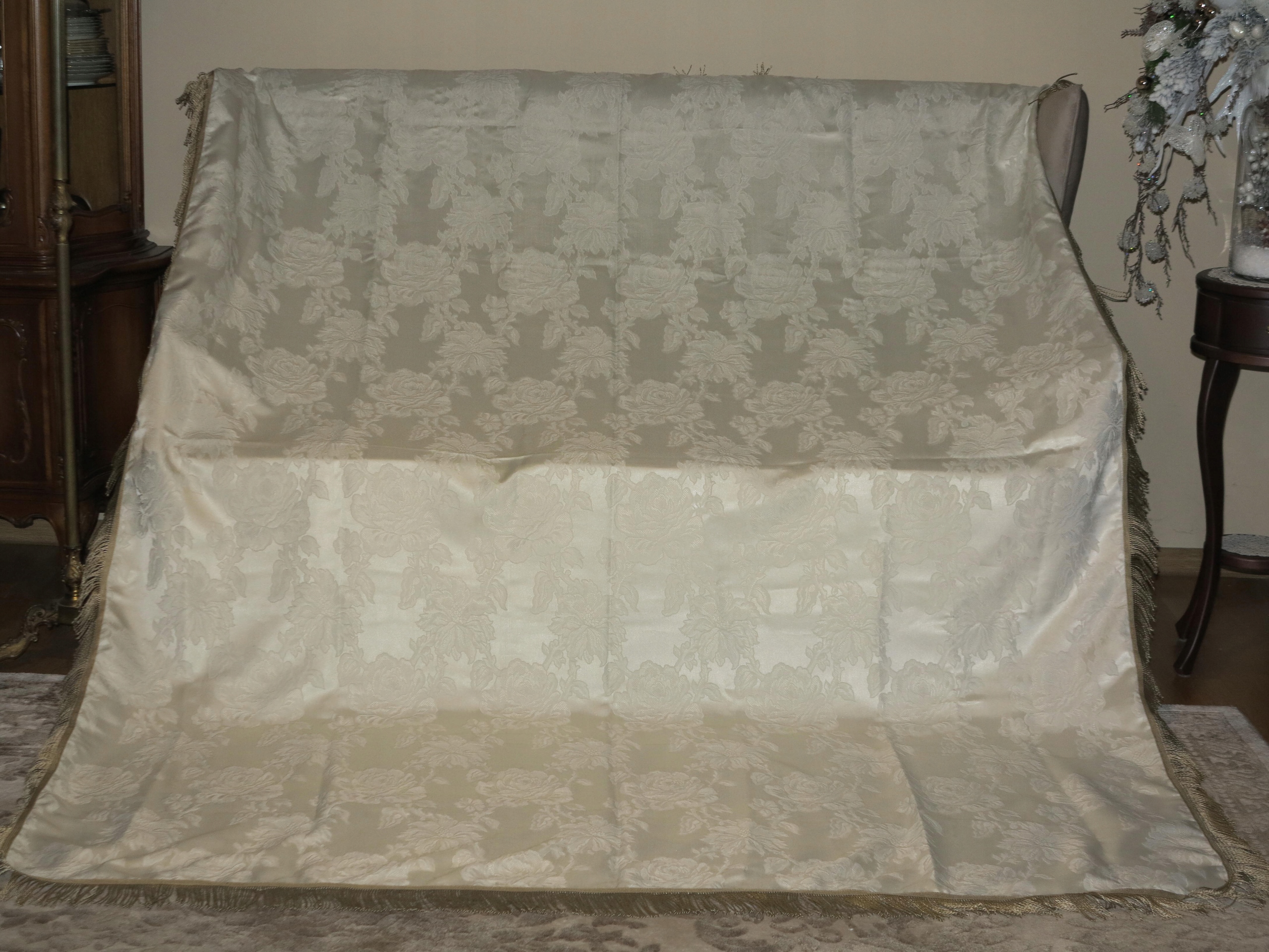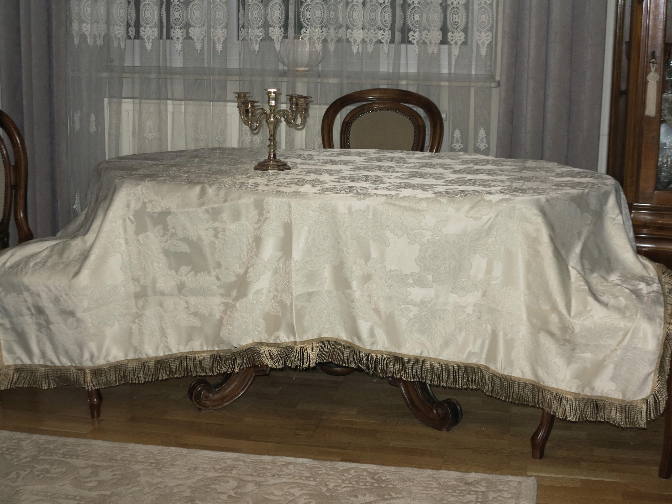 , у відмінному станіРозміри: 222/183cm + для 7cm fringes p> pucution of 7cm Надзвичайно красива стильна скатертина з тканинної тканини з візерунком великих троянд, в кольорі ecru. Скатертина має розміри: 222/183 см плюс приблизно на 7 см. Використовувана скатертина, у відмінному стані. Я рекомендую