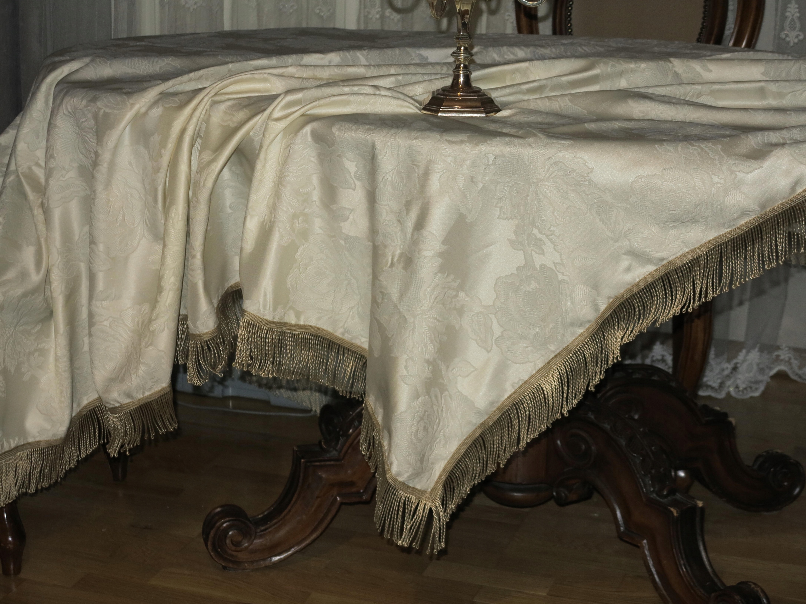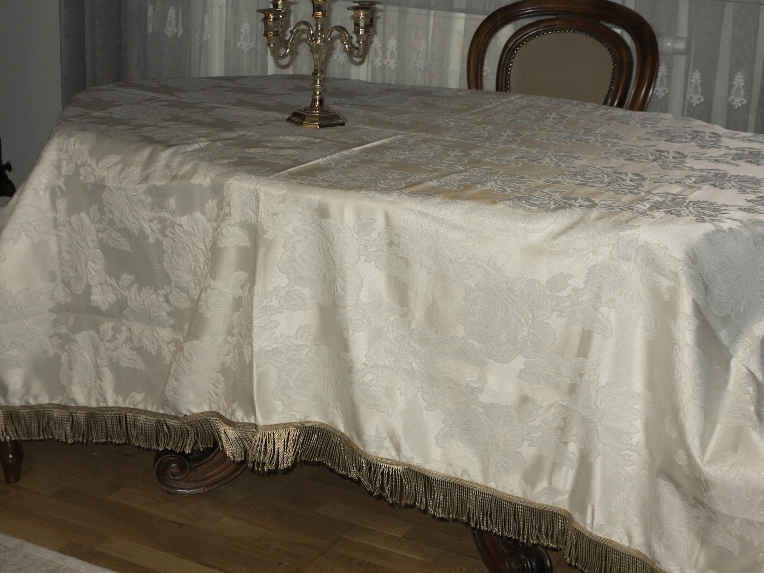 Чудова стильна скатерна Ecru, атласне фон, великі матові троянди, про довге золото балотне, прекрасне