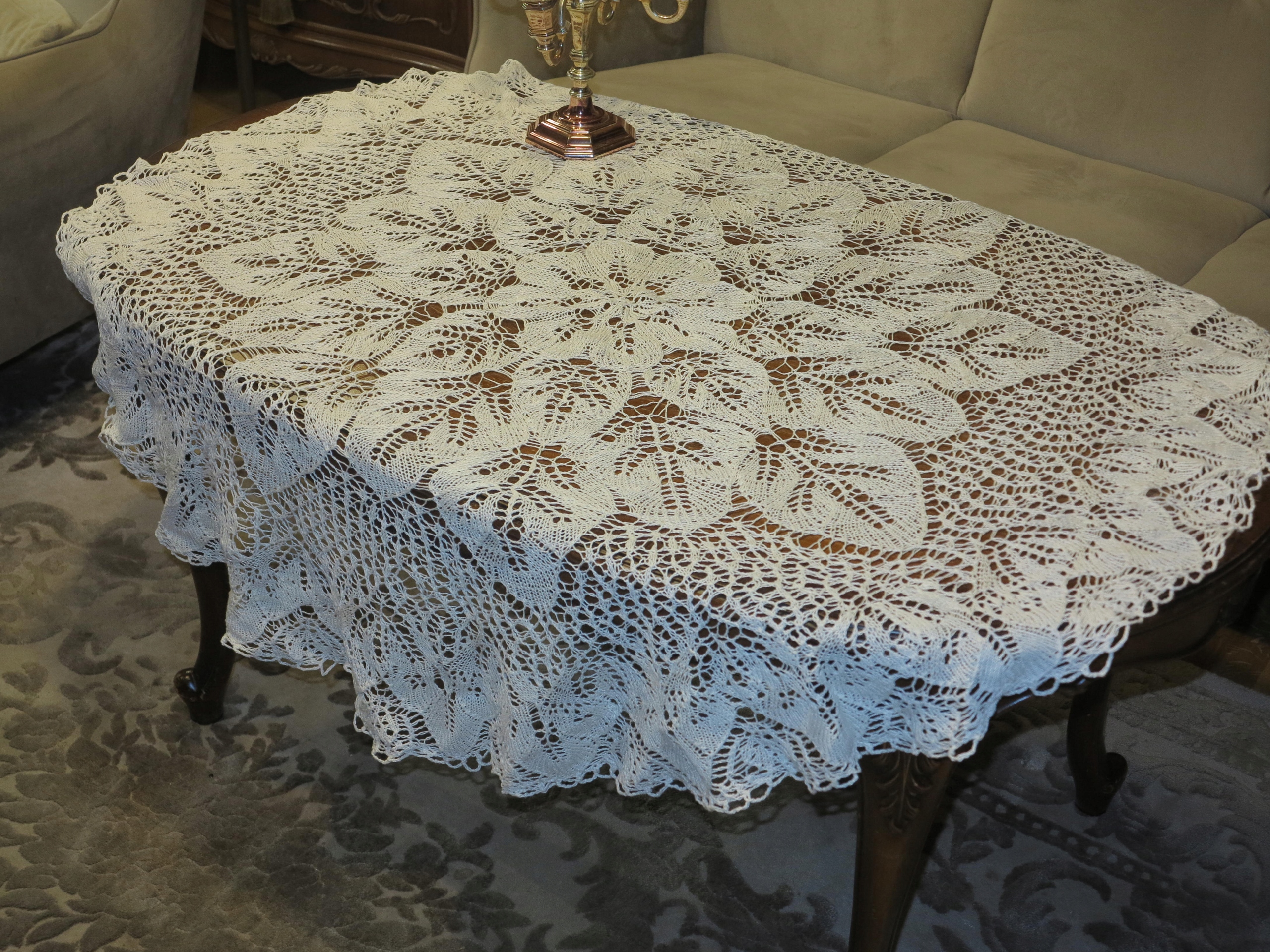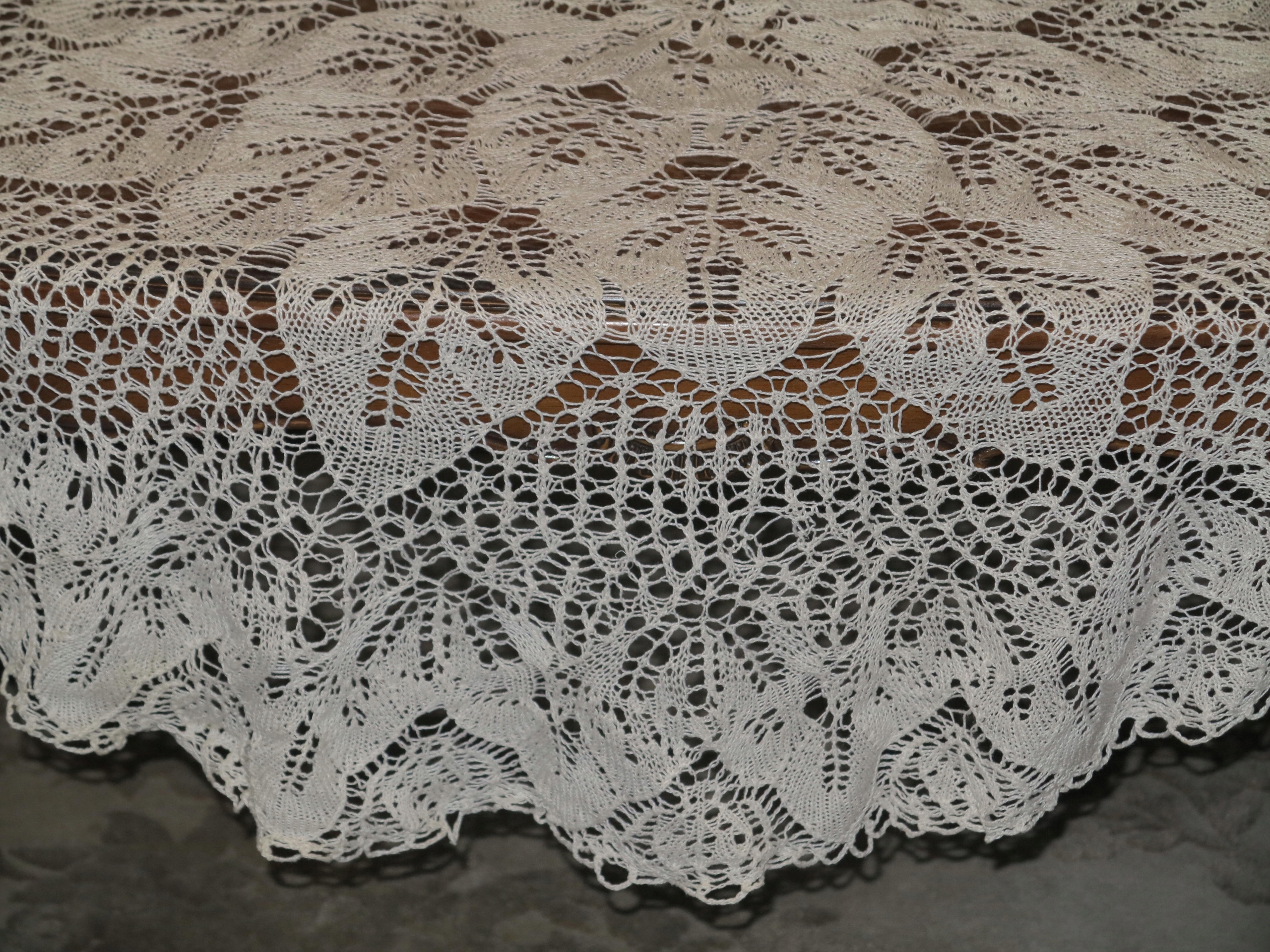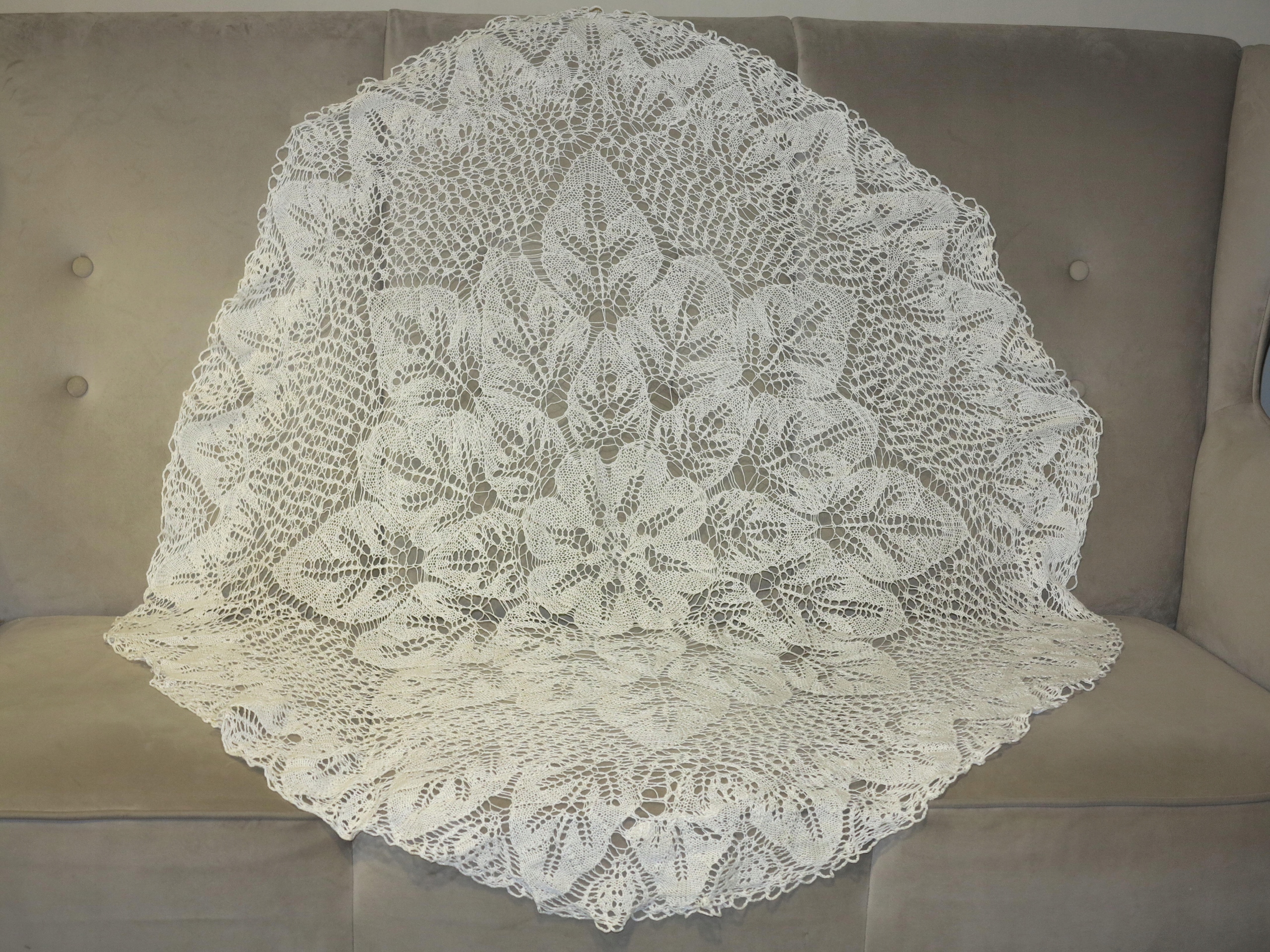 ЧУДОВУ ВЕЛИКУ СКАТЕРТИНУ, майстерно пов'язану вручну бавовняними нитками. КРЕМОВО-БІЛИЙ КОЛІР.