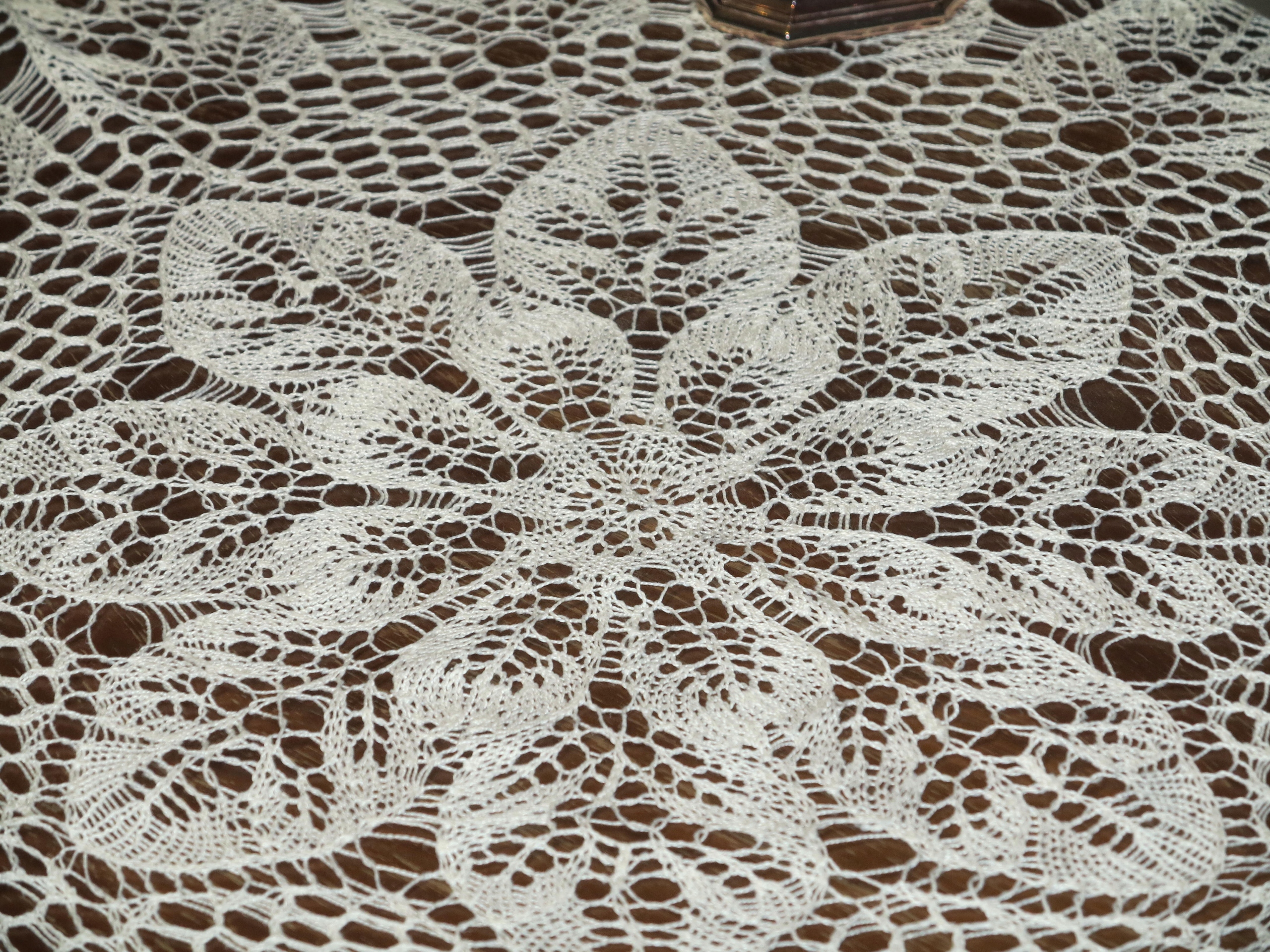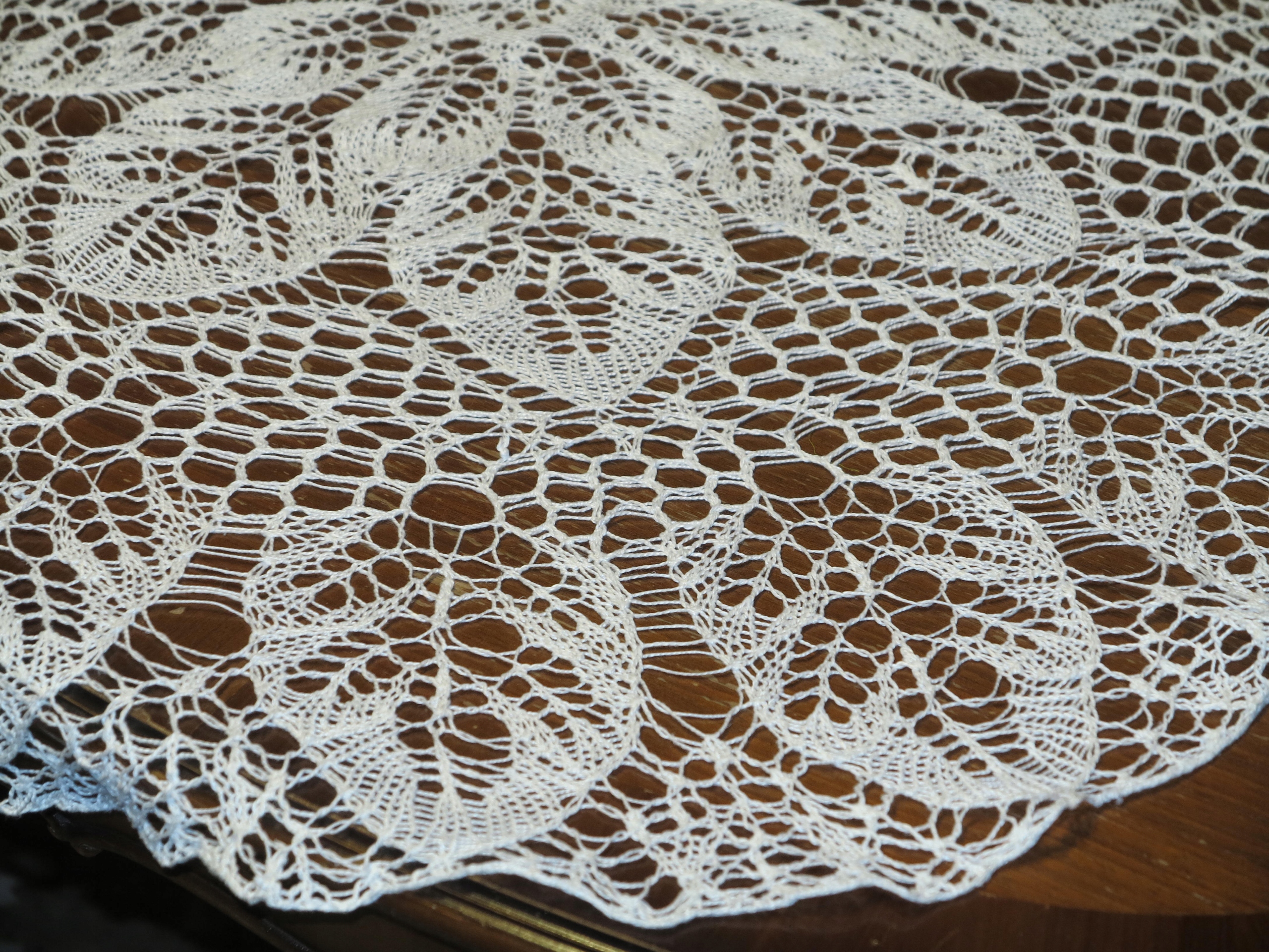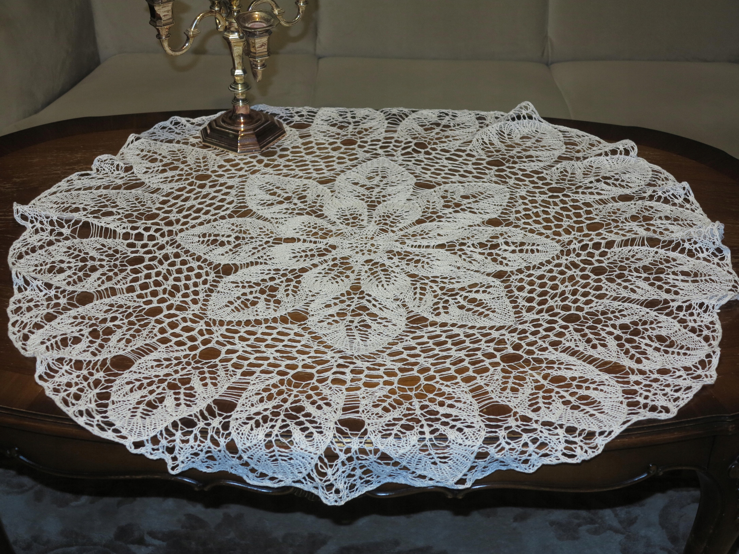 ГАРНУ БІЛУ СКАТЕРТИНУ-СЕРВЕТКУ, вишуканої ручної в'язки, з бавовняних ниток.