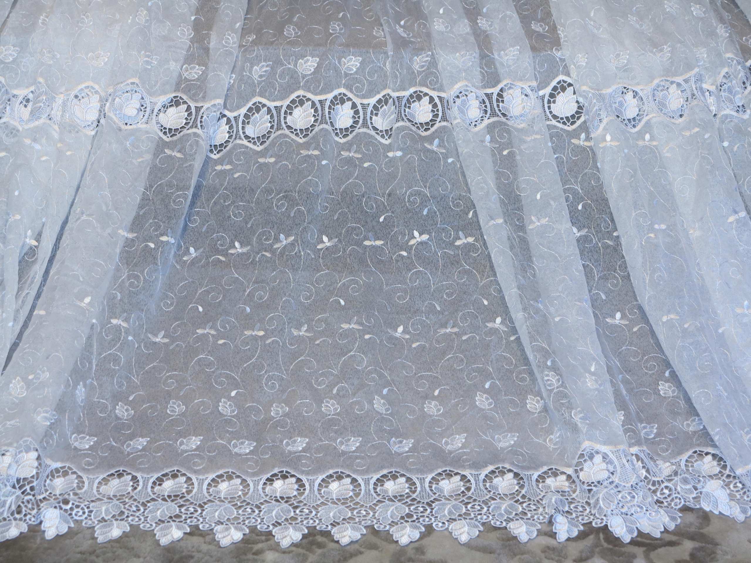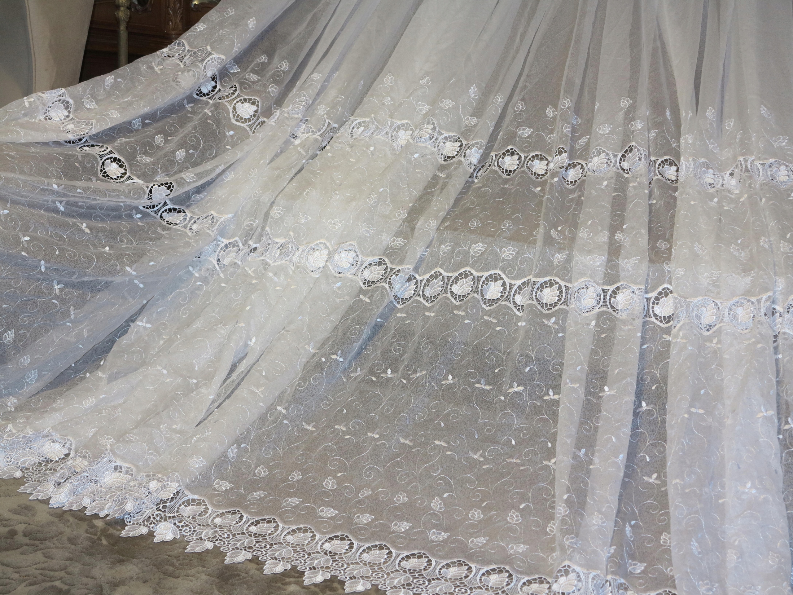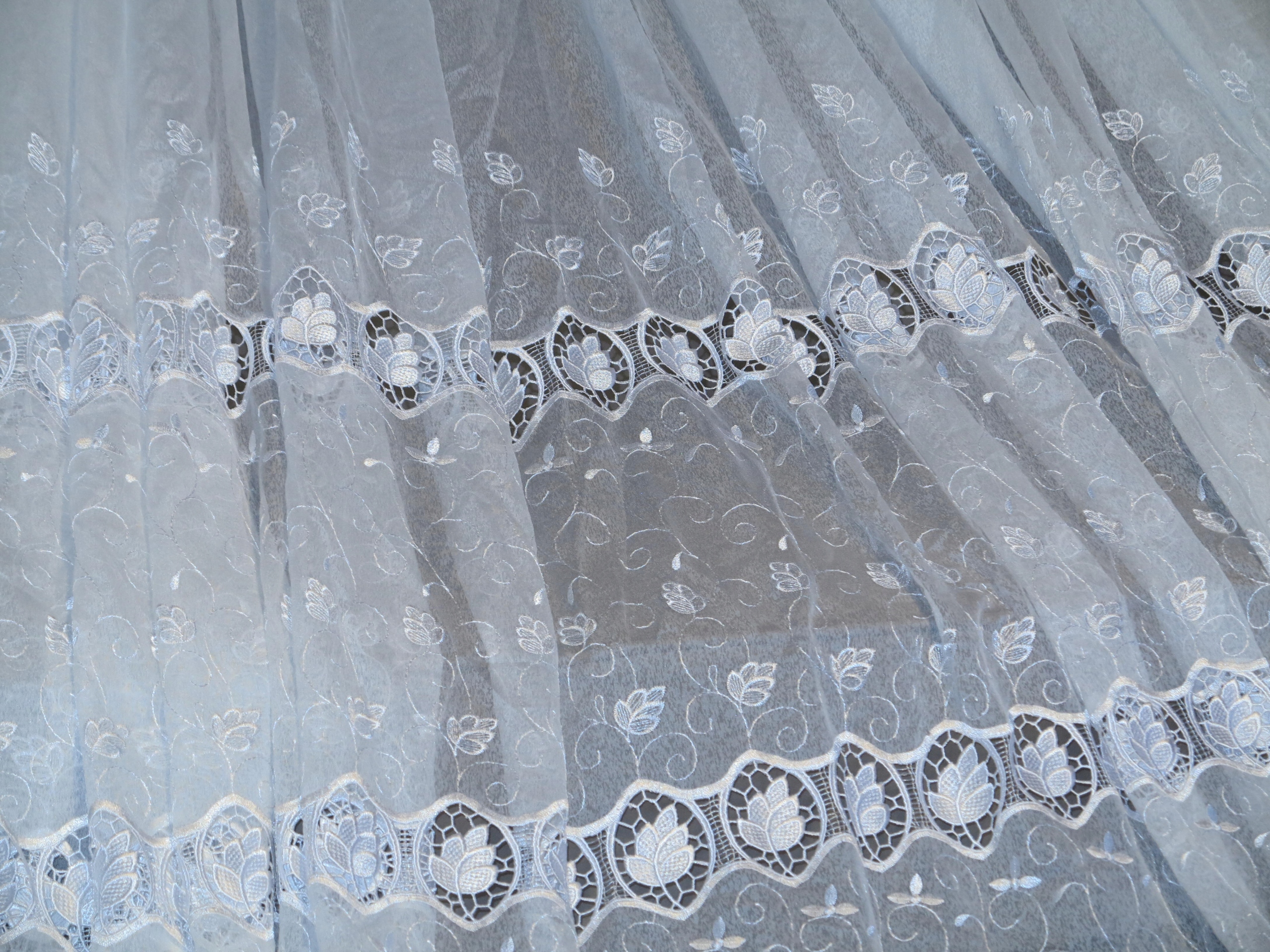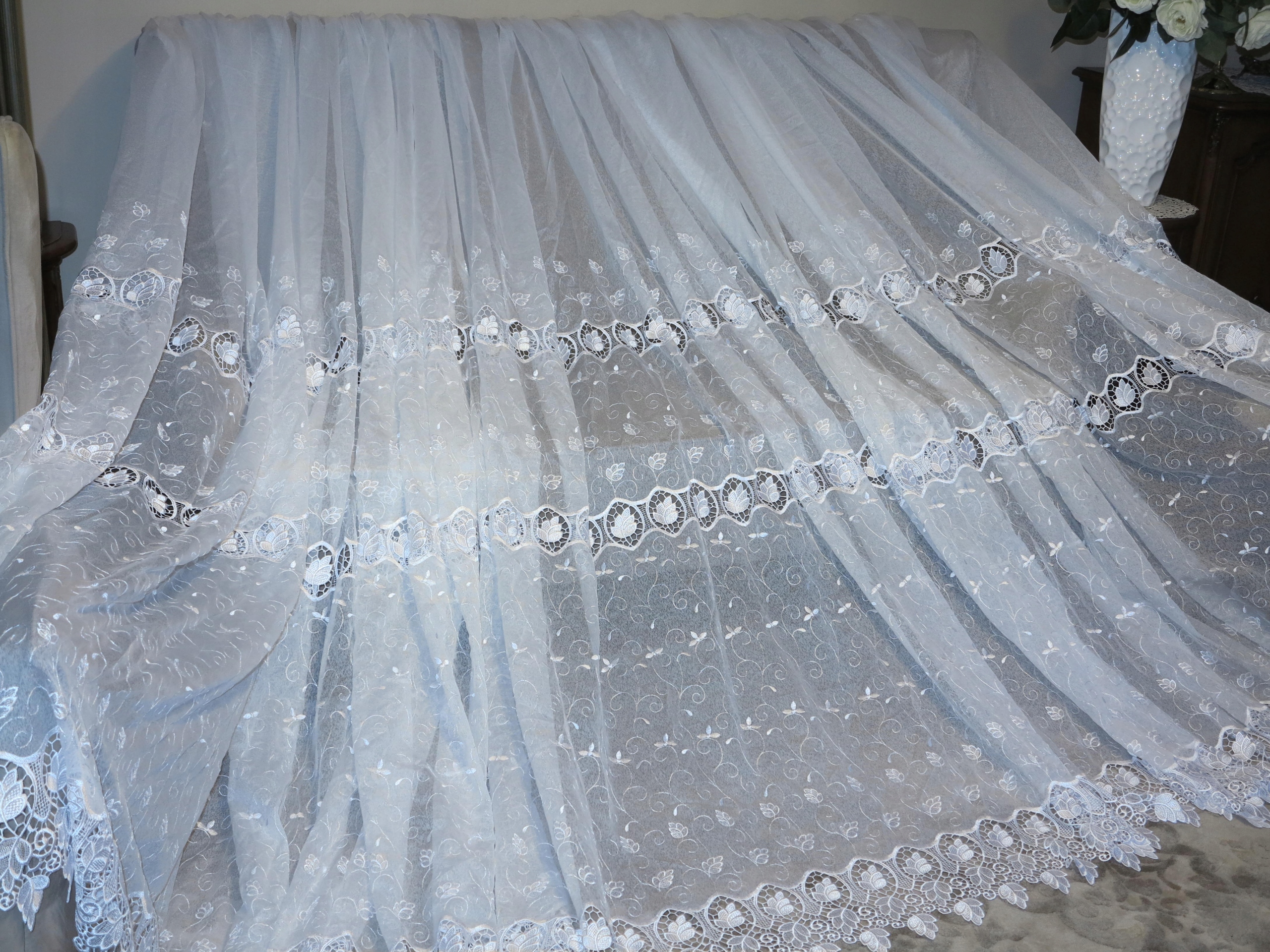 ЧУДОВУ ВЕЛИЧЕЗНУ БІЛУ ШТОРУ З НАСИТНИМ ПЕРЛОВИМ ГІПЮРОМ ТА ВИШИВКОЮ. ЦЕ ЧАСТИНА ВЕЛИКОЇ І ГАРНОЇ ШТОРИ. ТИП ШТОРИ - М'ЯКА РОЗМІЧАЛЬНА СТРІЧКА.