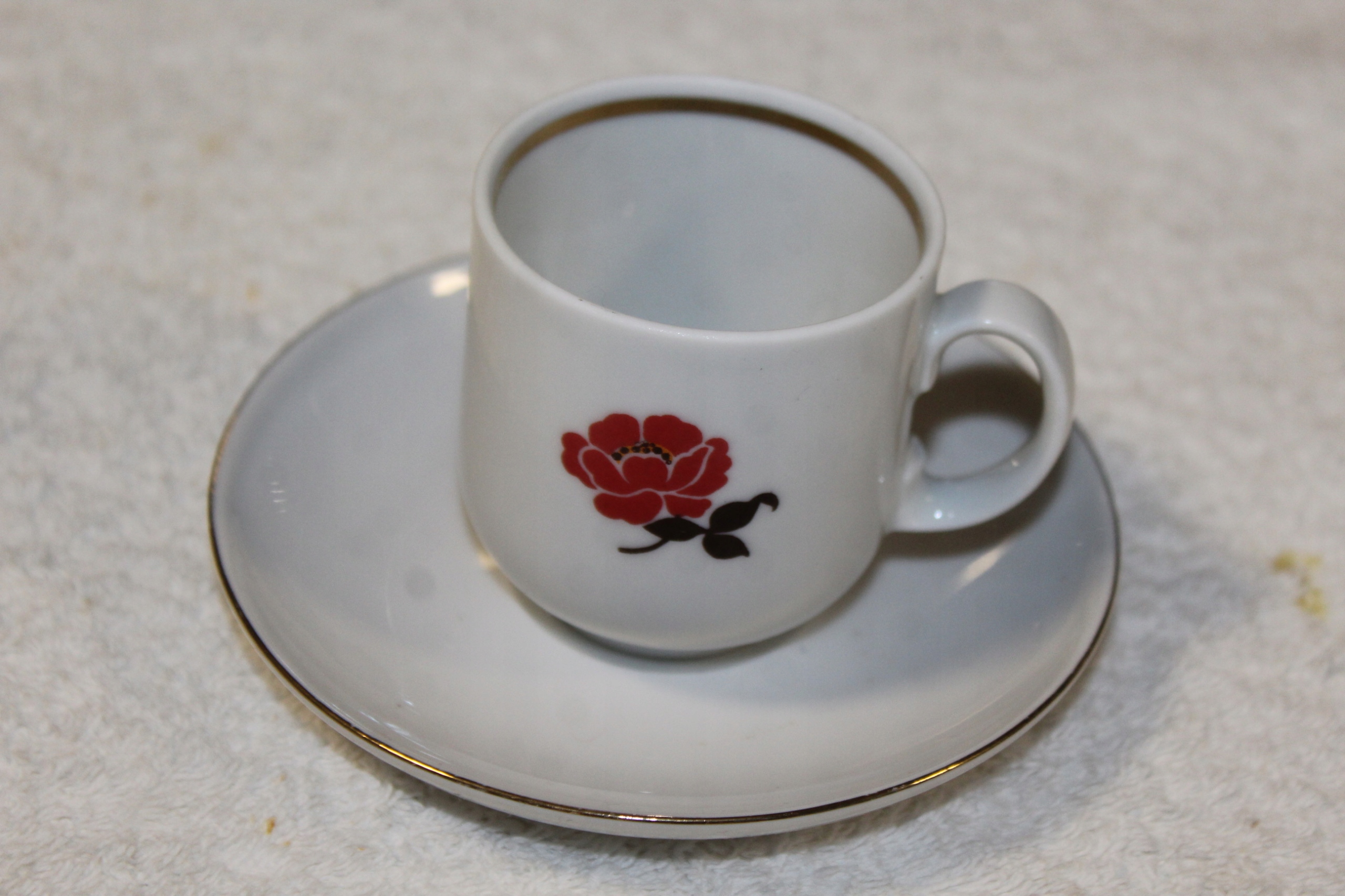 Прекрасна чашка з діаметром 5,5 см, висотою 6 см, діаметром тарілки 11 см, вагою 0,16 кг. Дуже хороший стан збережений, без пошкоджень.