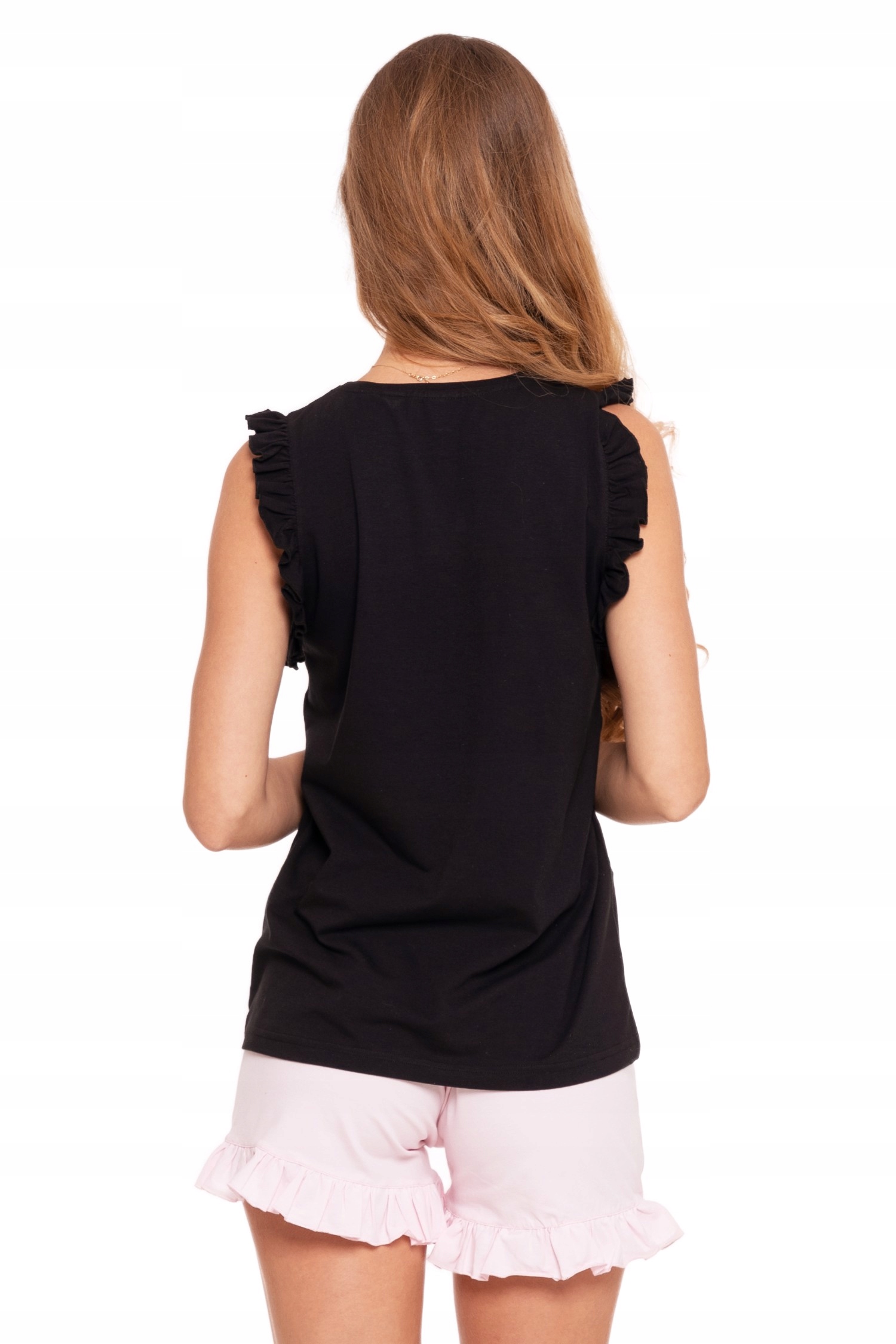 Чорна футболка — це класика, яка додає елегантності та незмінного шарму. Дизайн без рукавів робить цю піжаму ідеальною для теплих ночей. Ніжні волани додають витонченості всьому, підкреслюючи жіночі риси.