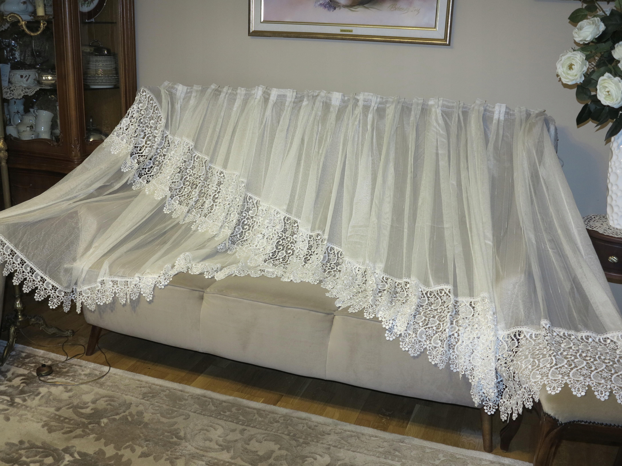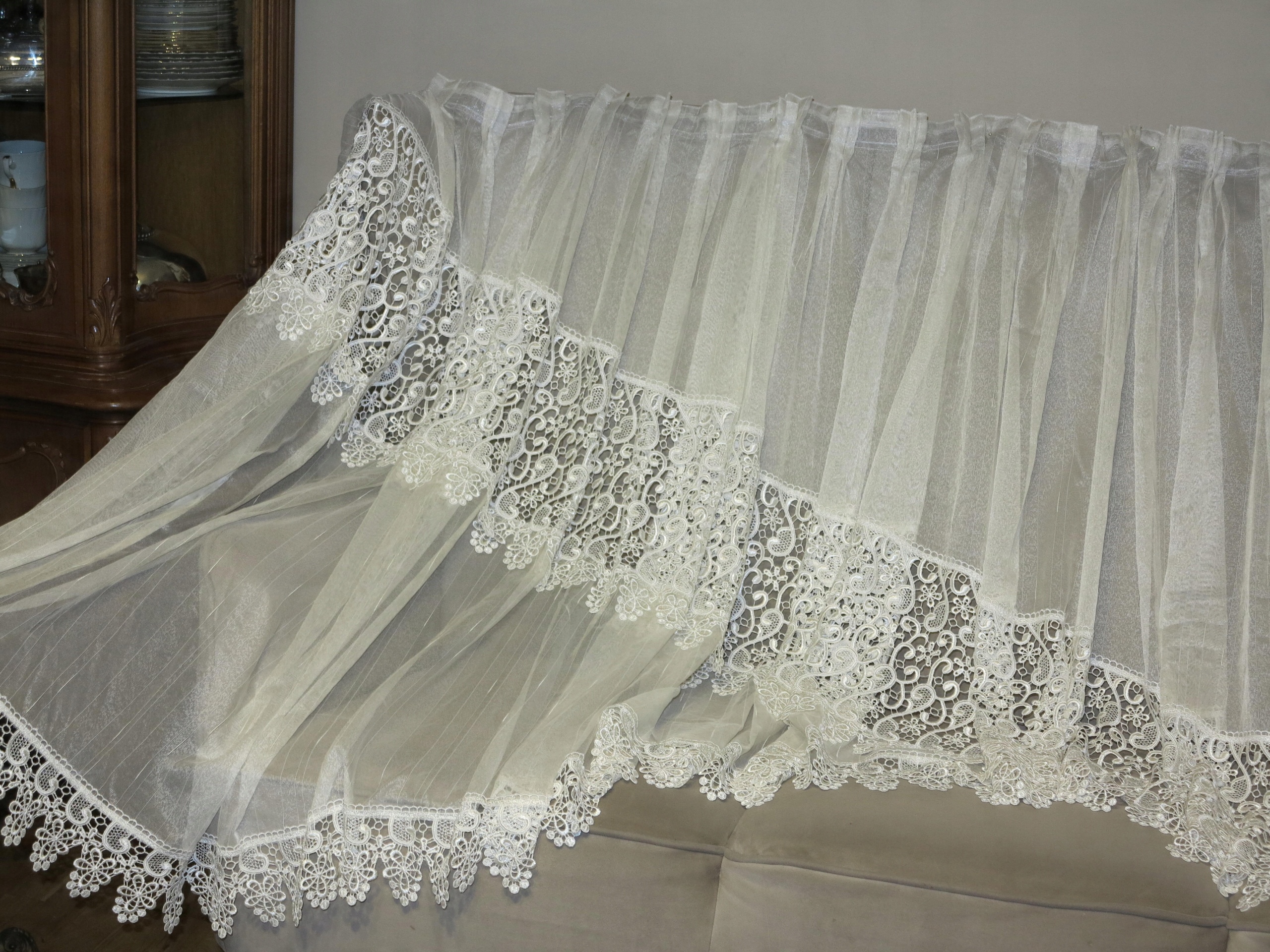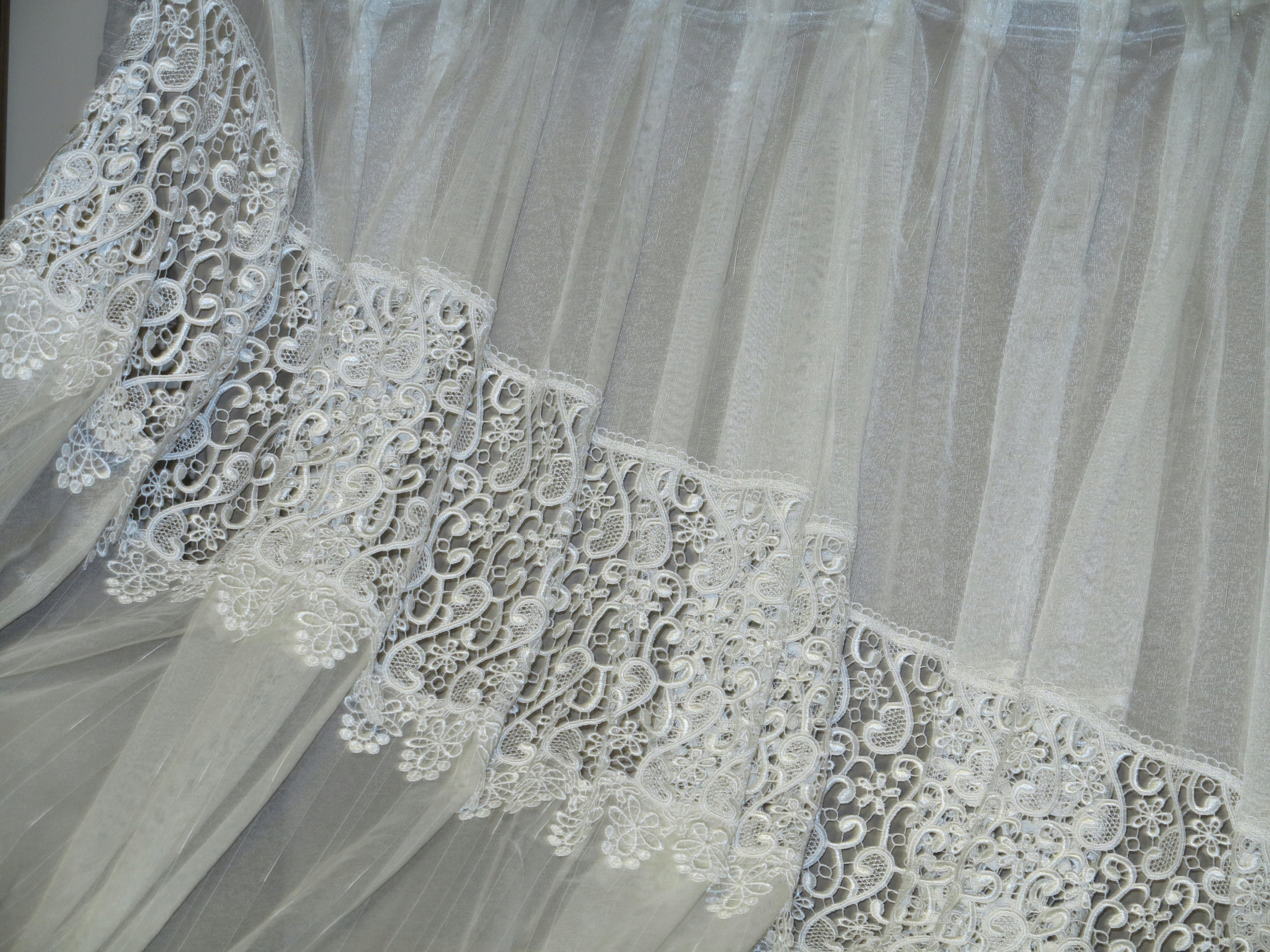 Чарівна завіса з декоративною, пришитною в гіпюрі, декоративно врізана в дугу. Колір ECRU