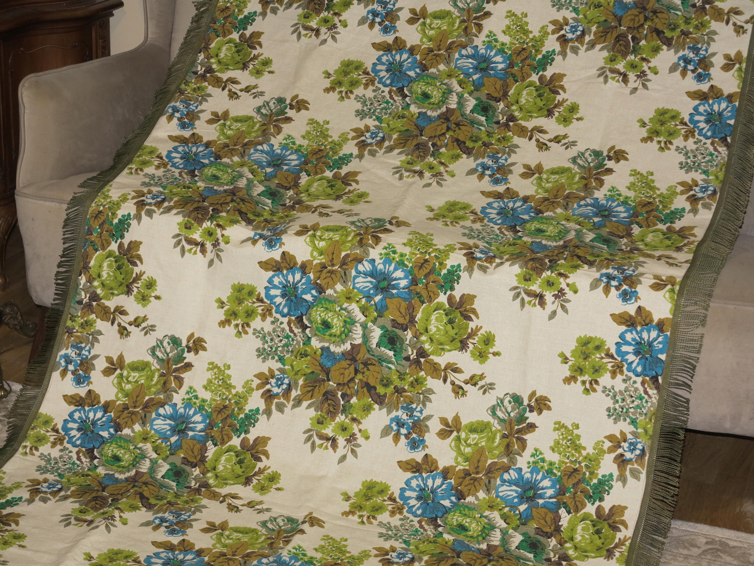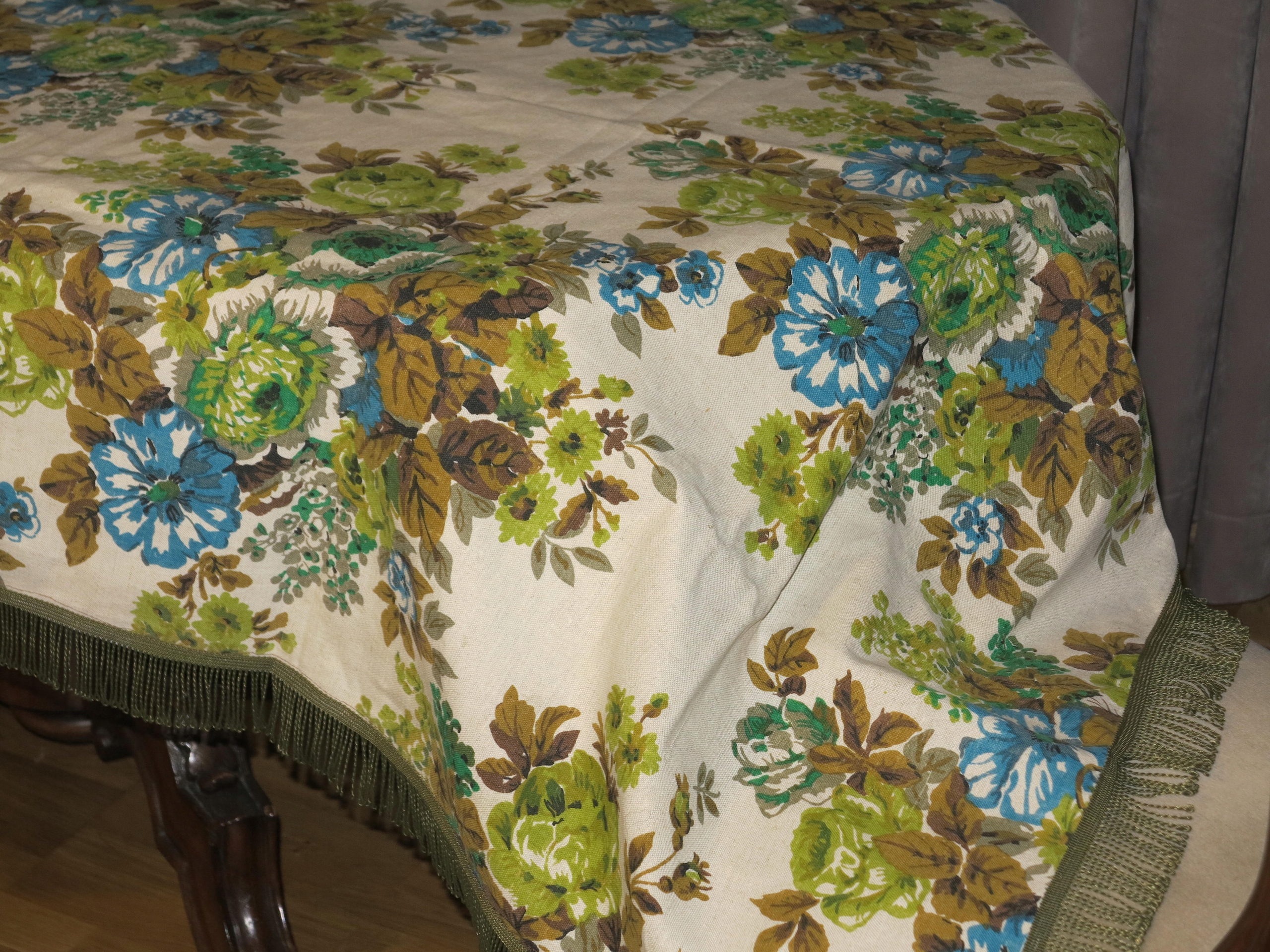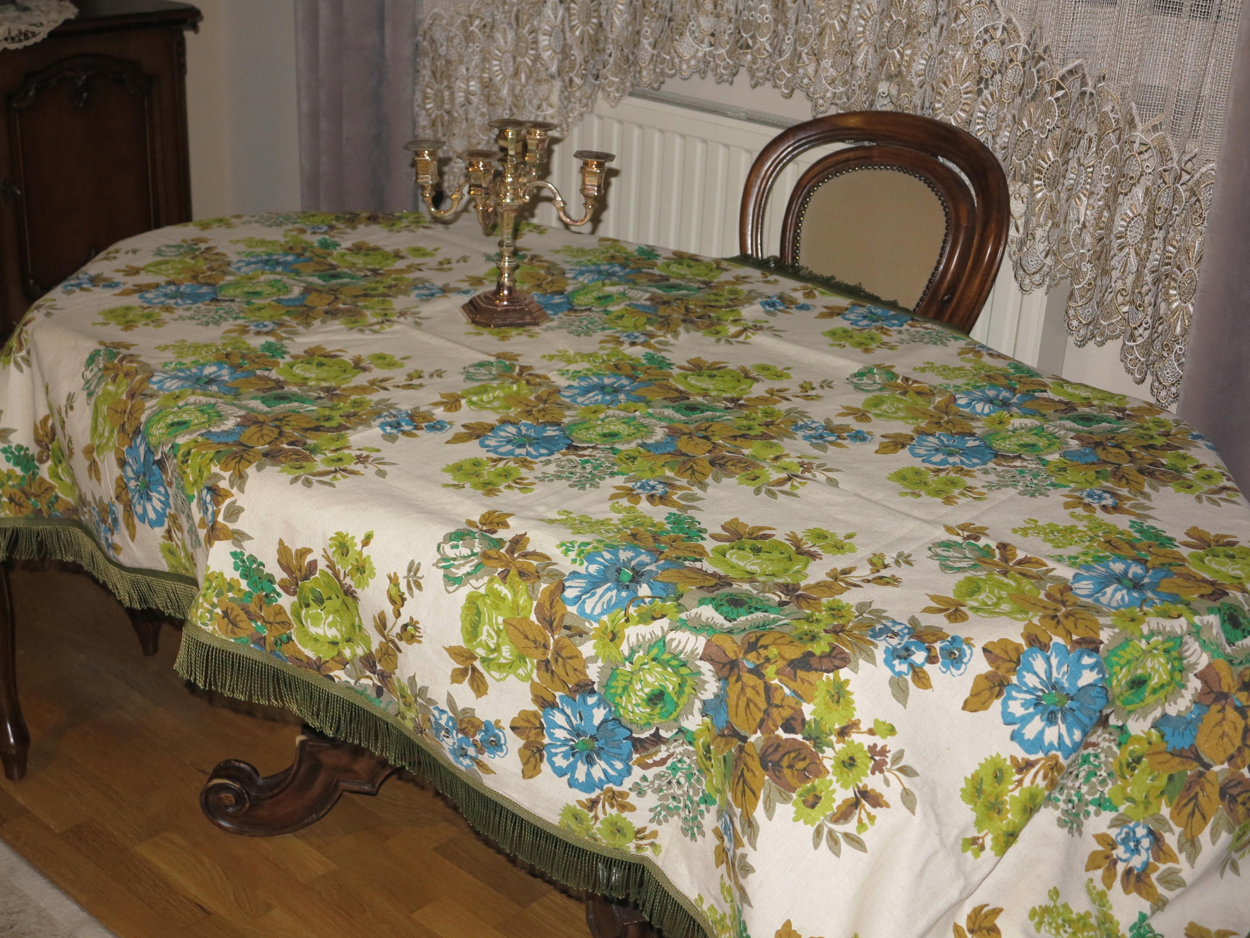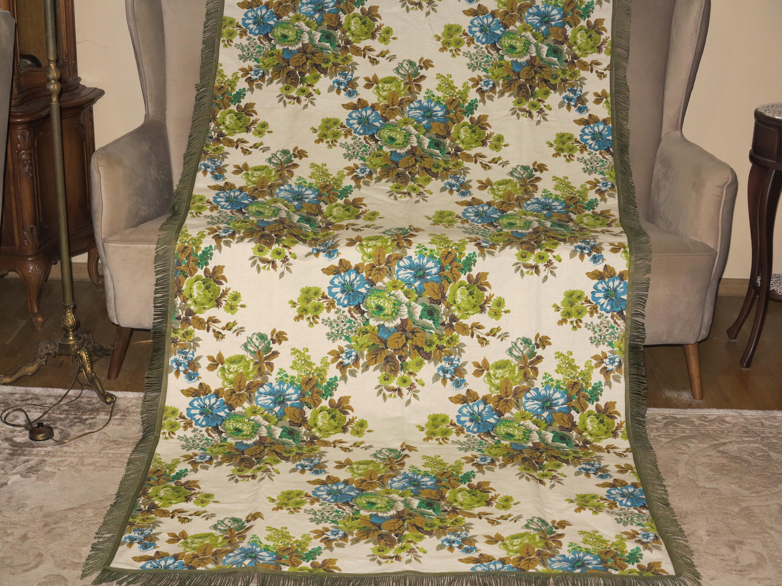 Предметом аукціону є виключно красива скатертина з чистого льону з букетами квітів. Скатертина має розміри: 229/123 см плюс бахрома. Скатертина б/в, у відмінному стані. Рекомендую.