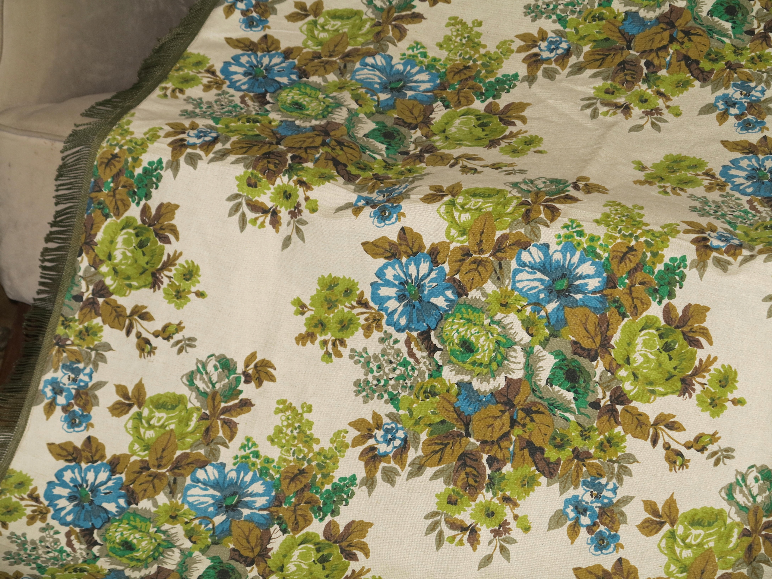 НАДЗВИЧАЙНУ КРАСИВУ СУЦІЛЬНУ СКАТЕРТИНУ З ЧИСТОГО ЛЛЯНУ З ВЕЛИКИМИ БУКЕТАМИ КВІТІВ, ПРИКРАШЕНУ БАХОМРОЮ НАВКОЛ. ЩІЛЬНА ТА ДУЖЕ МІЦНА БІЛИЗНА