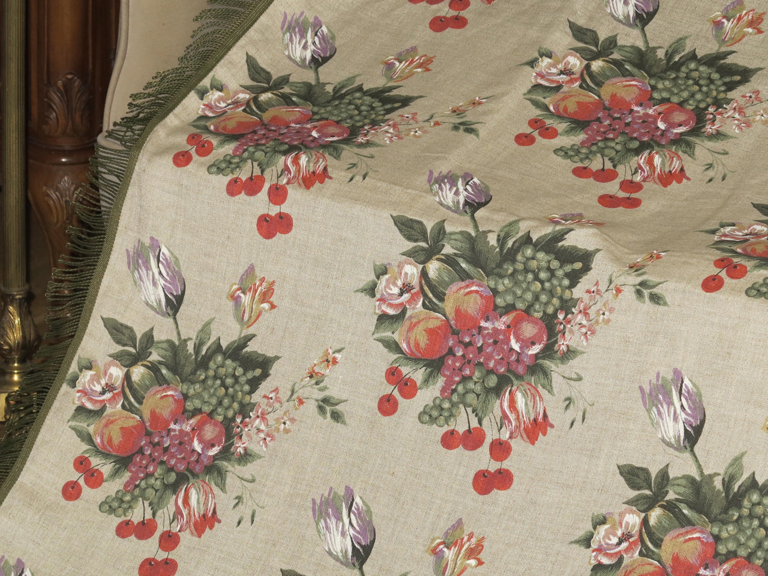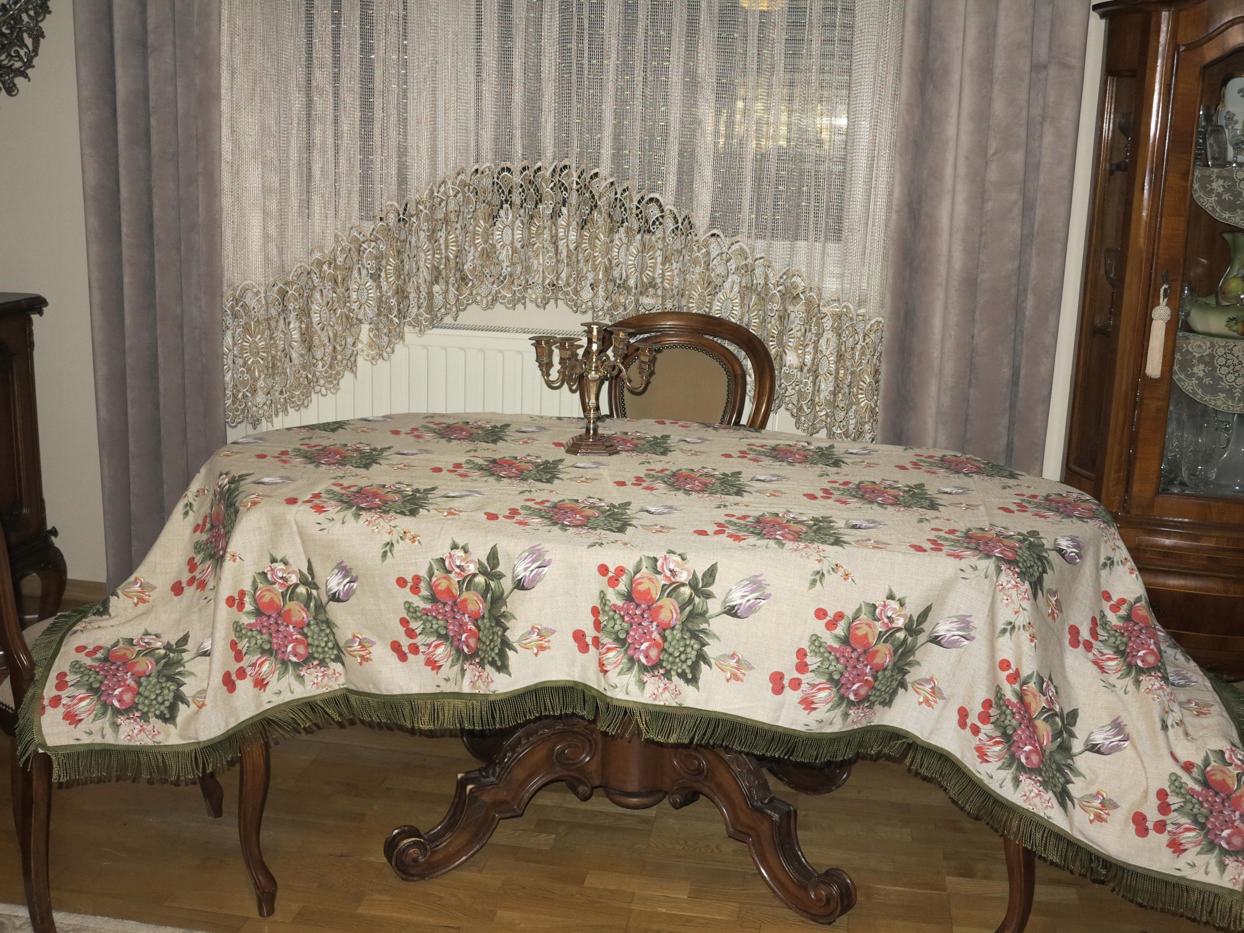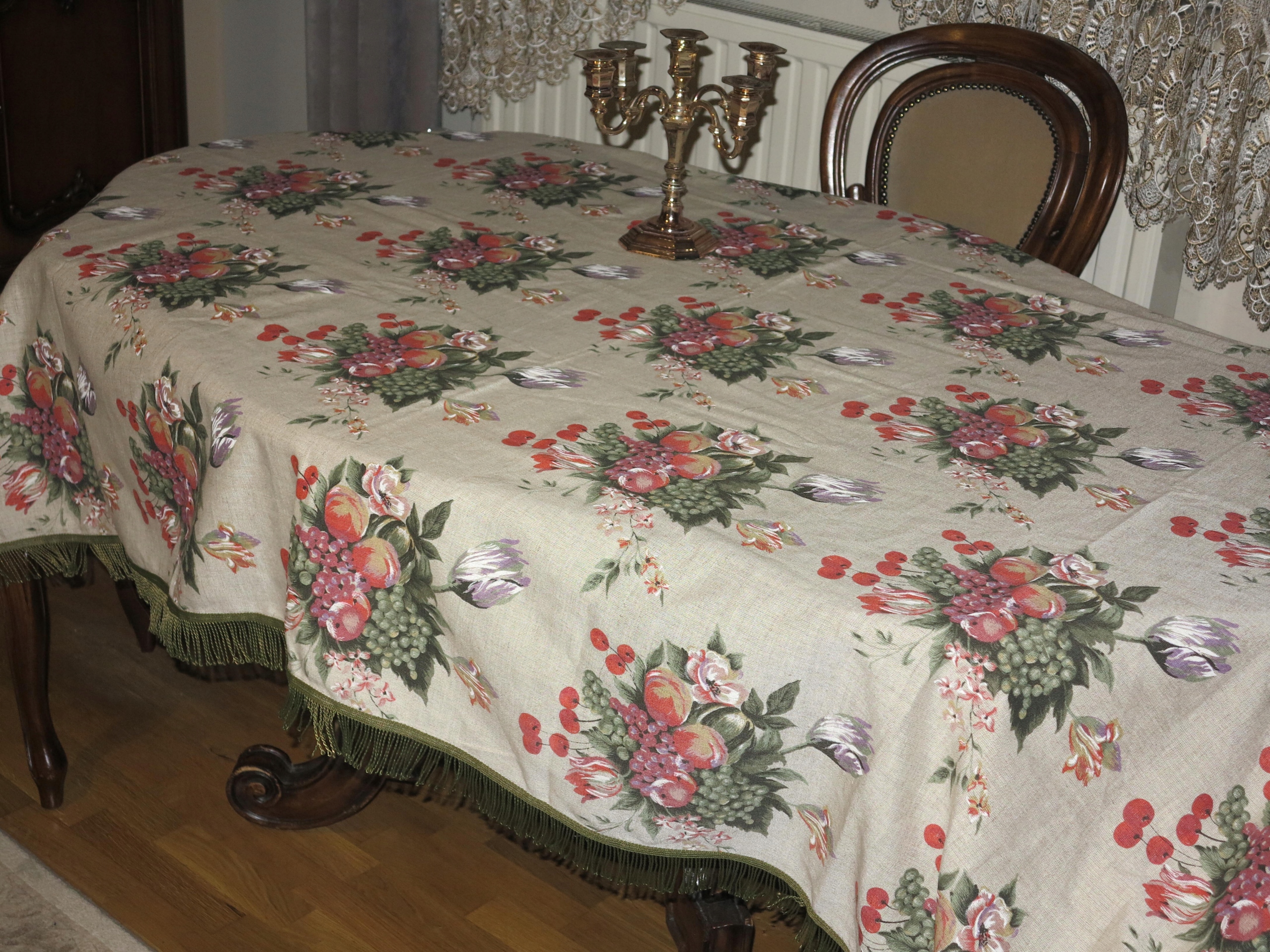 Предметом аукціону є виключно красива скатертина з чистого льону з букетами квітів та фруктів. Скатертина має розміри: 225/145 см плюс бахрома. Скатертина б/в, у відмінному стані. Рекомендую.
