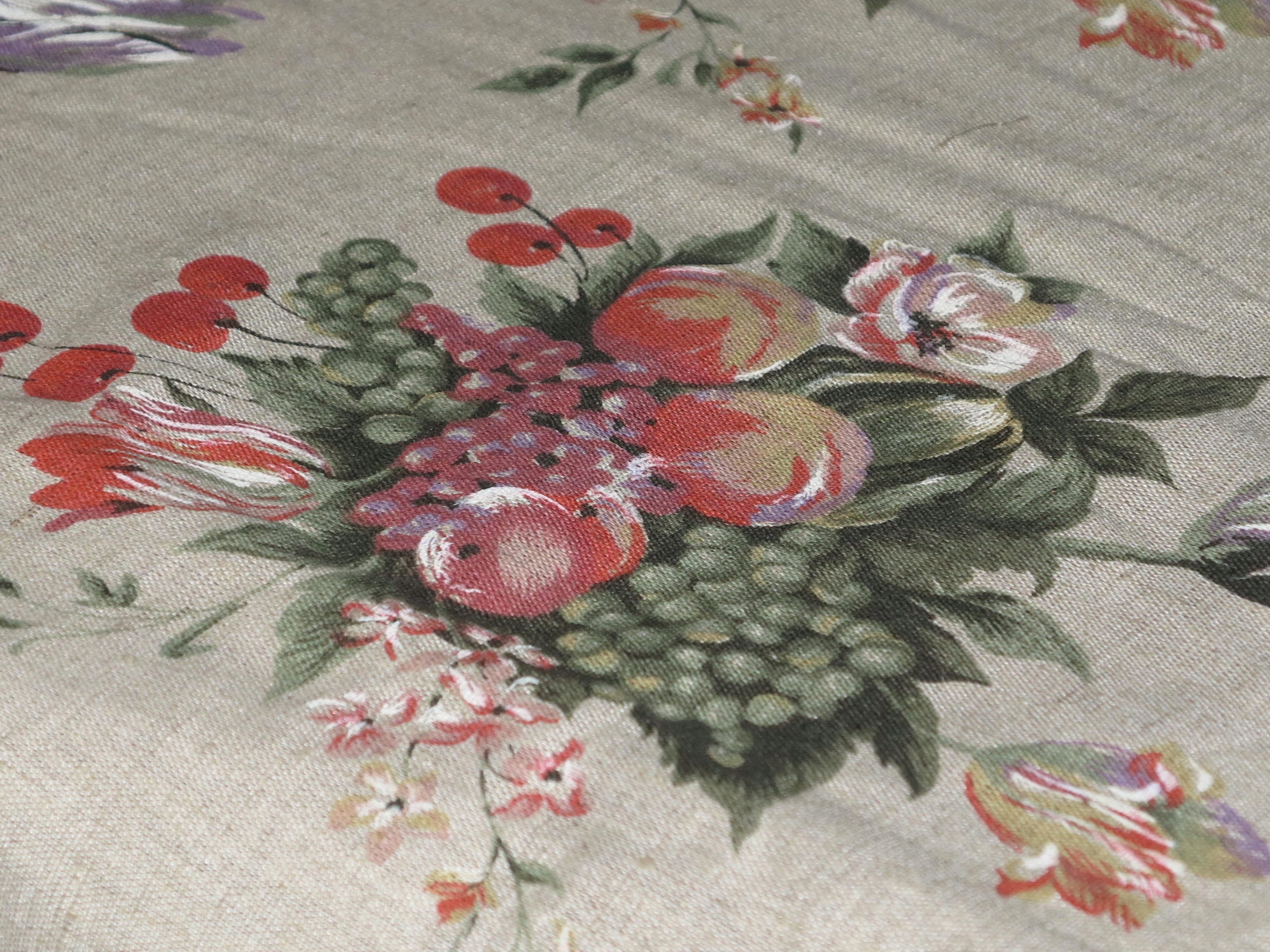 НАДЗВИЧАЙНУ КРАСИВУ СУЦІЛЬНУ СКАТЕРТИНУ З ЧИСТОГО ЛЬОНУ З КВІТОВИМИ ТА ФРУКТОВИМИ БУКЕТАМИ (ВИНОГРАД, ВИШНЯ, СЛИВА), ПРИКРАШЕНУ БАХОМРОЮ. ЩІЛЬНА ТА ДУЖЕ МІЦНА БІЛИЗНА