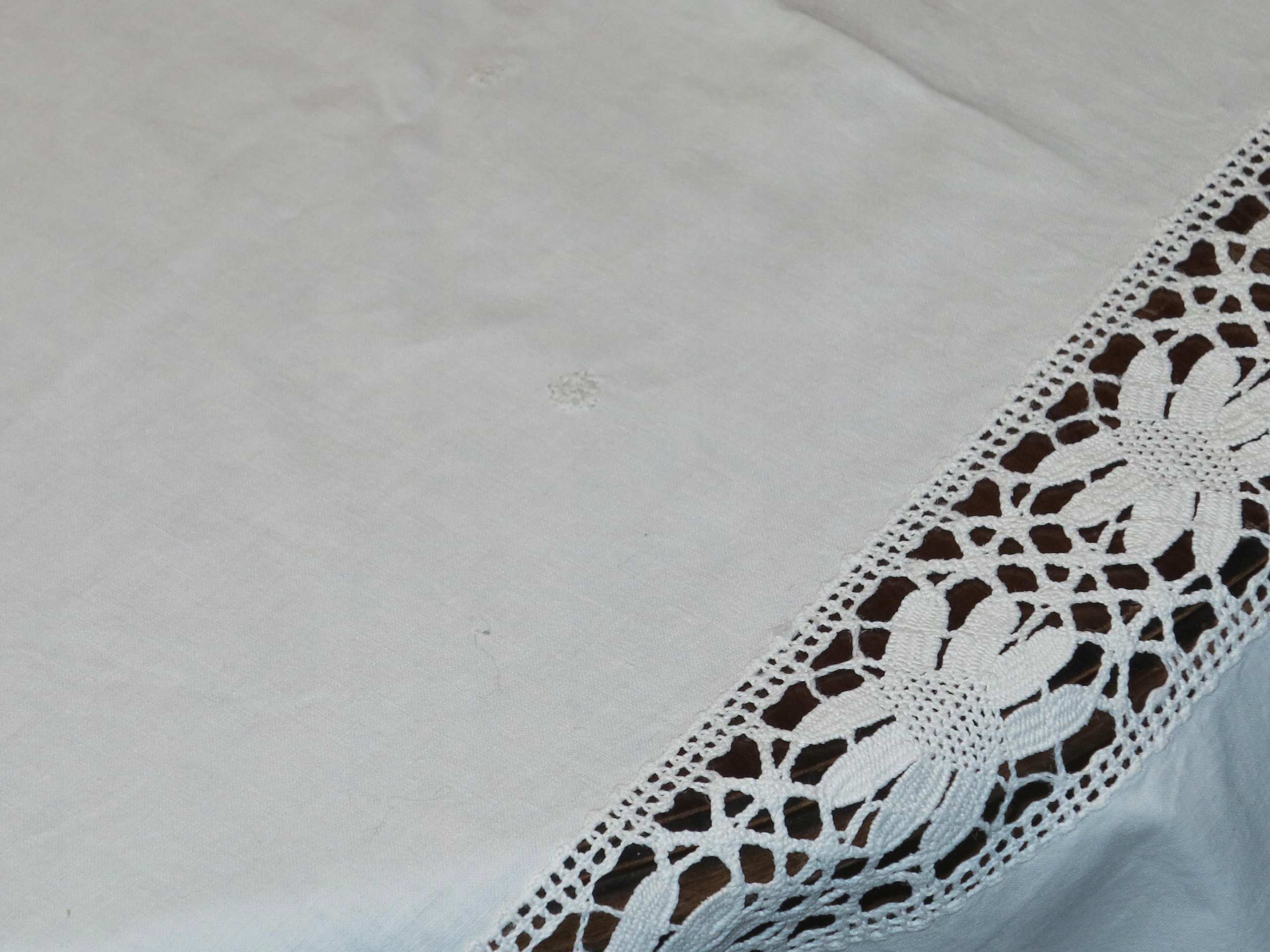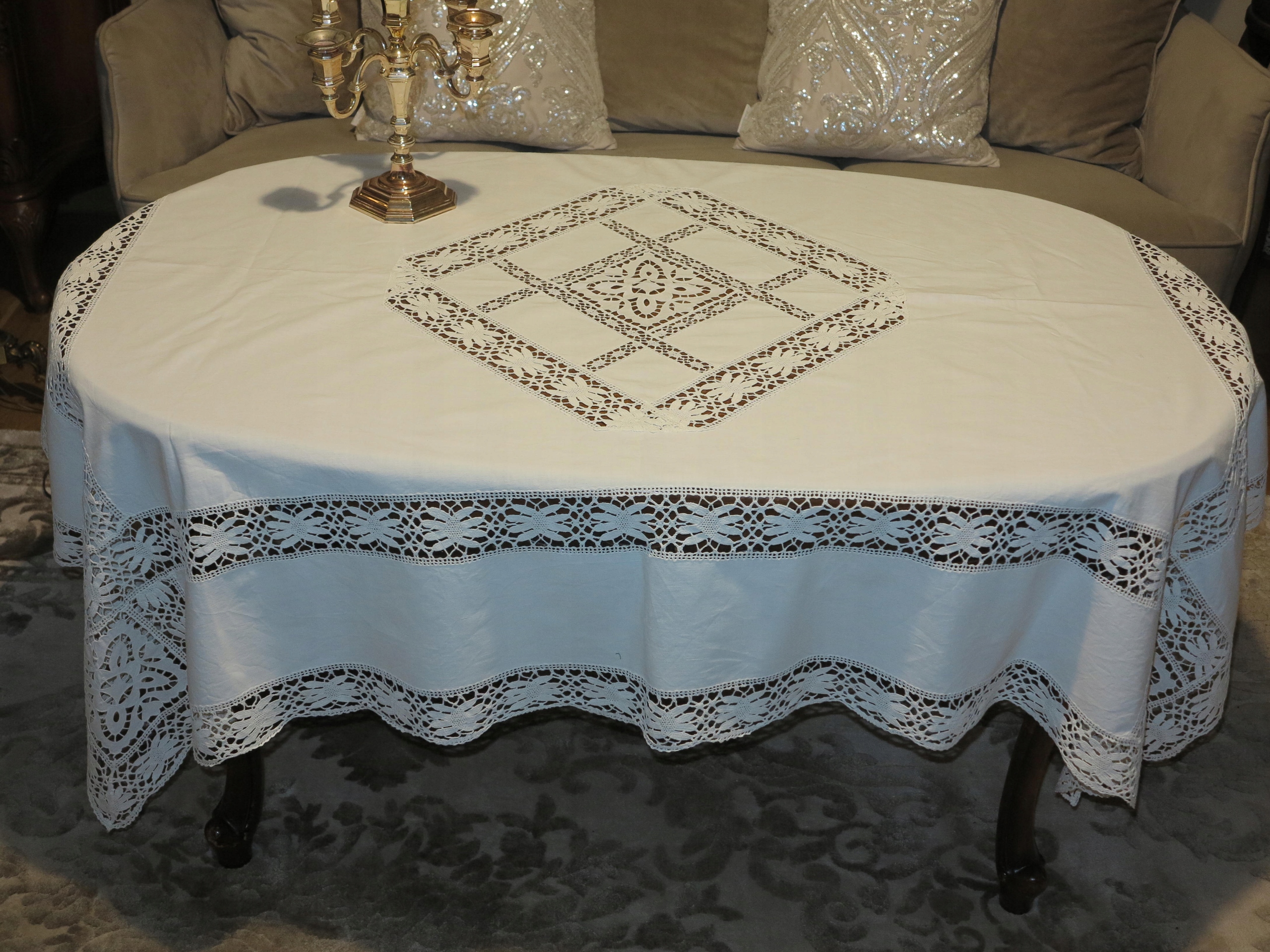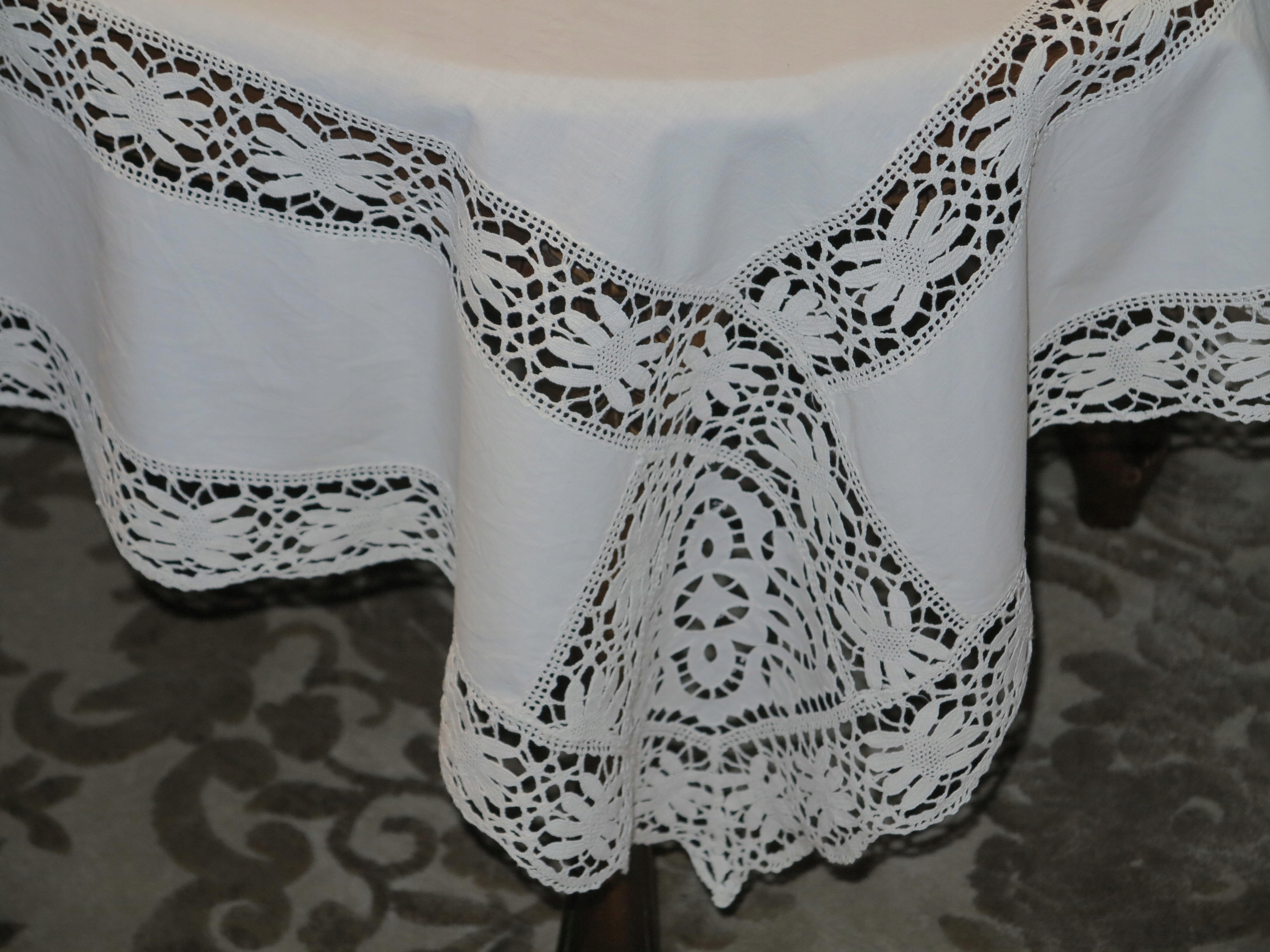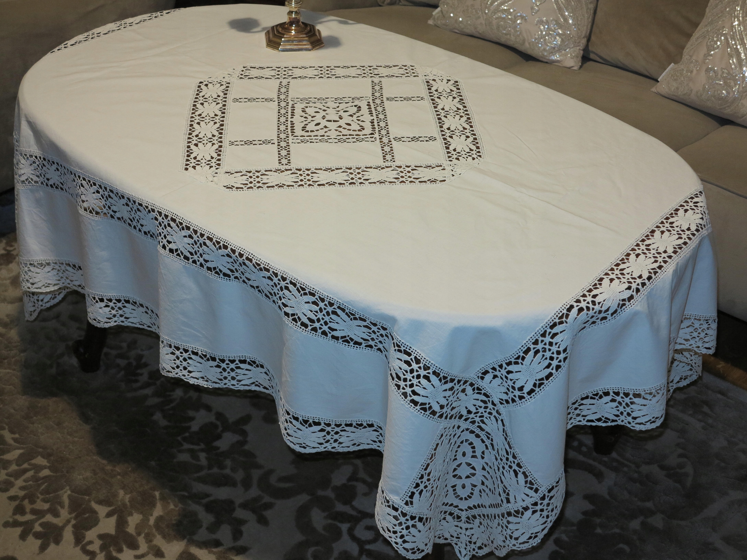 Предметом аукціону є надзвичайно красива скатертина, з великою кількістю коклюшного мережива та вишитими квадратами по кутах скатертини. Має розміри: 173/135 см. Скатертина б/у, але в дуже хорошому стані та якості, з невеликим недоліком, описаним вище.. Рекомендую