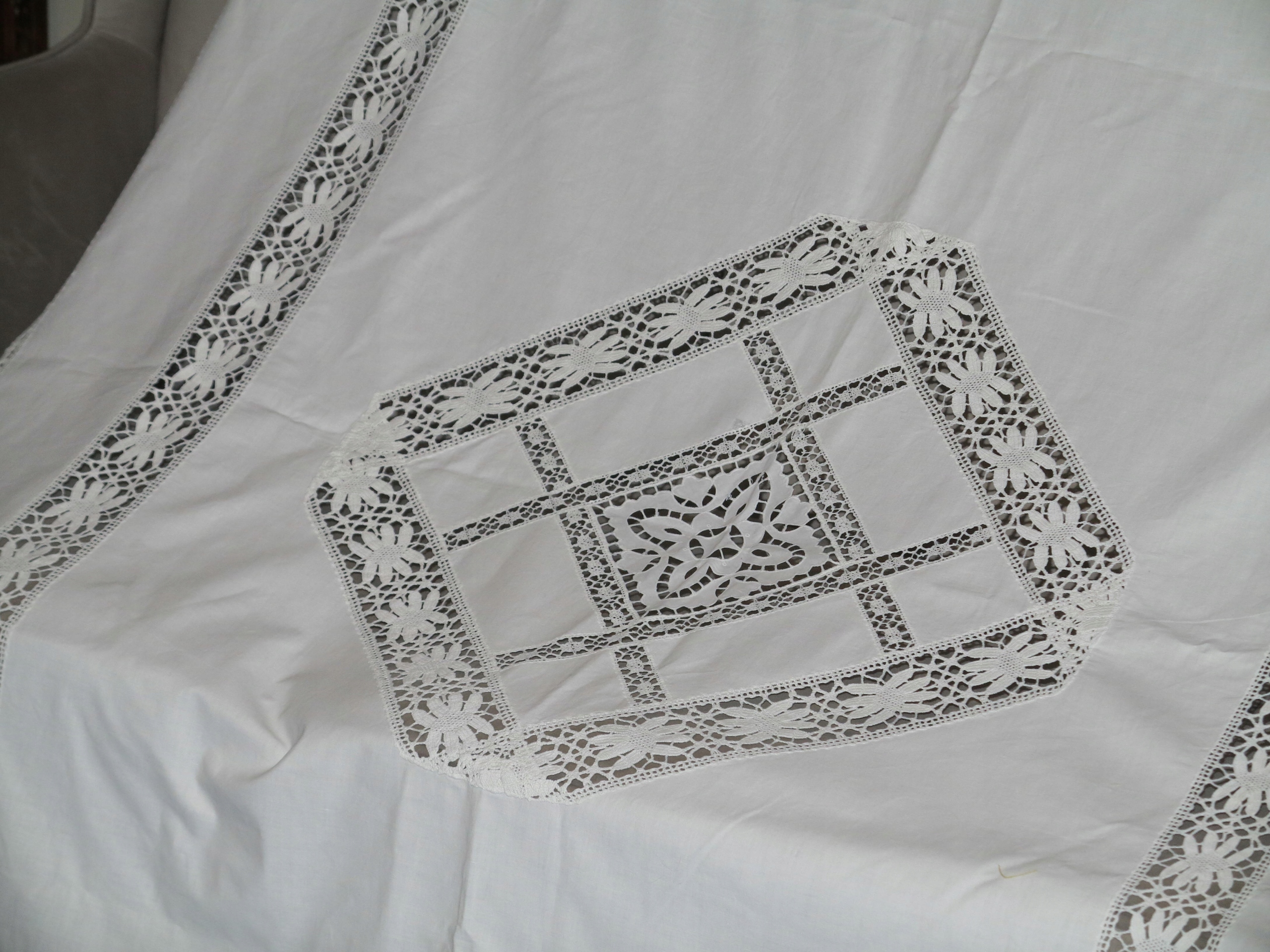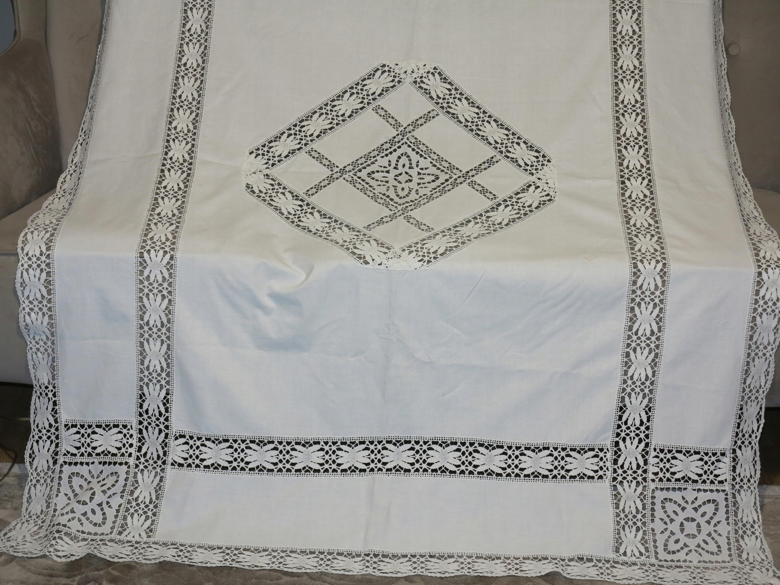 ВИНЯТКОВУ ГАРНУ БІЛУ БАВОВНЯНУ СКАТЕРТИНУ З БАГАТО ЦЕГЛЕНОГО МЕРЕЖИВА, КУТИ З ГАРНИМИ ВИШИТИМИ КВАДРАТАМИ