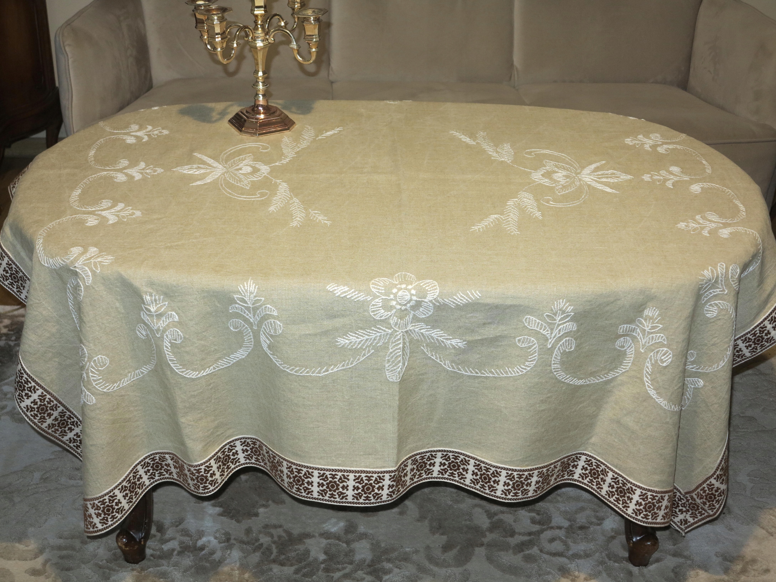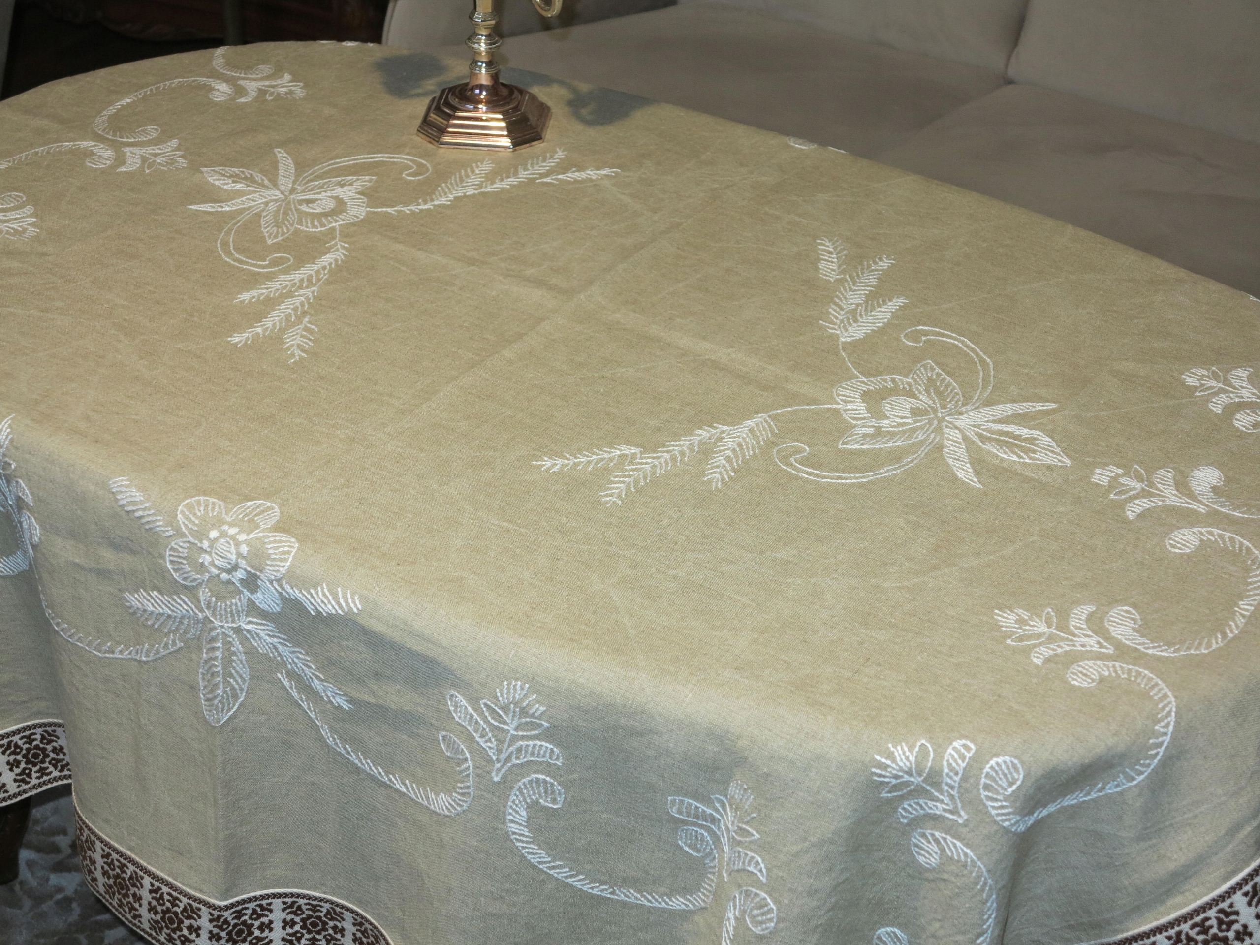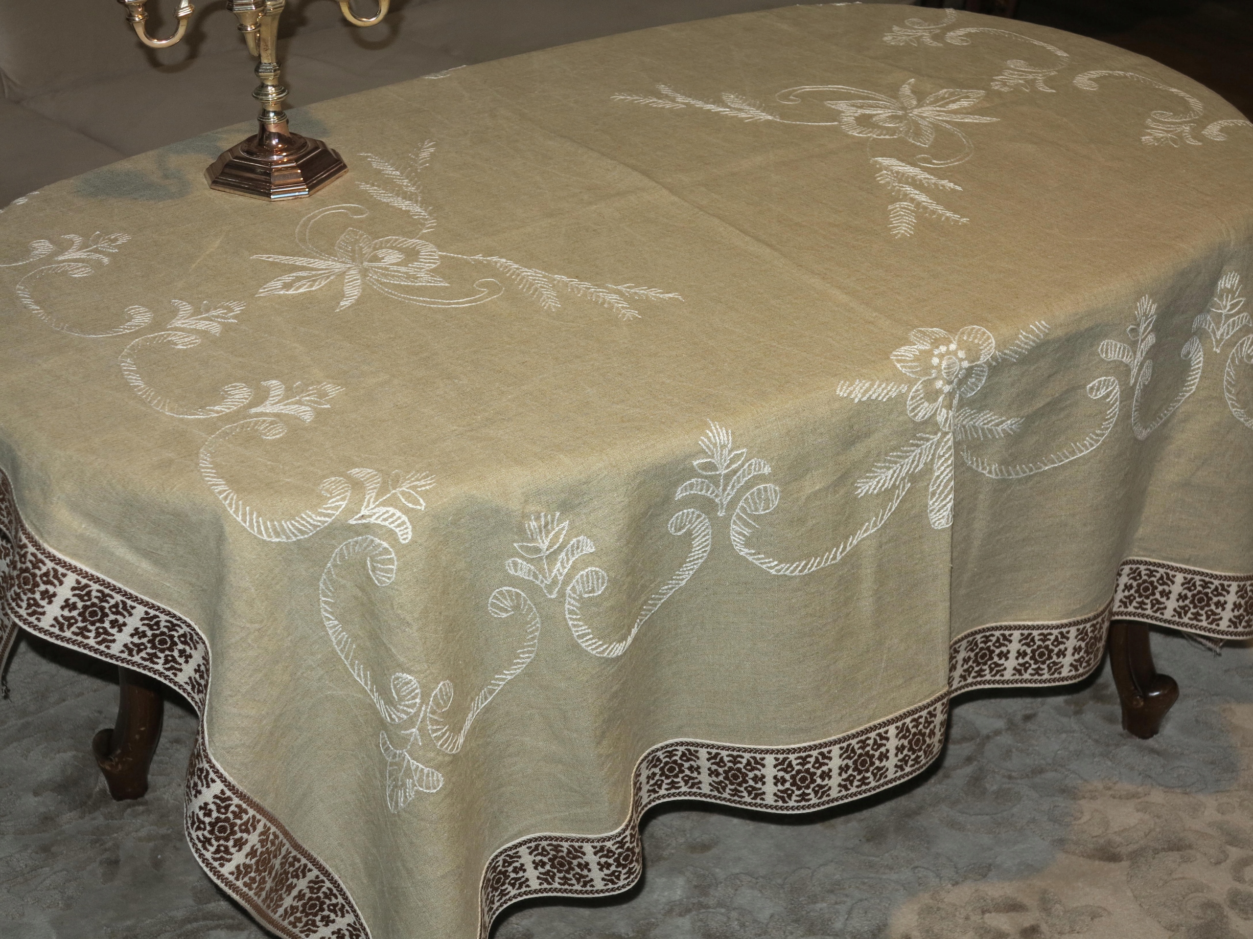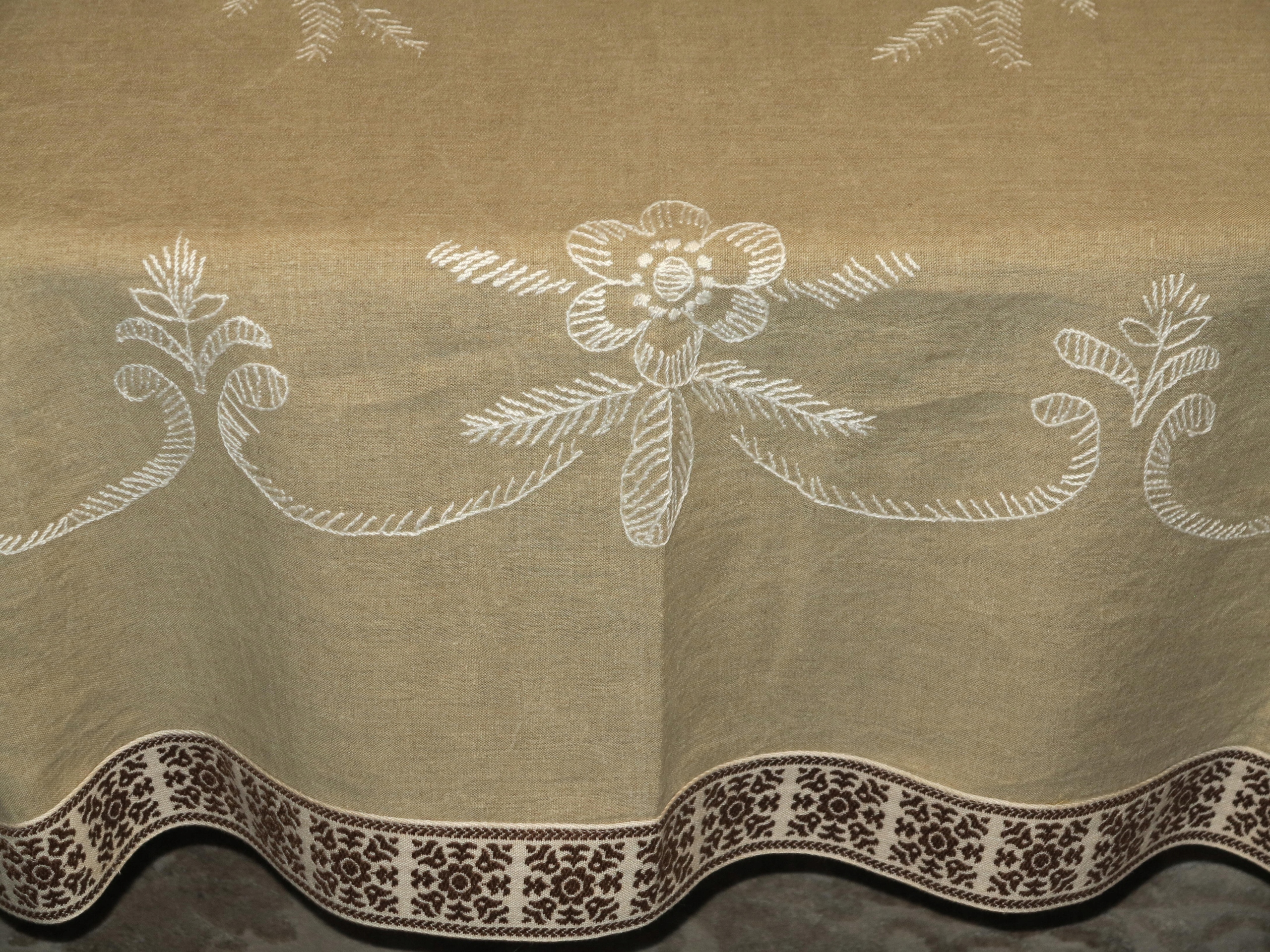 ЧУДОВУ СТОЛІТНЮ СКАТЕРТИНУ ЩІЛЬНУ ЛЬОНУ З РУЧНОЮ ВИШИВКОЮ БІЛОГО КОЛЬОРУ. ПРИБЛИЗНО ШИРОКОГО ДЕКОРАТИВНОГО НАРОДНОГО ОБРОБКИ.