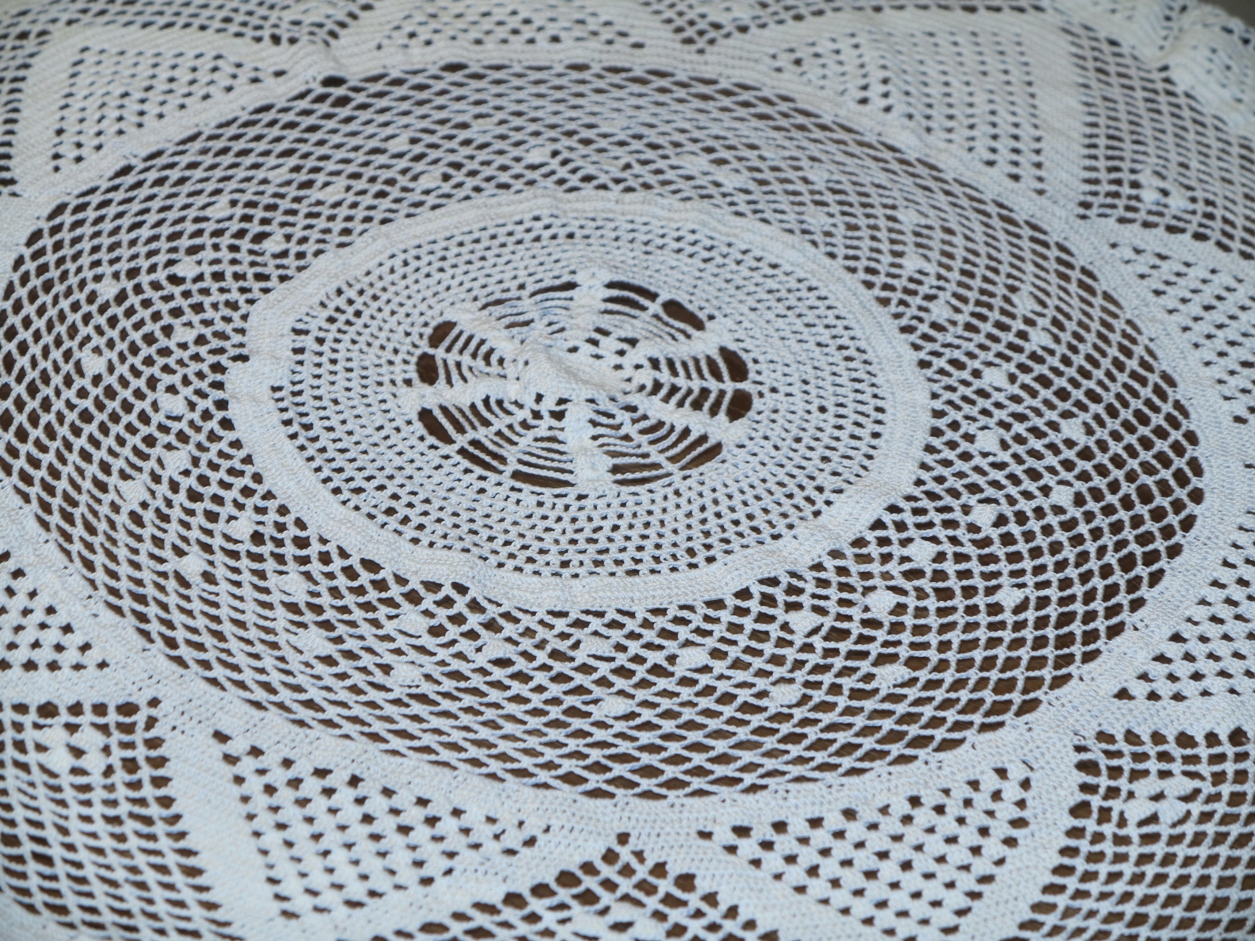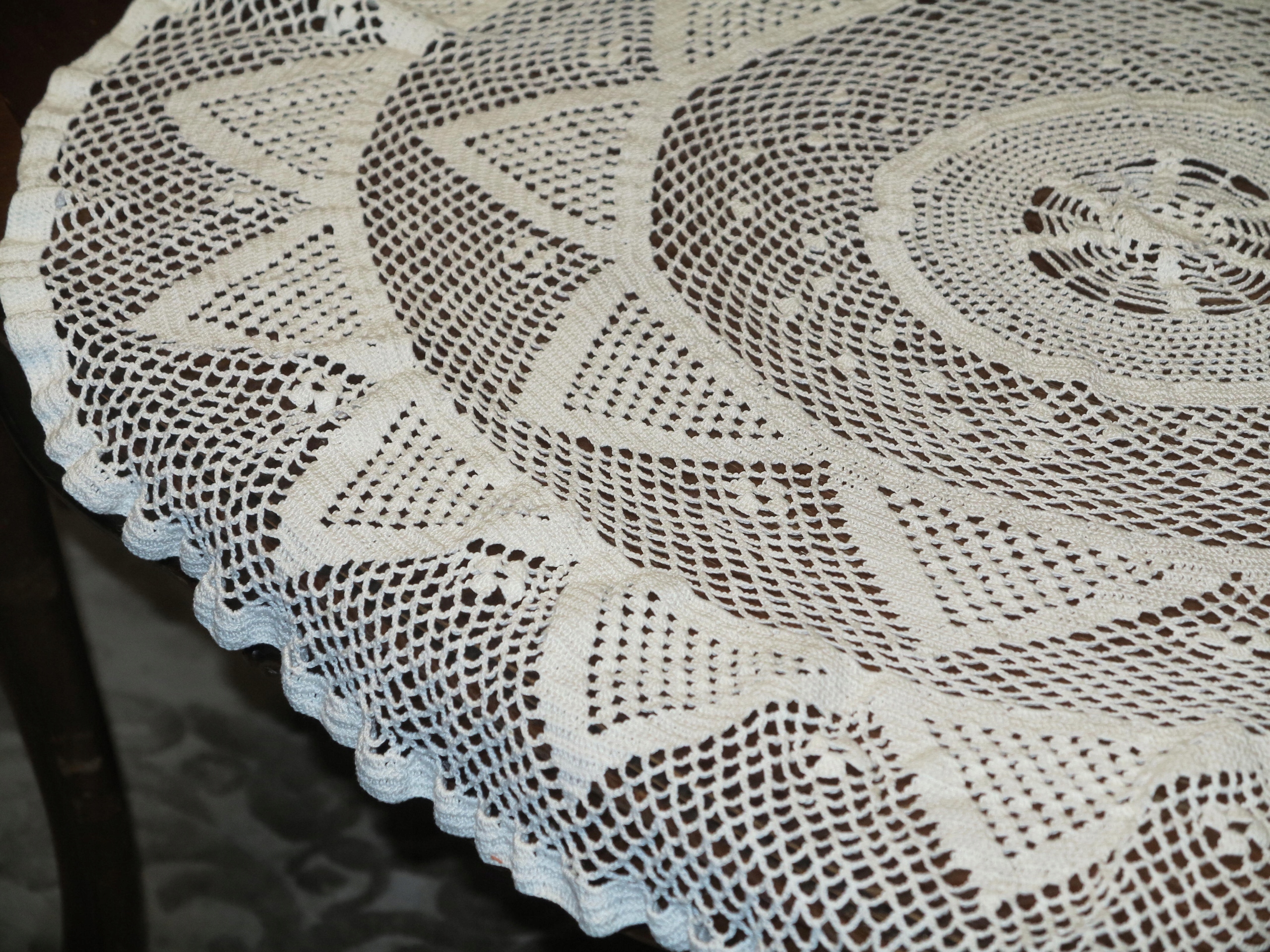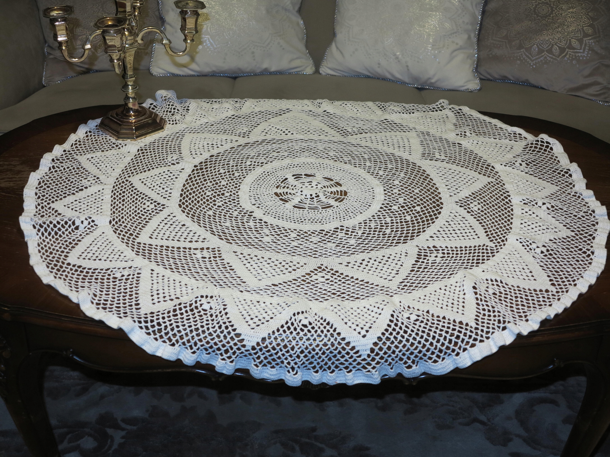 Предметом аукціону є красива скатертина, ручного в'язання з бавовняних ниток, зі складним візерунком. Красиво виглядає на столі. Його розміри: діаметр: 93 см. Б/у, в супер хорошому та якісному стані. Рекомендую.