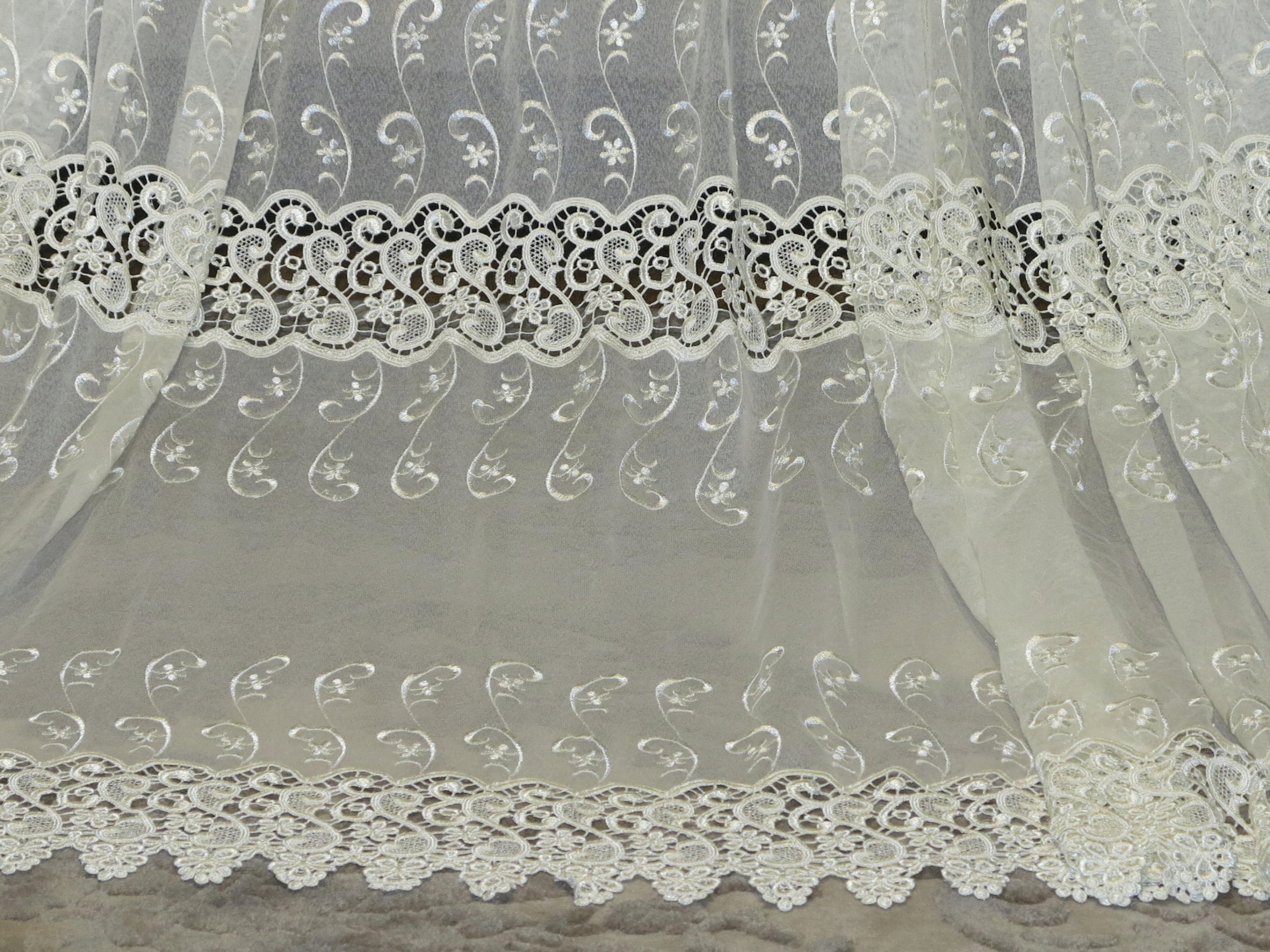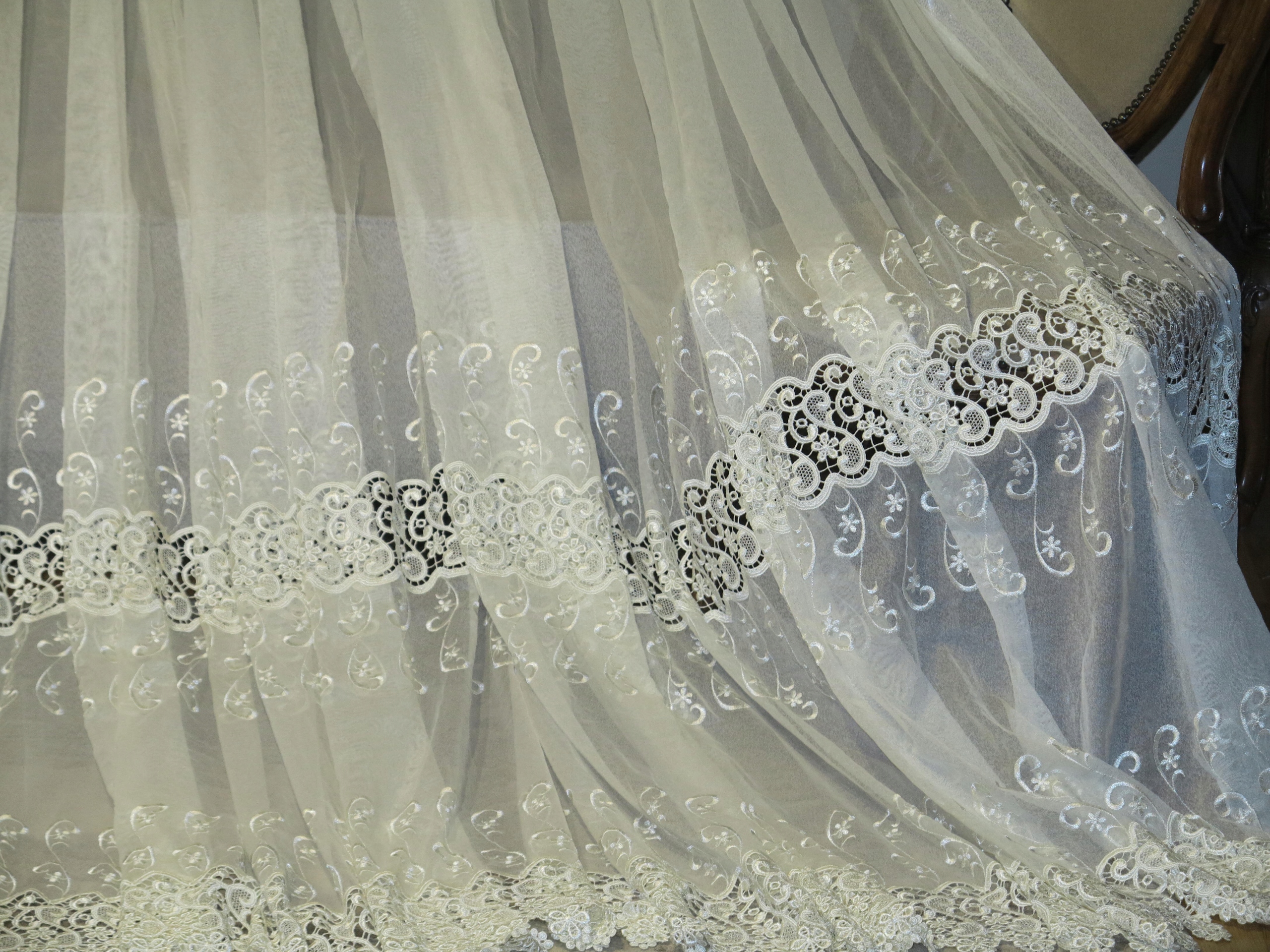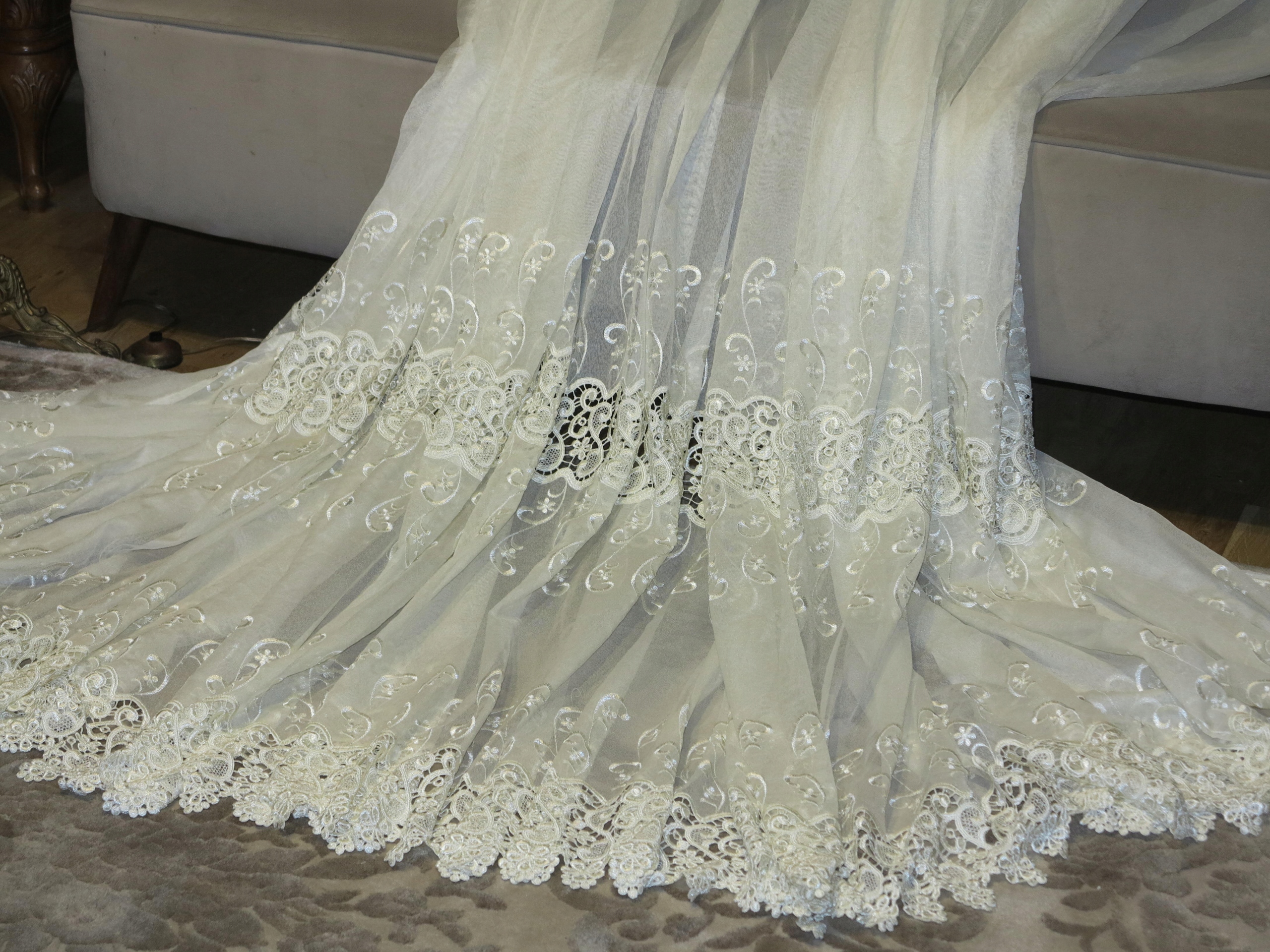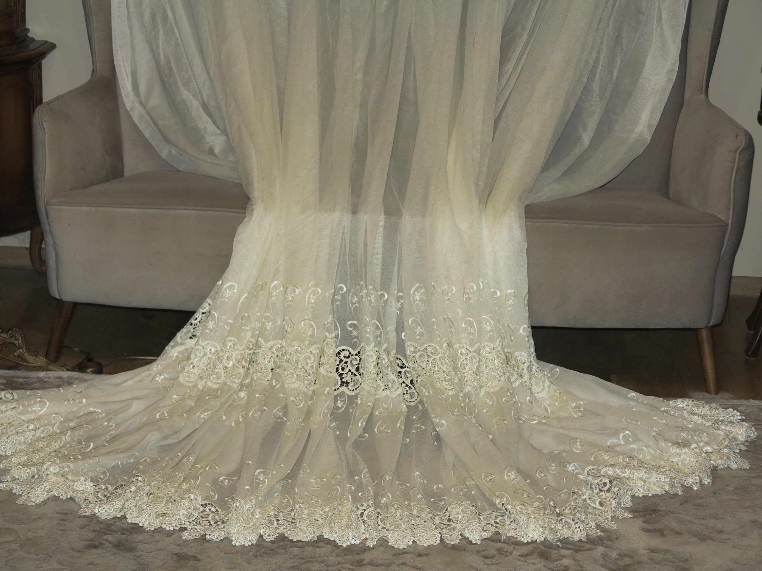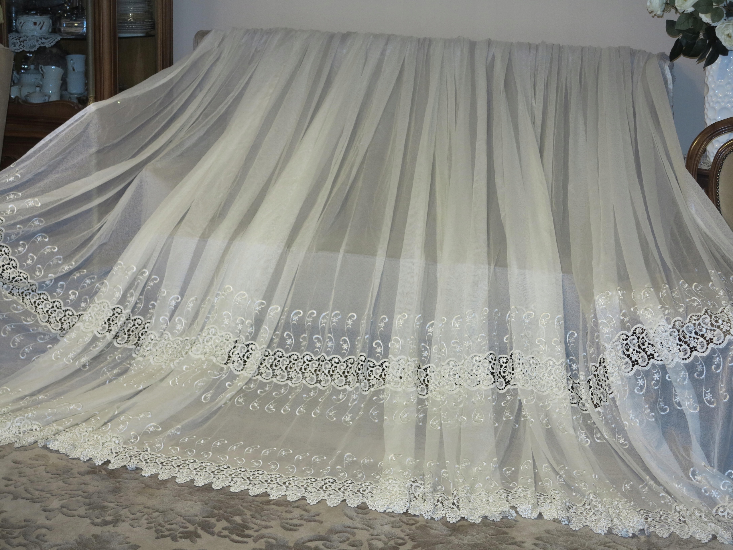 Чудова величезна завіса з Перл -Гіпуєм та вишивкою. Завіса, що виливається, важка з кількістю гіпюра. Це шматок чудових і красивих штор. Колір чистого ECRU. Тип самої завіси - це м'який
