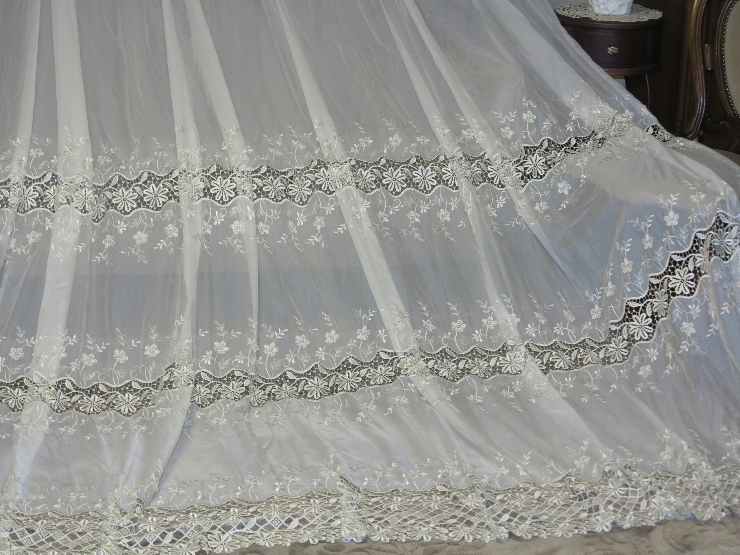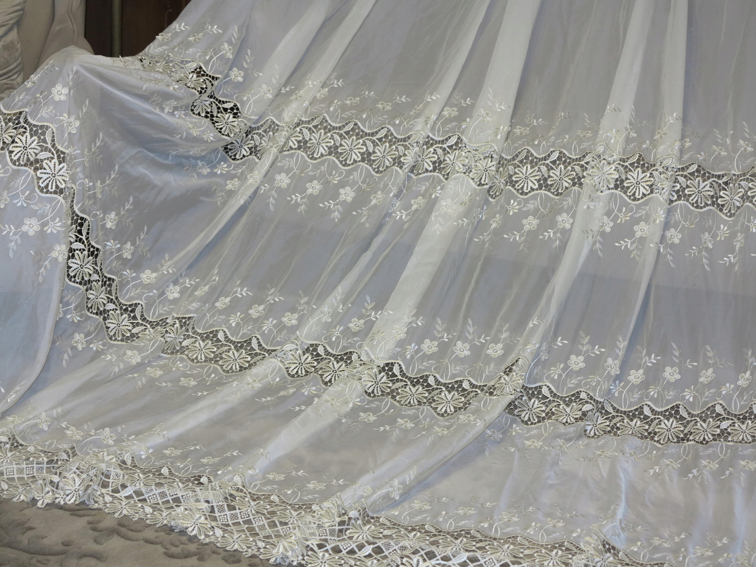 Чудова велика завіса з багатими перловими гупулами та вишивкою, на вершині на стрічці, ширша Криза, закінчена атласною обрізкою. Завіса, що виливається, важка з кількістю гіпюра. Колір чистого світла ecru/кремовий білий. Завіса дуже хороша гарунка і якісно