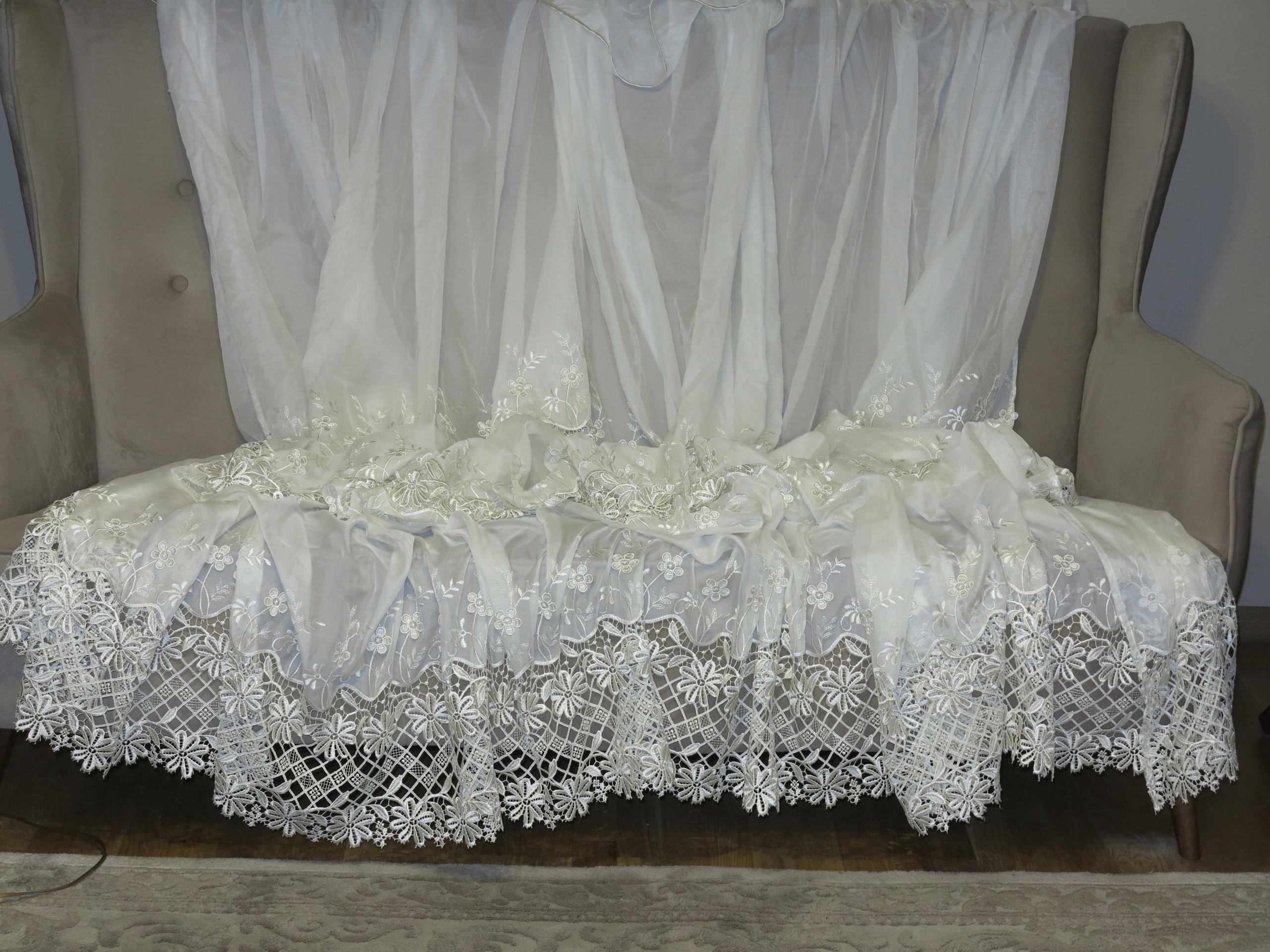 Тема аукціону надзвичайно красива, дуже широка і висока завіса, багата від гіпюри та вишивки. Завіса ще красивіша в реальності. На широкій зморщеній стрічці. Використовувана завіса, в супер хорошому стані та якості. Рекомендую.