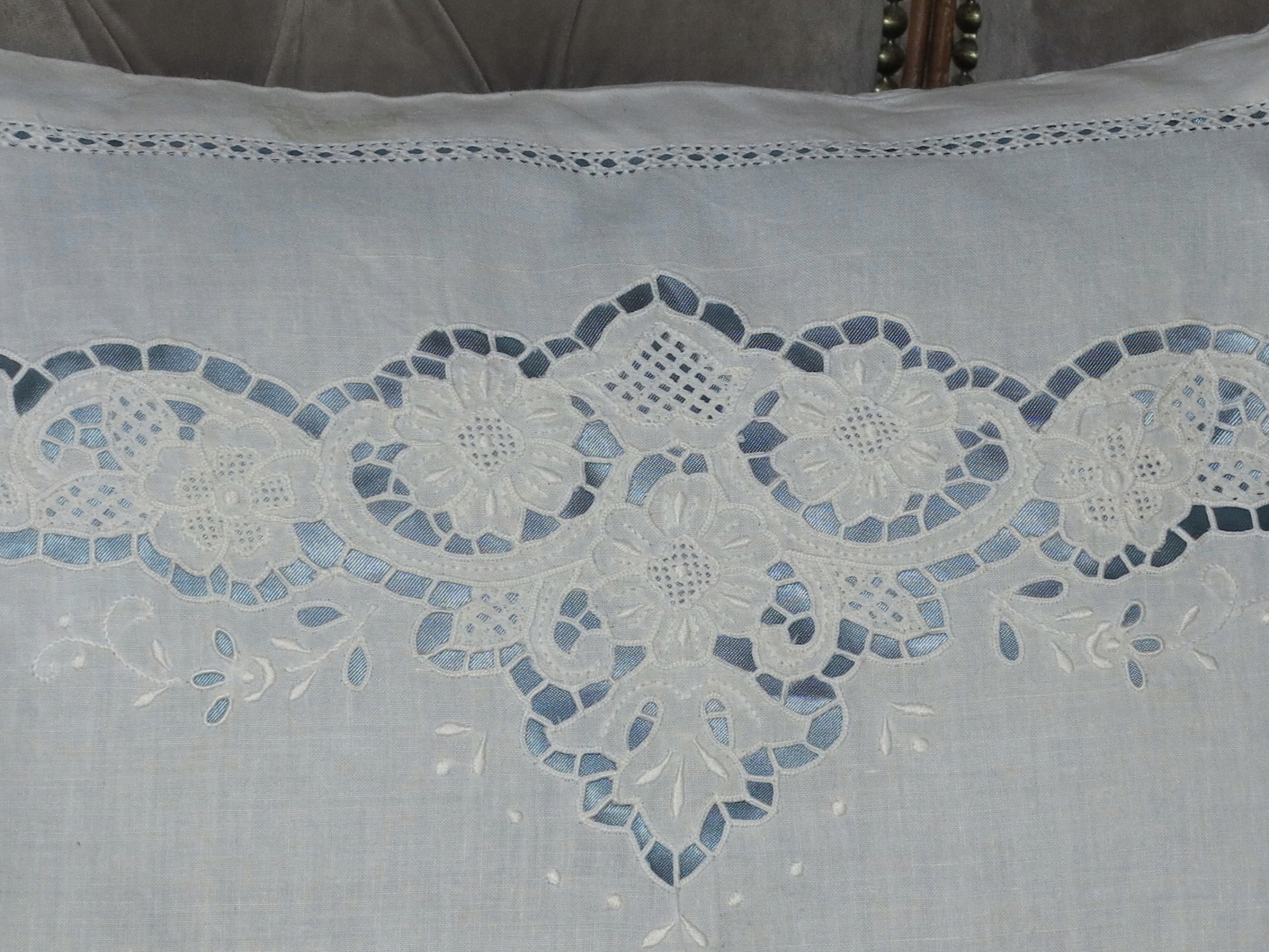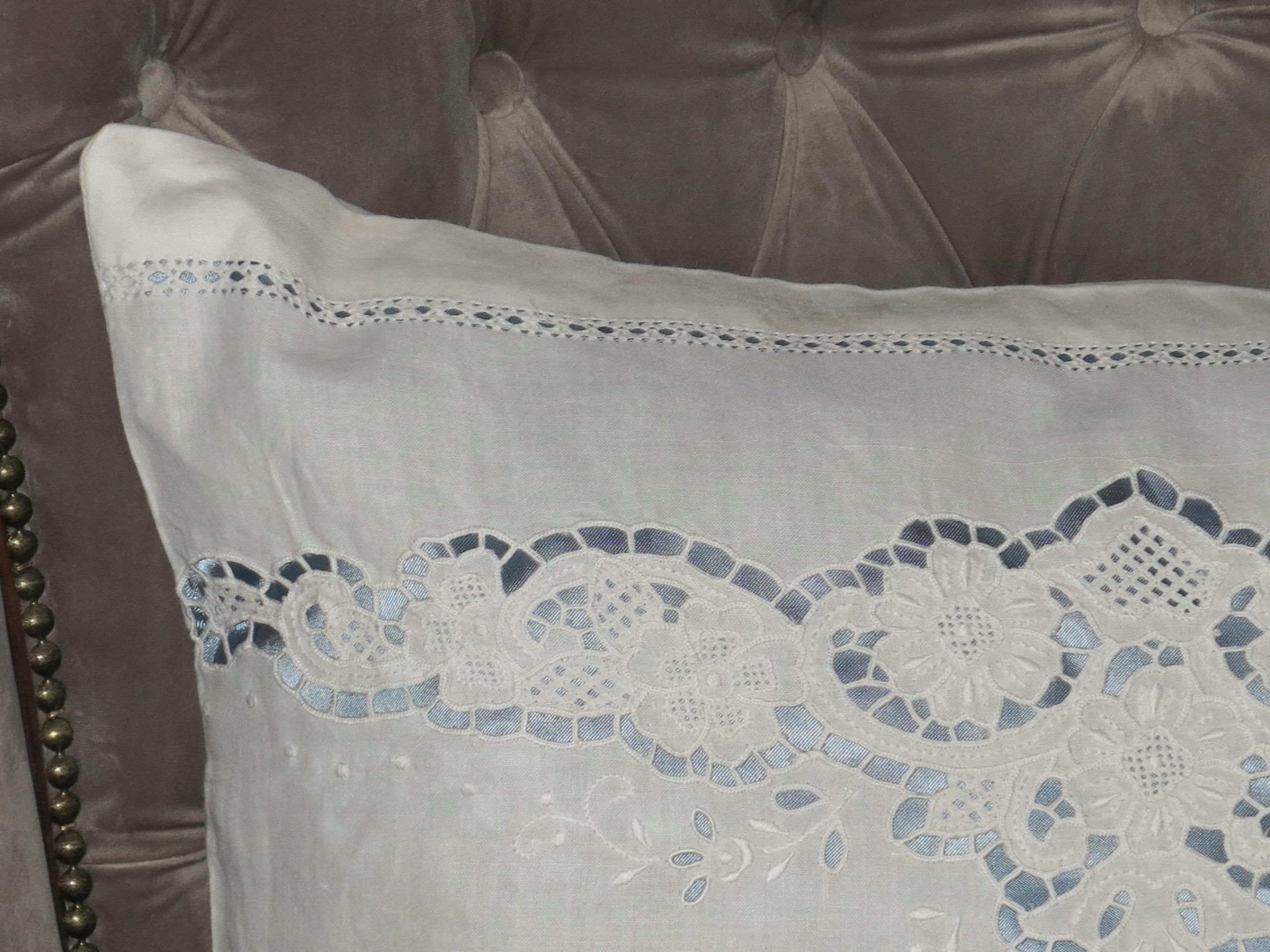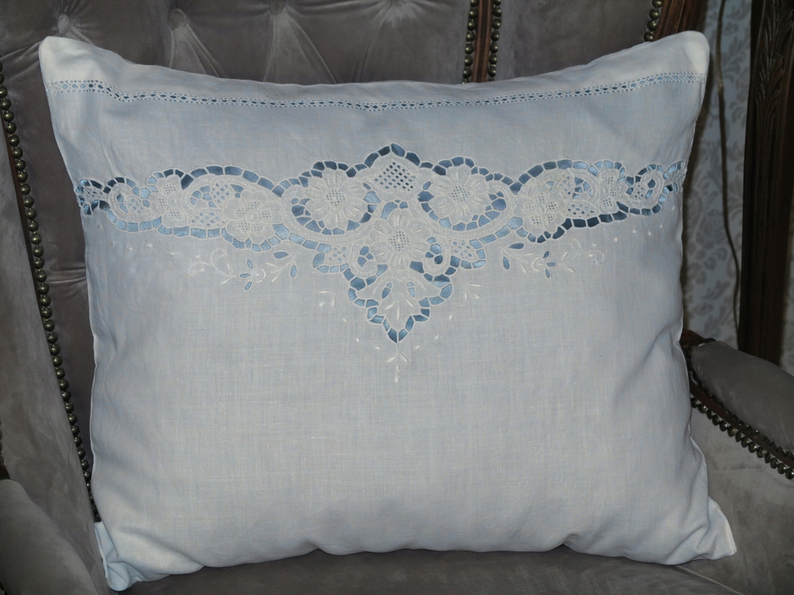 ГАРНУ ВЕЛИКУ ПОДУШКУ З ЧИСТОЇ БАВОВНИ З ГАРНОЮ ВИШИВКОЮ, АЖУРОМ ТА ОСЕЛЕДЦЕМ. ПОДУШКА МАЄ ВСТАВКУ З БЛАКИТНОГО АТЛАСУ