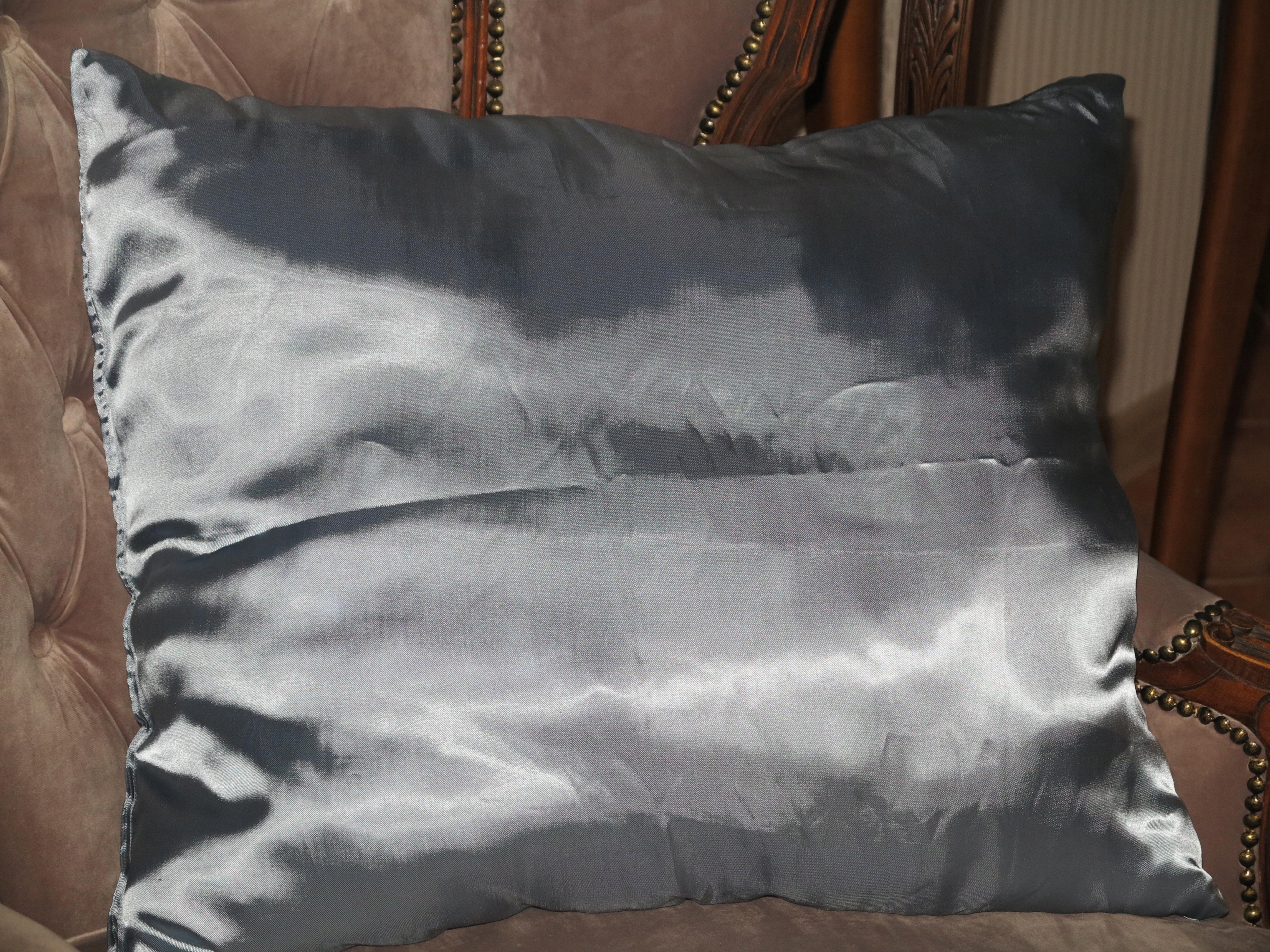 ЧУДОВА ВЕЛИКА ПОДУШКА З ВИШИВКОЮ ТА ТРЮСАМИ, ВСТАВКА АТЛАСНО-СИНЯ, НАПОЛНЮВАЧ № 2