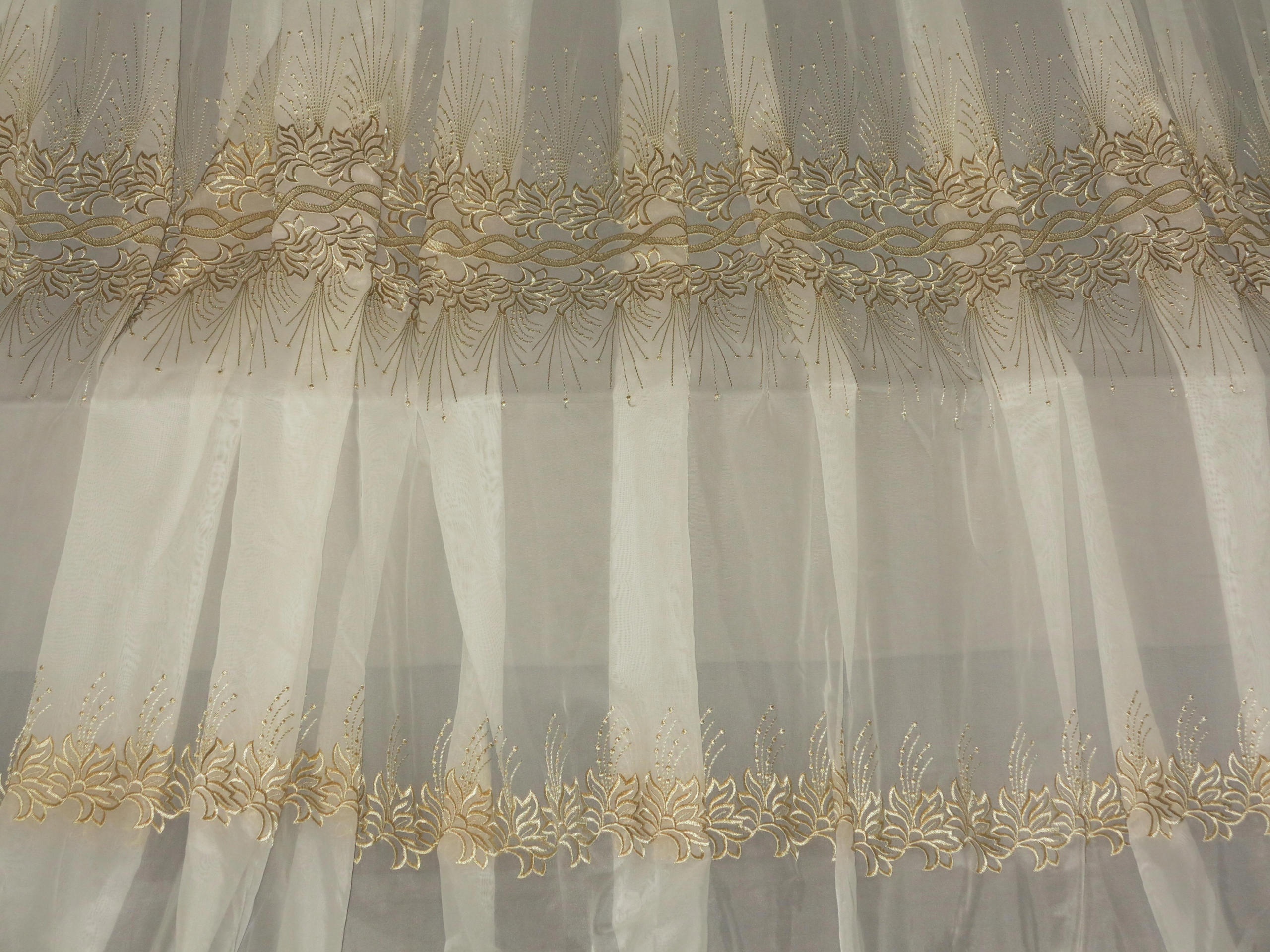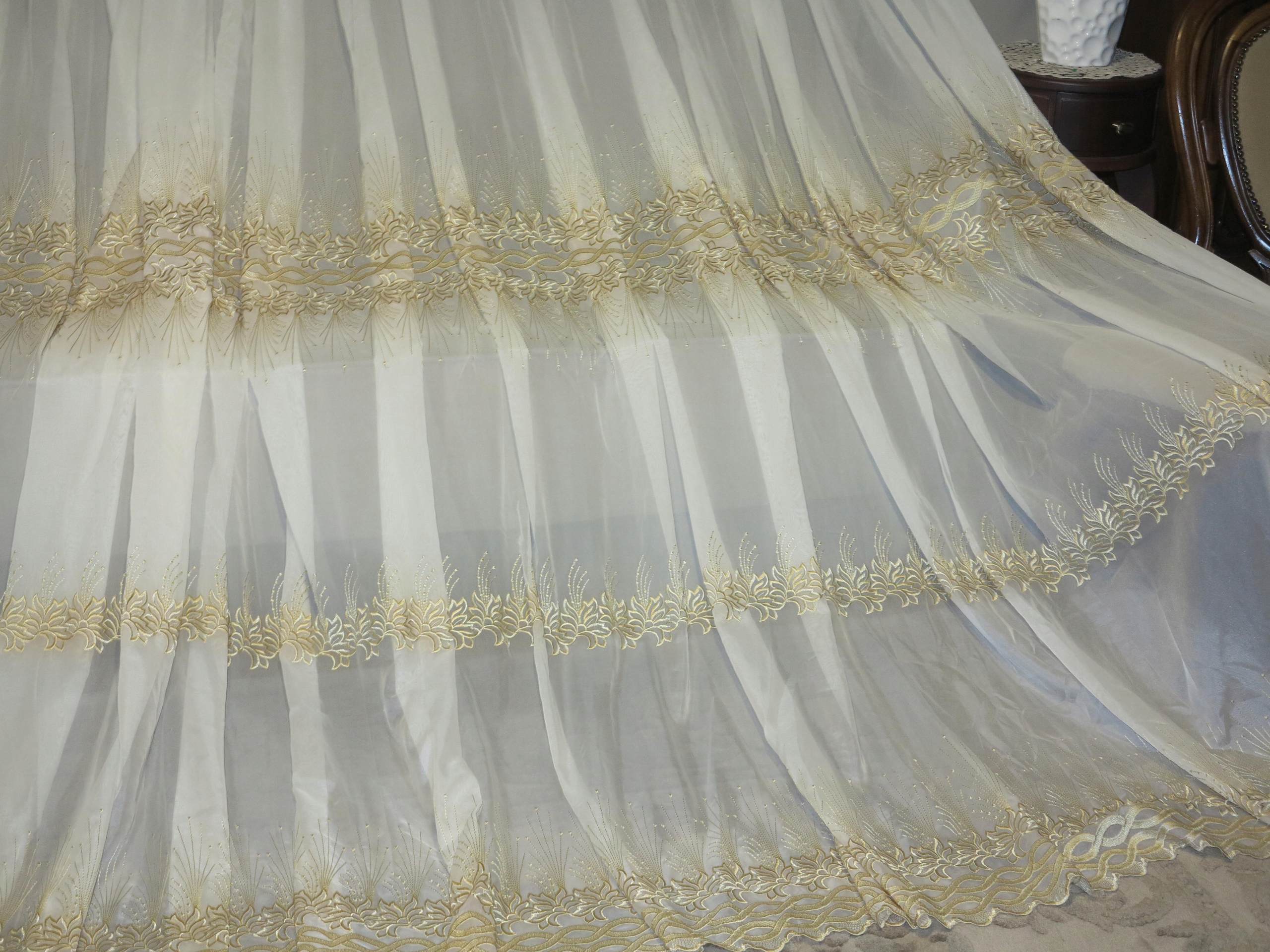 НАДЗВИЧАЙНУ КРАСИВУ ШТОРУ З ТРЬОМИ РЯДАМИ БАГАТОЇ ВИШИВКИ СВІТЛИМ ЗОЛОТОМ.