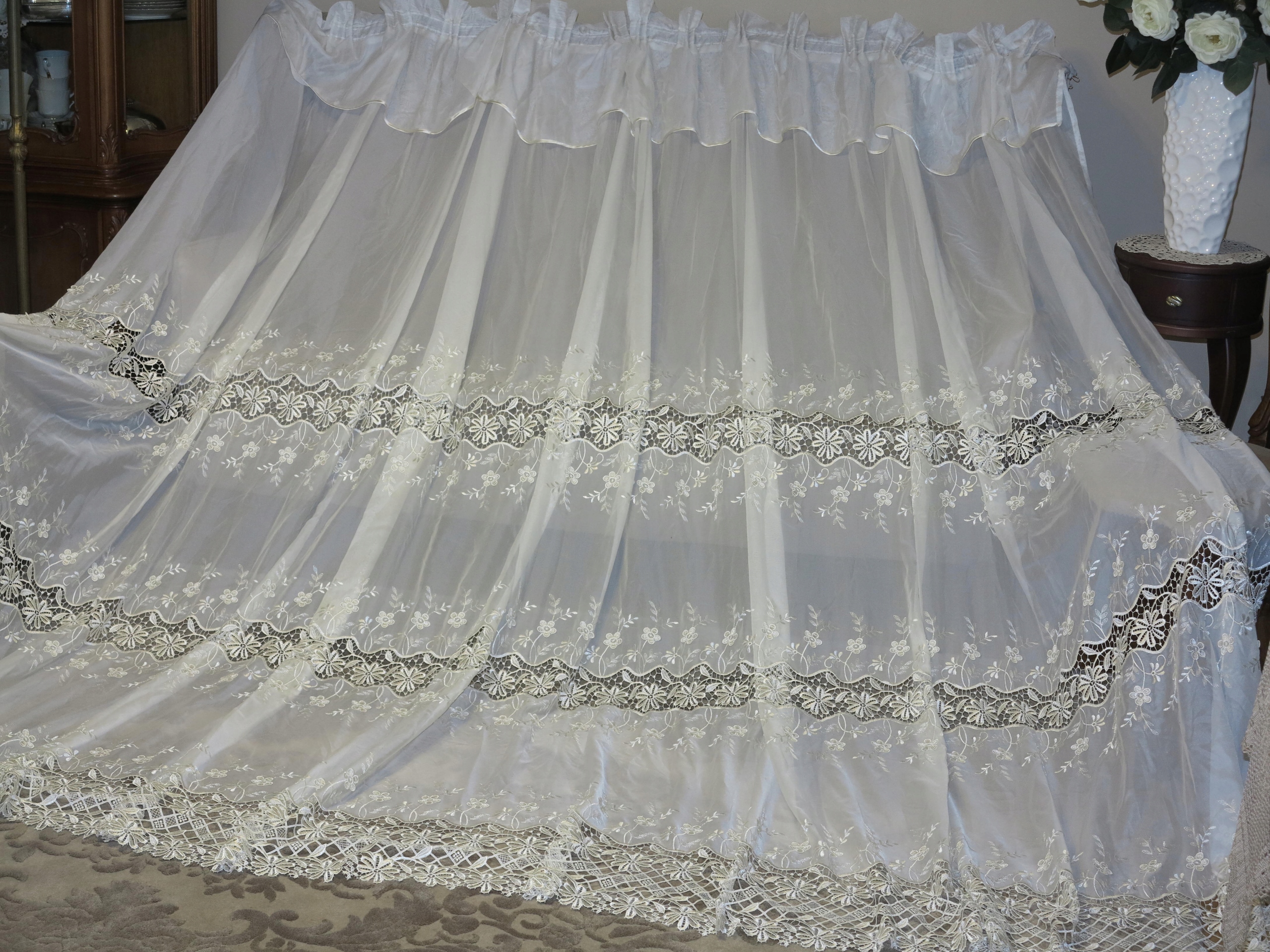 Тема аукціону надзвичайно красива, дуже широка і висока завіса, багата від гіпюри та вишивки. Завіса ще красивіша в реальності. На широкій зморщеній стрічці. Використовувана завіса, в супер хорошому стані та якості. Рекомендую.