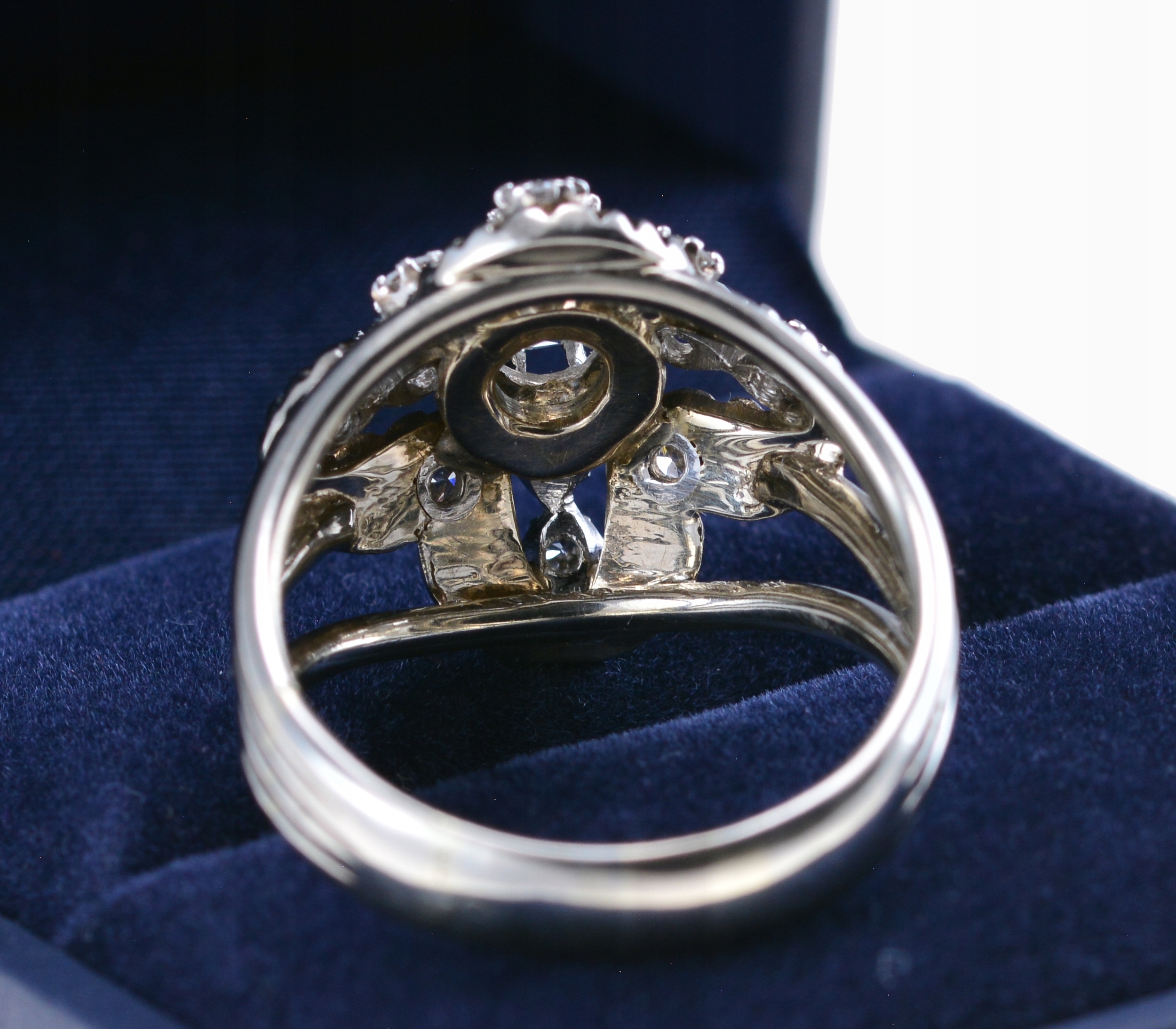 - Кільце, виготовлене з вищого золота 18 к. Корона кільця була прикрашена діамантами загальною вагою 1 ct. Центральний алмаз з масою 0,45Кт та параметрами: чистота1, колір G оточують менші алмази в спрощеному розрізі із загальною масою 0,55.