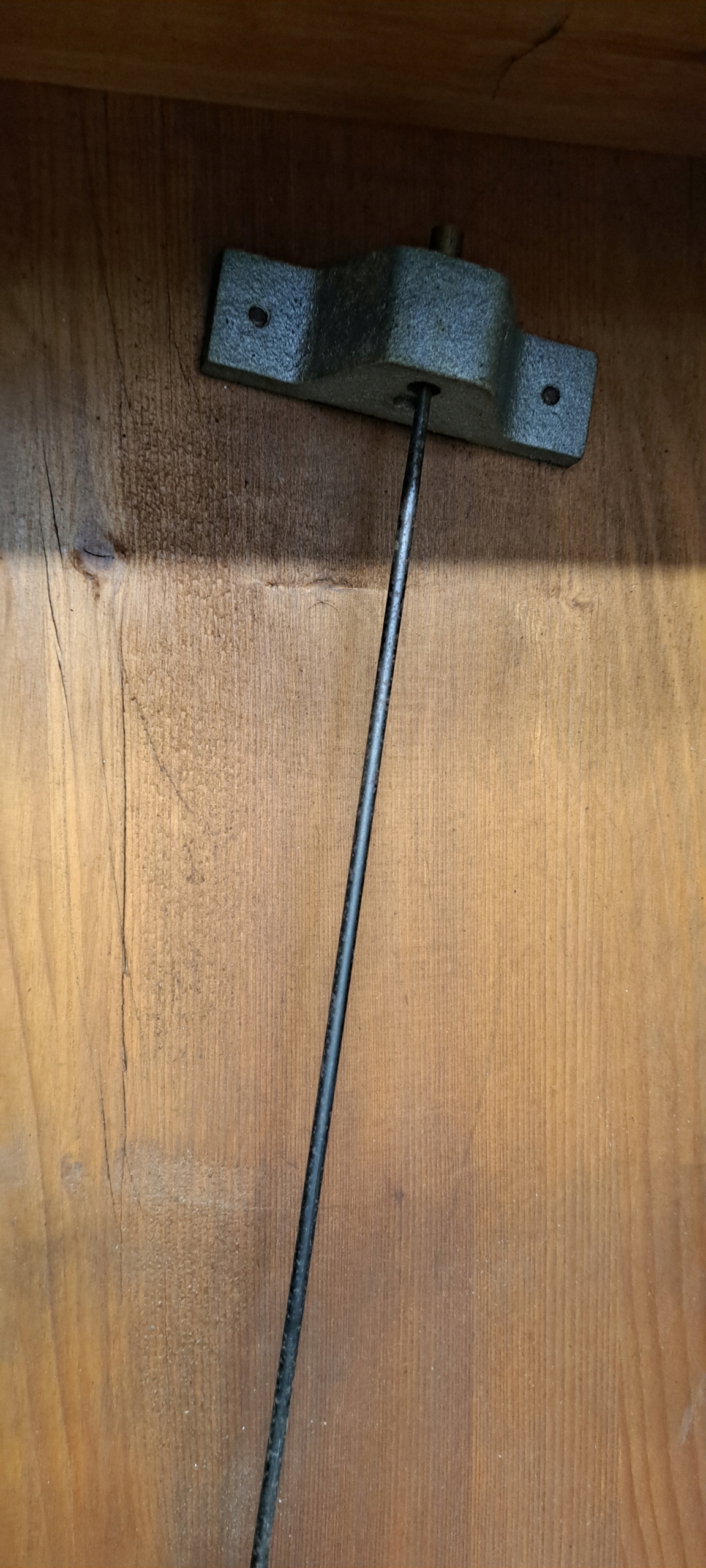 ГАРНИЙ ВИТРАЖ, ЗРОБЛЕНА З ДУЖЕ ТОВСТИХ, КРИСТАЛЕВИХ, СКОШЕНИХ СКЕЛ, ЗА ЯКИМИ РУХАЄТЬСЯ МАЯТНИК, ПРАВИЛЬНО ТА ПУНКТУАЛЬНО ПОКАЗУЮЧИ ЧАС.