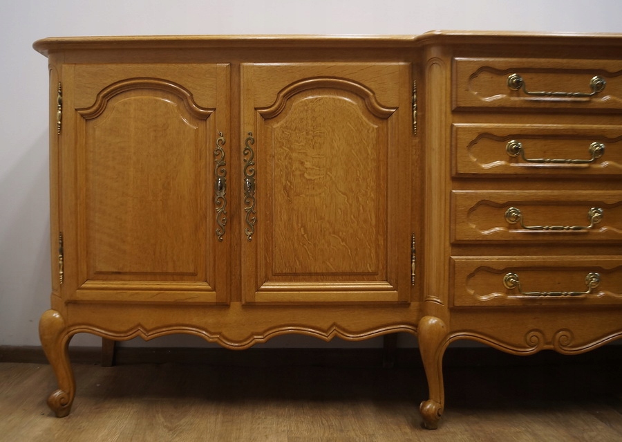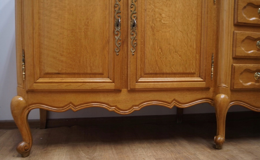 Комод має чотири дверцята і висувний ящик. Комод прикрашений різьбленням і спирається на красиві ніжки кабріоля. Низ оброблений декоративним воланом. Цей предмет меблів унікальний і винятковий.