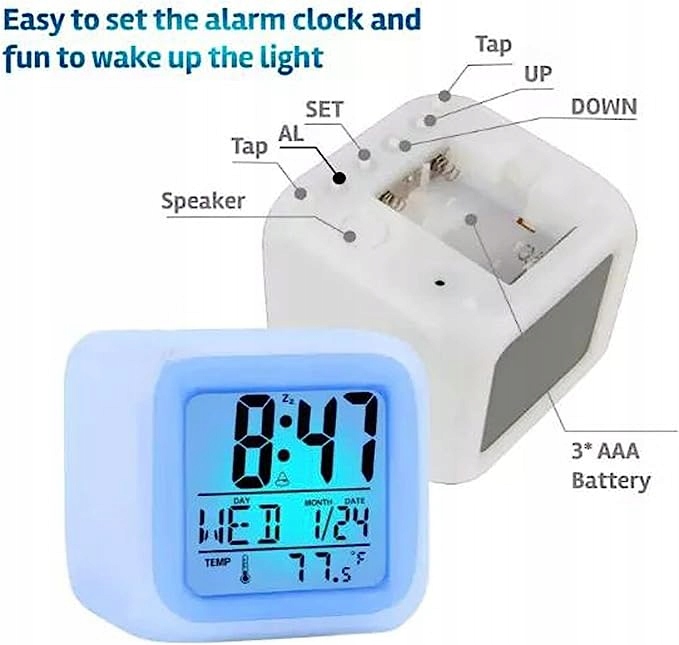 - 【Стильний зовнішній вигляд】 будильник для дітей має компактну та стильну конструкцію, підходить для використання як будильник на стіл для ліжка, а також є чудовою прикрасою спальні, а продукт виготовлений з високої якості ABS і має лише п’ять кнопок ззаду, завдяки якому прості у використанні для дітей Цей світловий годинник повністю тихий і мовчазний, без дратівливих звуків тика, щоб переконатися, що мрія ваших дітей не буде порушена вночі, світло освітлюється протягом п’яти секунд, і ви можете використовувати його як світильник ночі/освітлення навколишнього середовища