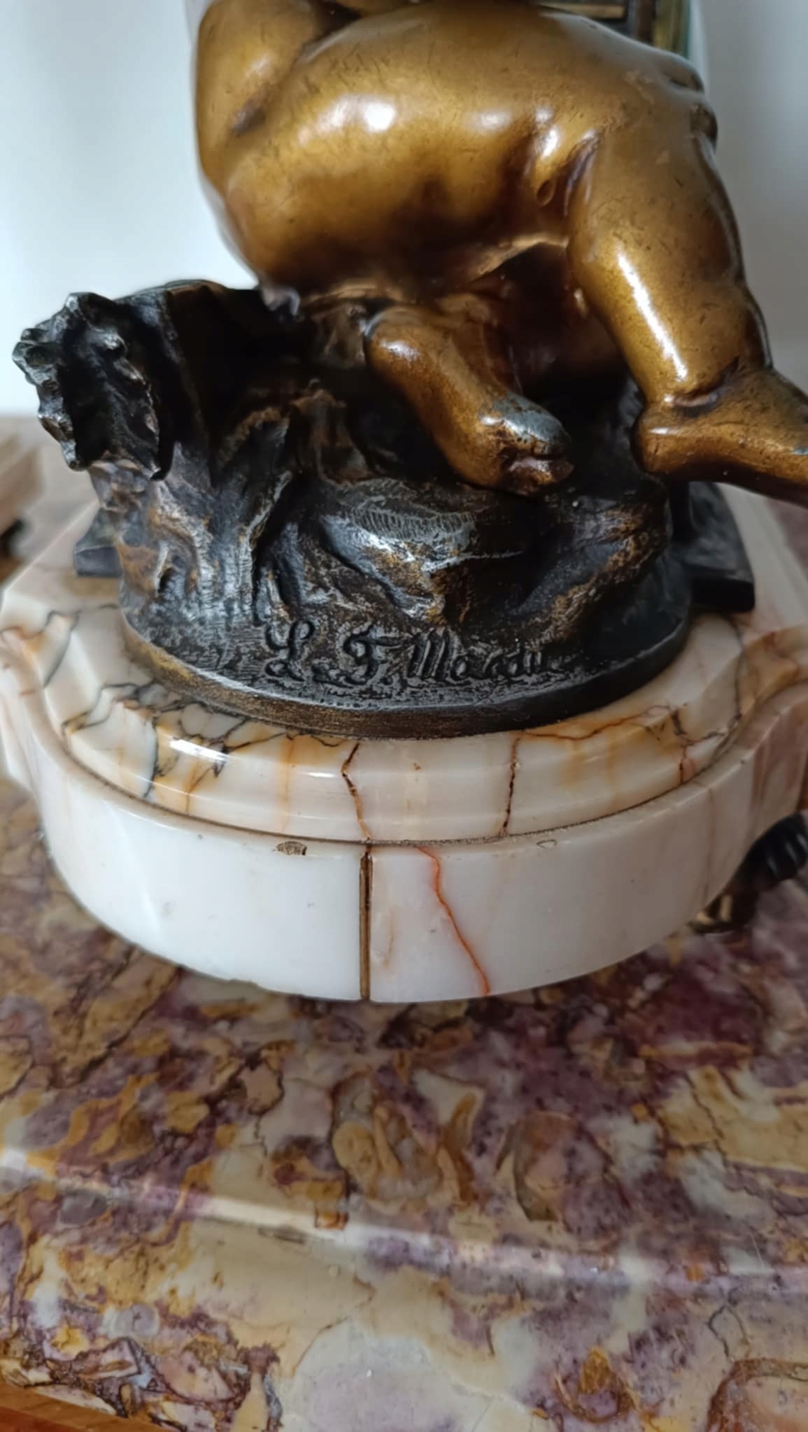 Годинник виготовлено з металу та кремового мармуру з природними плямами.