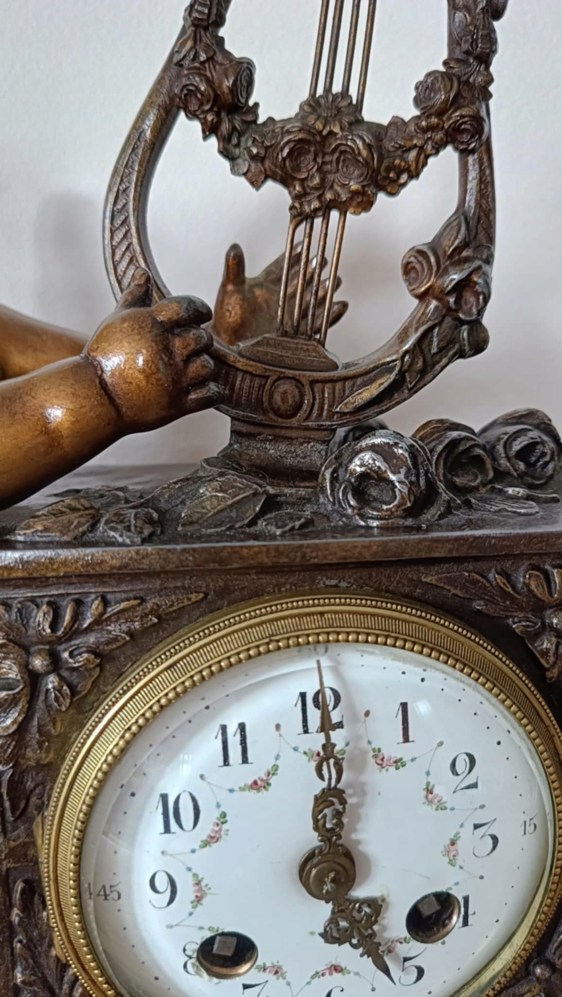 Циферблатний механізм з порцеляни - прикрашений квітковими гірляндами, в дуже хорошому стані, стрілки гарної форми з позолоченої бронзи.