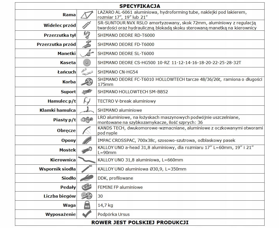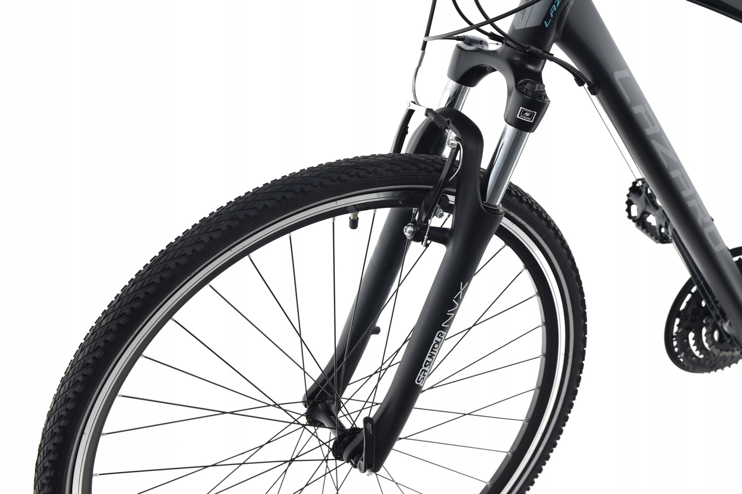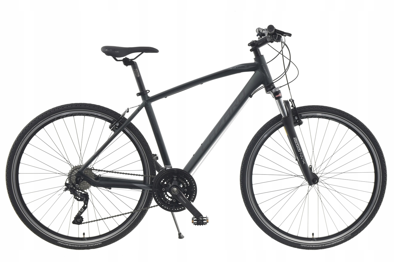 Велосипед Lazaro X-FORCE V4 — це модель кросу, тобто поєднання універсальності та геометрії трекінгового велосипеда та більш агресивного стилю гірських велосипедів. Це буде хорошим вибором для людей, які цінують універсальність і комфортність пересування в міських умовах і поїздках за місто по грунтових трасах. Легка і міцна гідроформована алюмінієва рама з геометрією, що дозволяє прийняти зручне положення. Великі алюмінієві колеса діаметром 28 дюймів на міцних двокамерних ободах KANDS TECH (з високим конусом 25 мм!) і втулках LRO з картриджними підшипниками. Шини з дорожнім і гравійним протектором добре працюватимуть на асфальтованих поверхнях і бічних дорогах. Рама має різьблення для кріплення аксесуарів, таких як: бризковики, пляшка з водою, стійка. Фірмові компоненти приводу від Shimano забезпечать тривалу та безвідмовну роботу та безпроблемне перемикання передач. Ефективні та фірмові гальма Tekktro дають вам відчуття безпеки та контролю під час подорожі. Якщо ви шукаєте універсальне обладнання з репутацією та, крім того, дуже хорошим співвідношенням ціна-якість, кросовий велосипед Lazaro є одним із варіантів для вас.