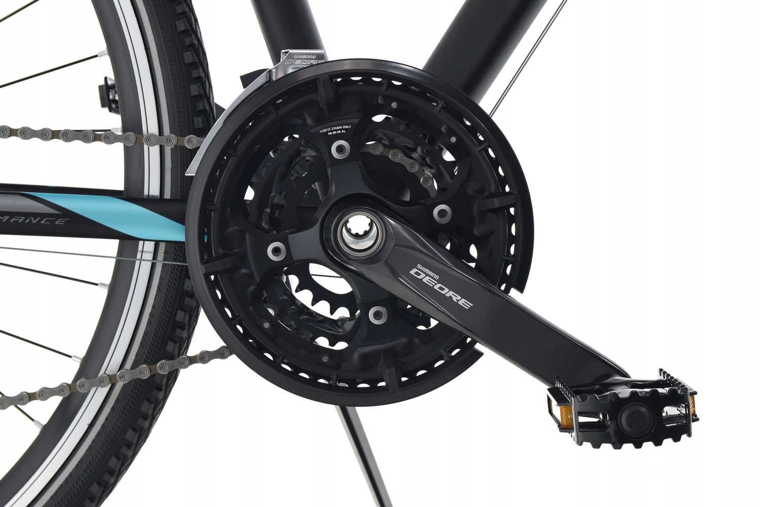 Надійний алюмінієвий шатун SHIMANO FC-TY6010 із довжиною плеча 175 мм. Оснащений трьома зірочками з кількістю зубів 48/36/26 для найнижчої зірочки, що забезпечує правильну роботу ланцюга. Привід HOLLOWTECH 2 забезпечує жорсткість, довговічність, малу вагу та відмінні параметри обертання кривошипа.