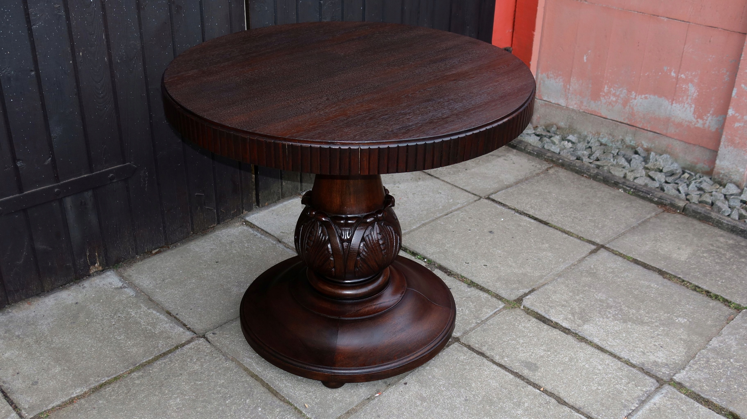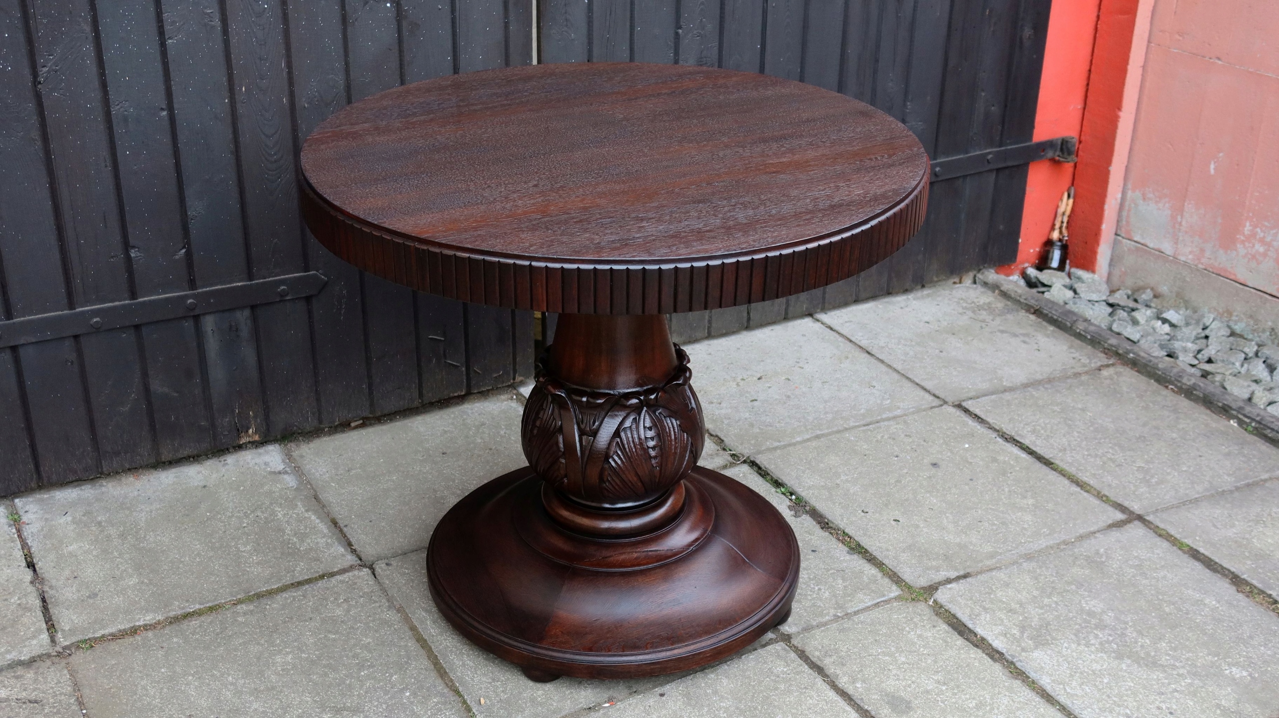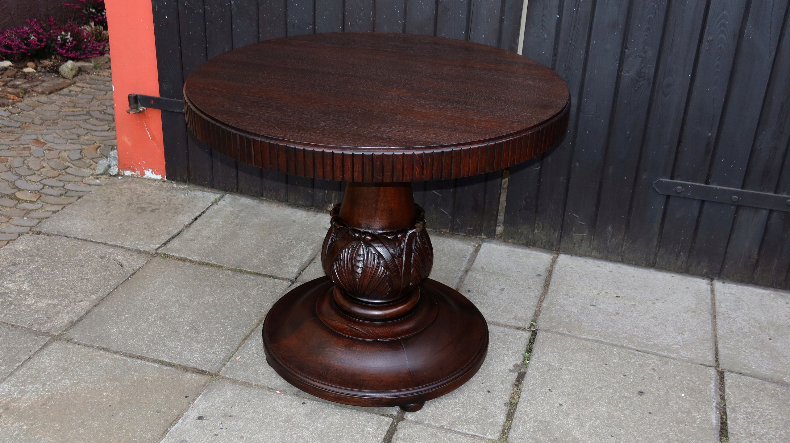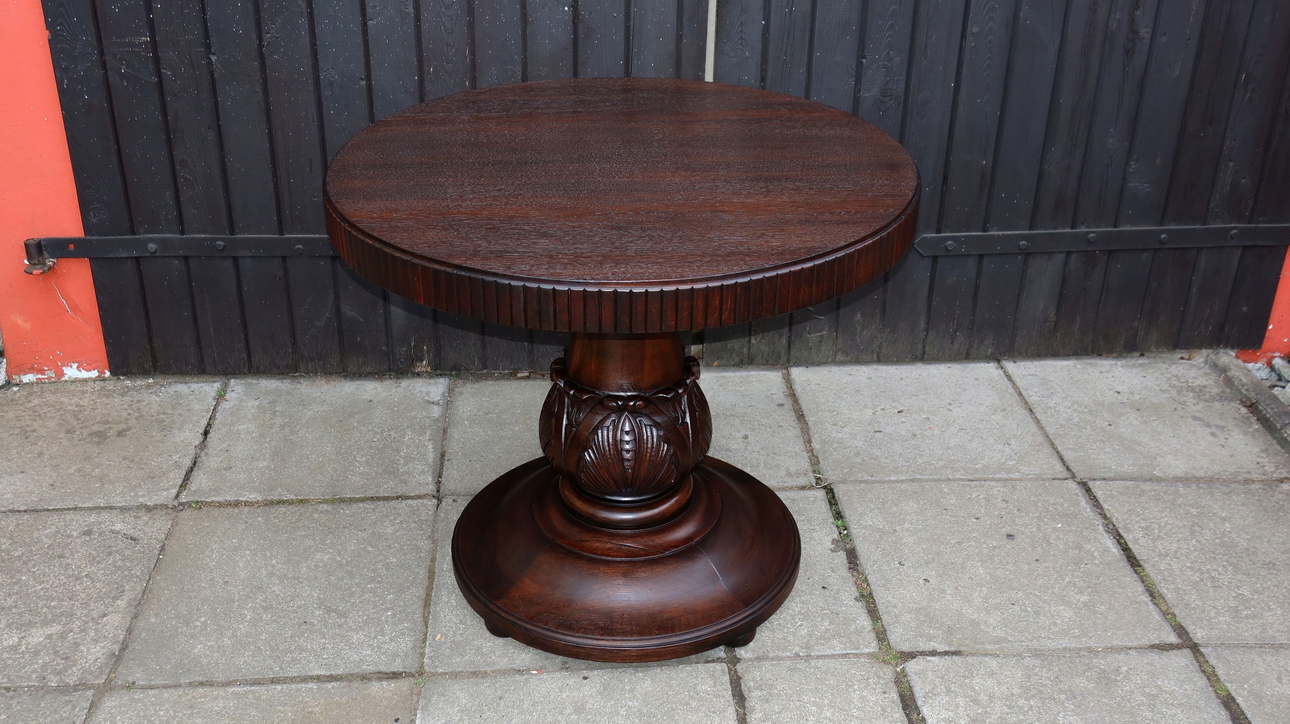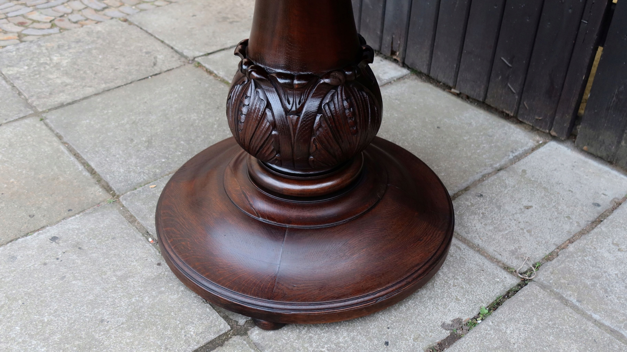 Унікальна кругла таблиця. Стіл виготовлений з дубового дерева, також шпонований красиво розташованим дубом. Меблі датовані 1920 -х роками і виготовляються в стилі нео -Бароко. Стіл підтримується на масивній стопі, стопа має безліч прикрас для епохи. Таблиця має вражаючу круглу ногу. Його можна використовувати як обідній стіл. Меблі після реконструкції.