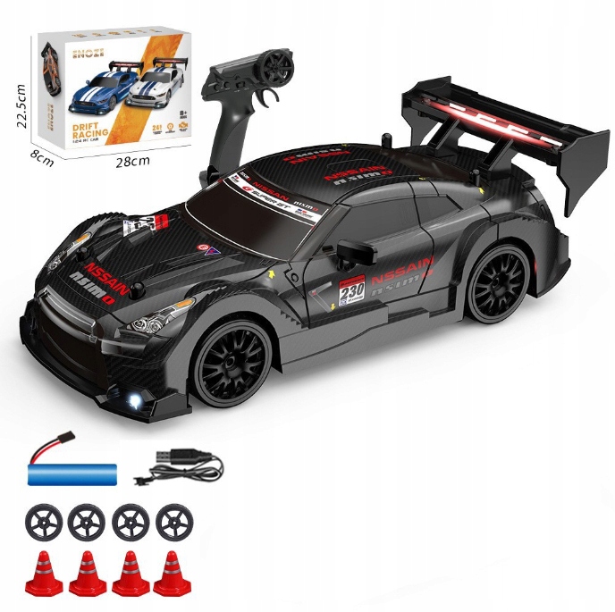 У упаковці ви знайдете все необхідне: дистанційний керований транспортний засіб, контролер, інструменти, кабель для зарядки, акумулятори та набір перешкод. Крім того, набір включає гумові колеса для перегонів та жорстких коліс дрейфу.