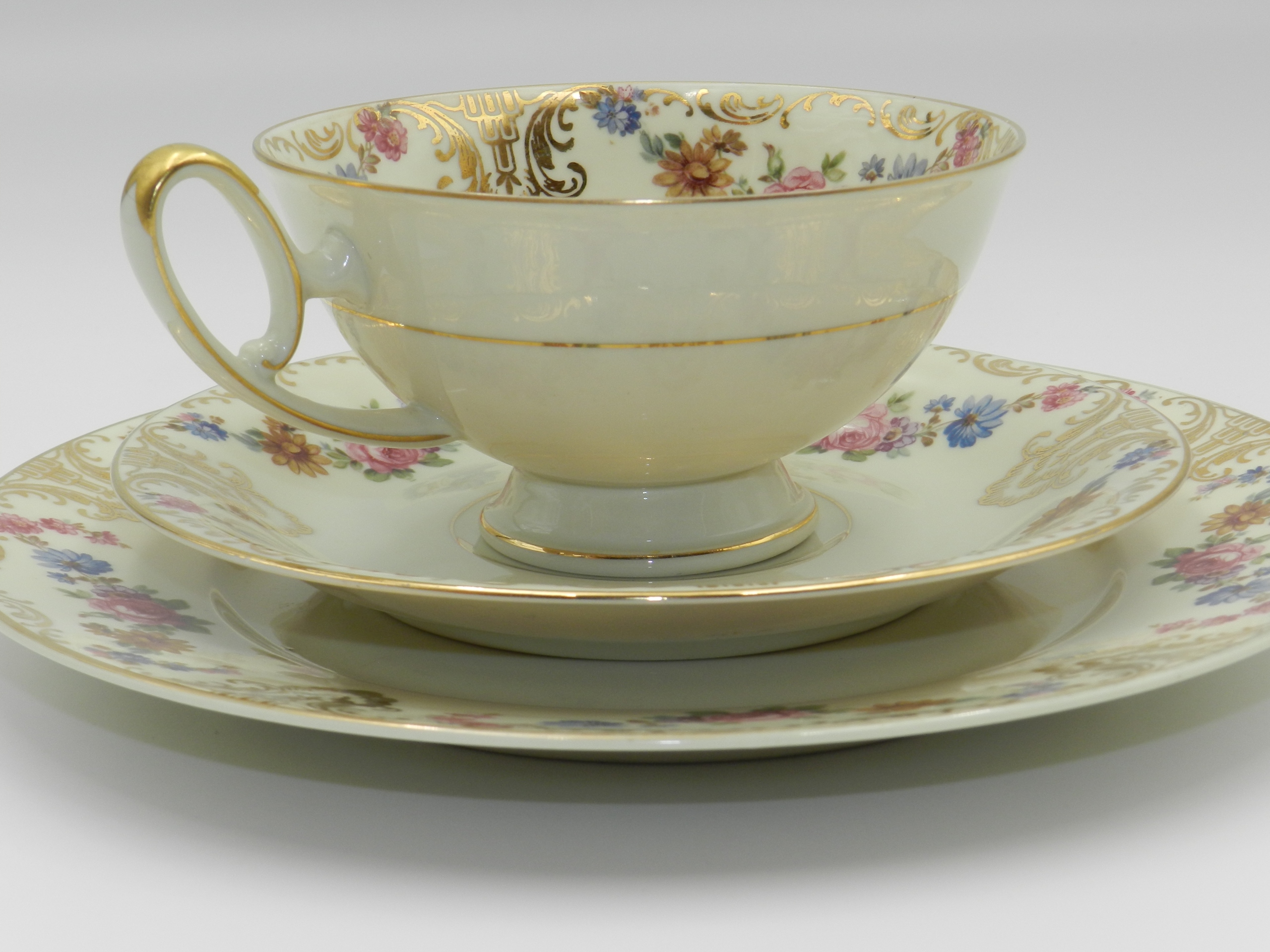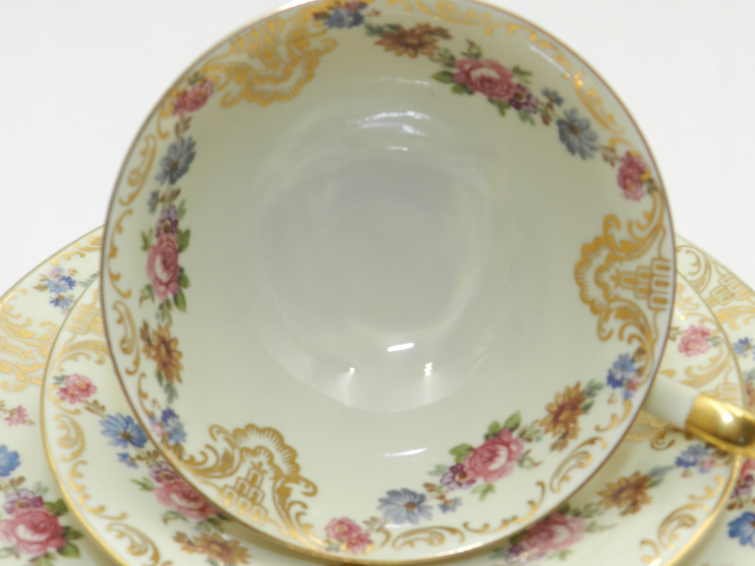 Ніжна, елегантна порцеляна кольору екрю, прикрашена красивим квітковим мотивом і вражаючою насиченою золотою позолотою. На окрему увагу заслуговує ідеально змодельована ручка химерної форми.