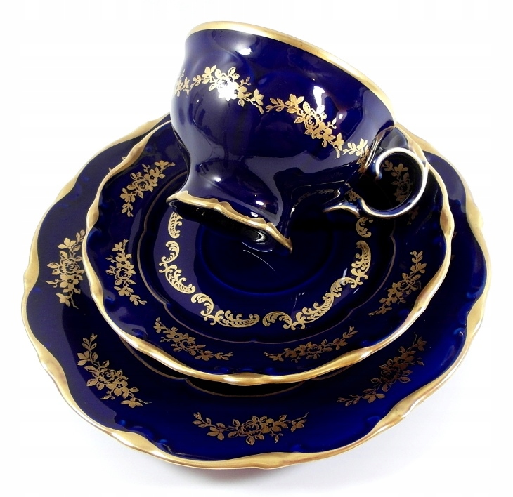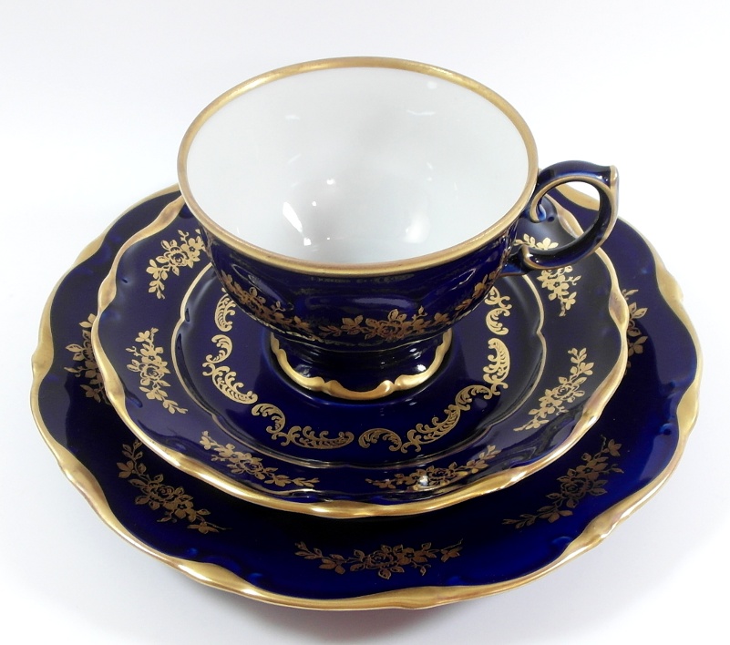 Предмет аукціону гарний старовинний набір для сніданку. Біла порцеляна, прикрашена кобальтом і золотом. Ефектна чашка, дуже гарного моделювання.