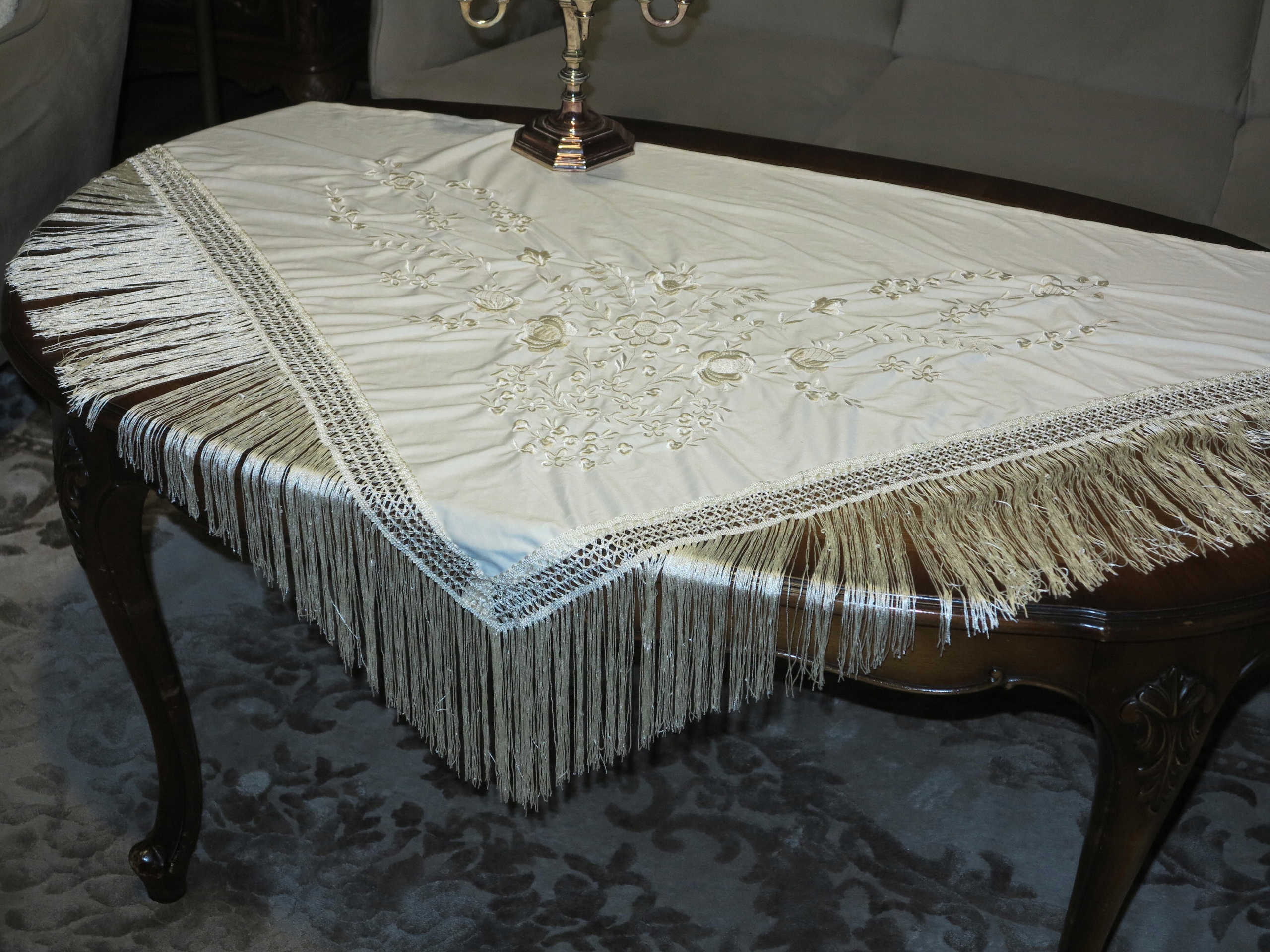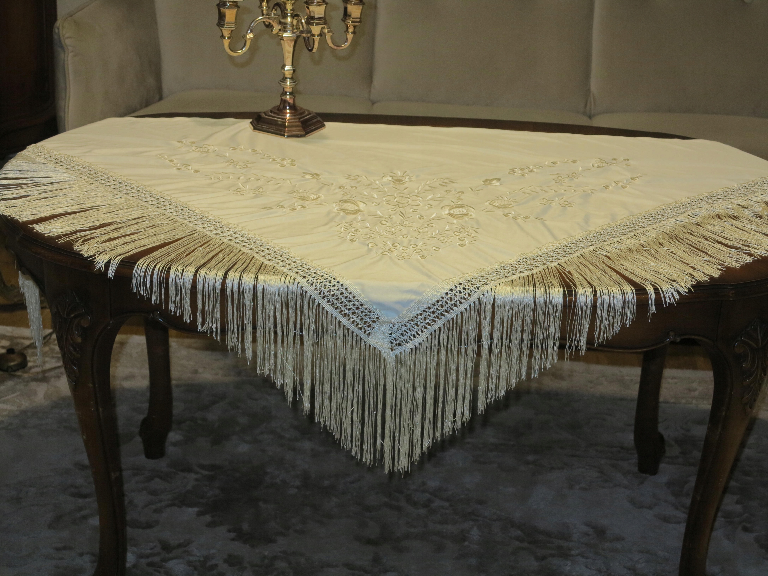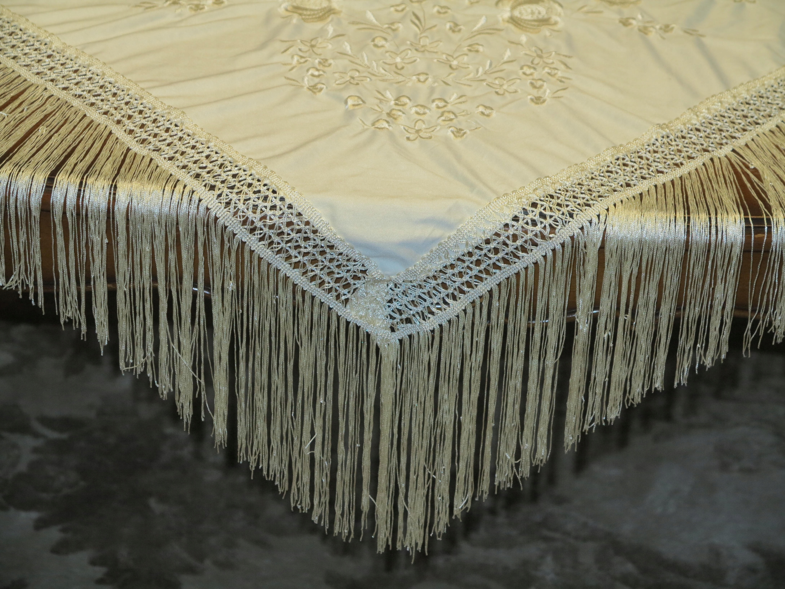 ЧУДОВИЙ ШАЛ ТРИКУТНИК НАСТІННА СКАТЕРТИНА ВИШИВКА ДОВГА БАХОМКА ЕКРЮ
