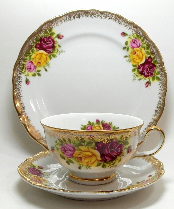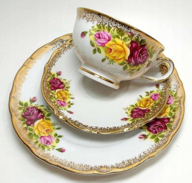 Гарний, старовинний сервіз, виготовлений з білої порцеляни, прикрашений квітами та позолотою.