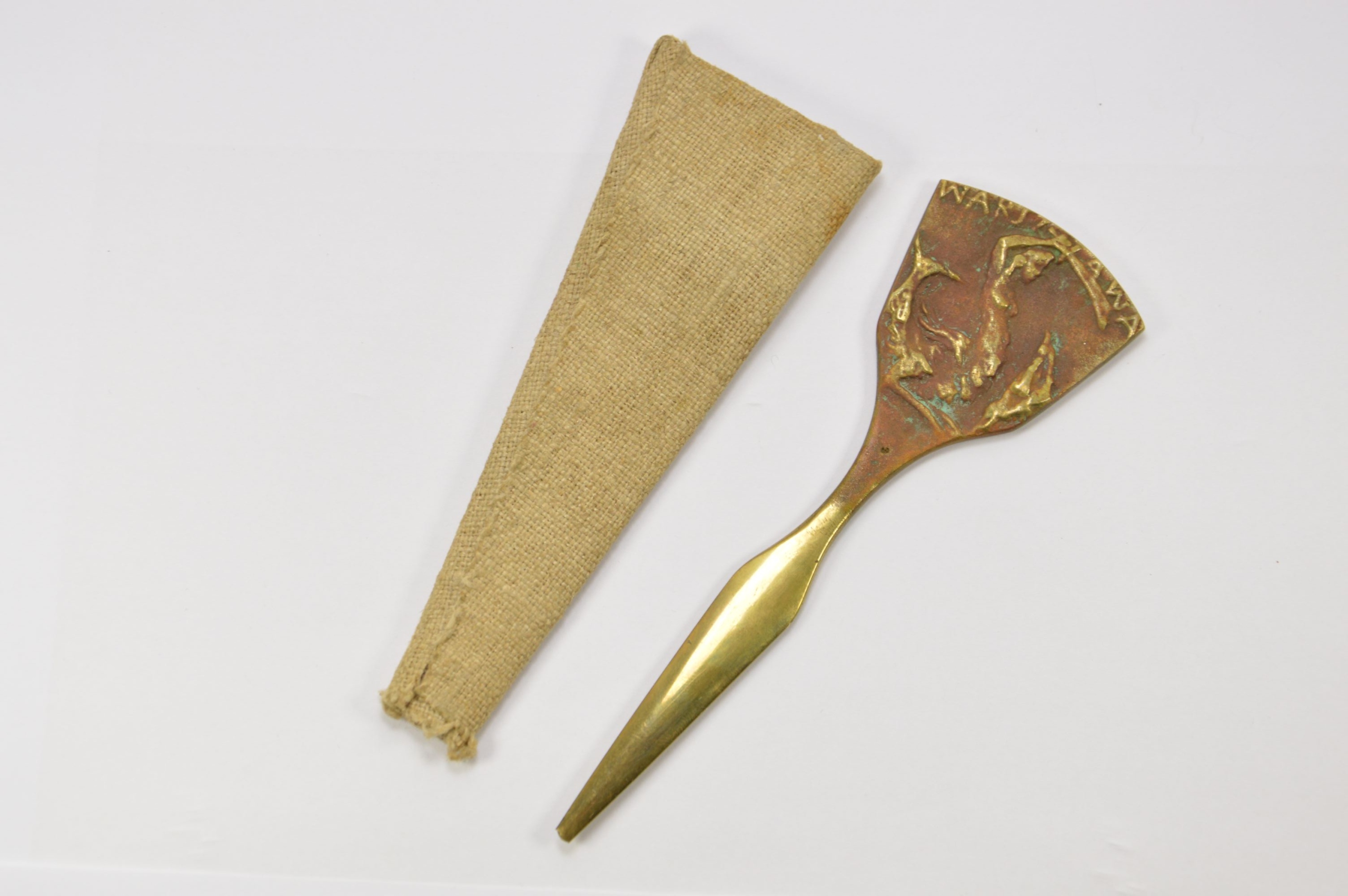 Гарний старий стильний ніж для листів - Варшава. З одного боку ніж прикрашений варшавською русалкою, а з іншого - пам'ятником Шопену. У комплект входить оригінальний, тканинний футляр для ножа.