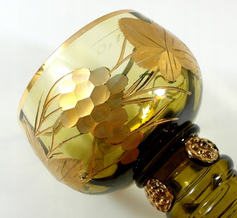 Чудовий старовинний келих - ремер, виготовлений з кольорового кришталевого скла, огранка, позолочений візерунок, рифлена чаша, мірна чашка вказує на 100 мл..