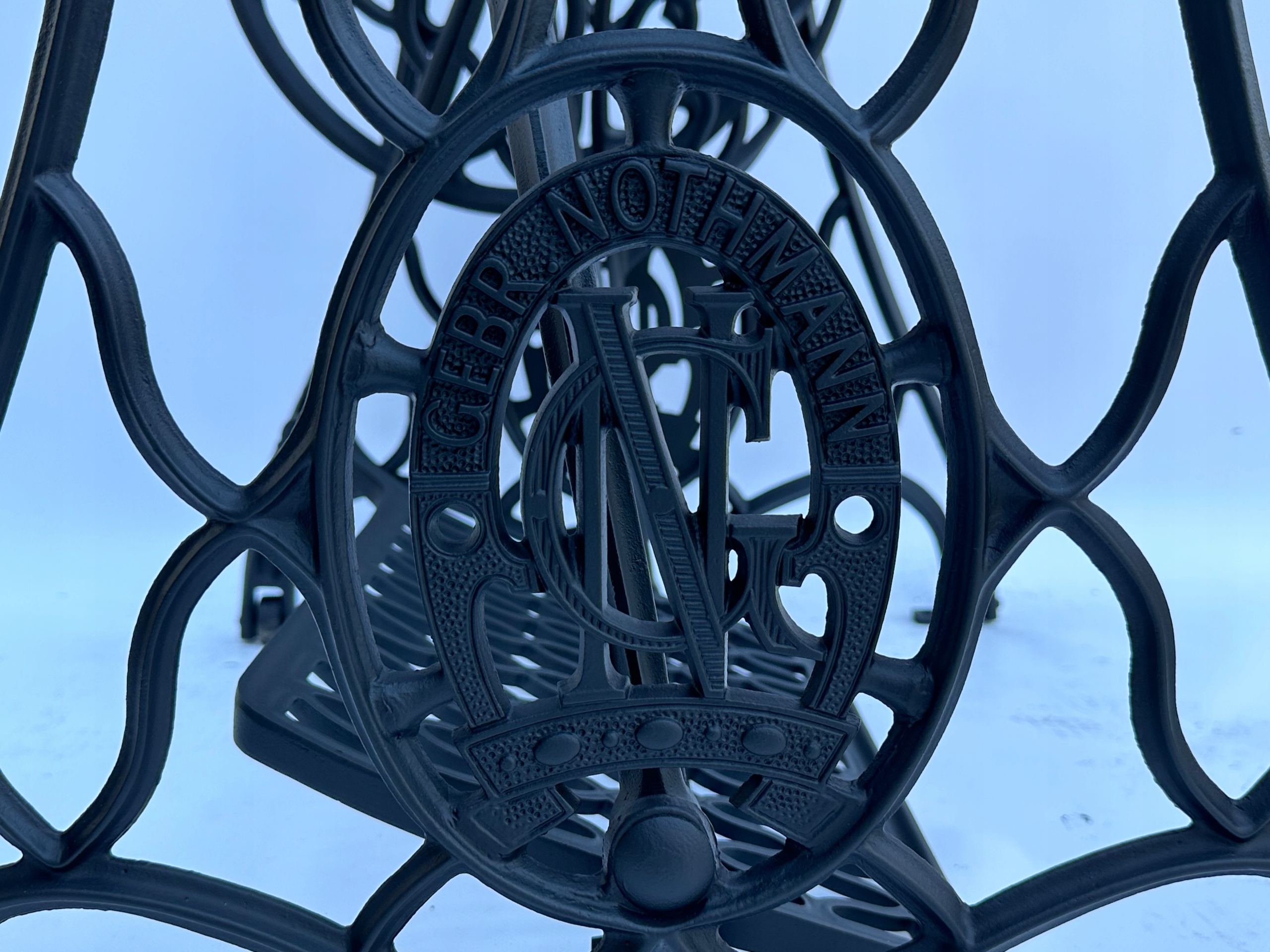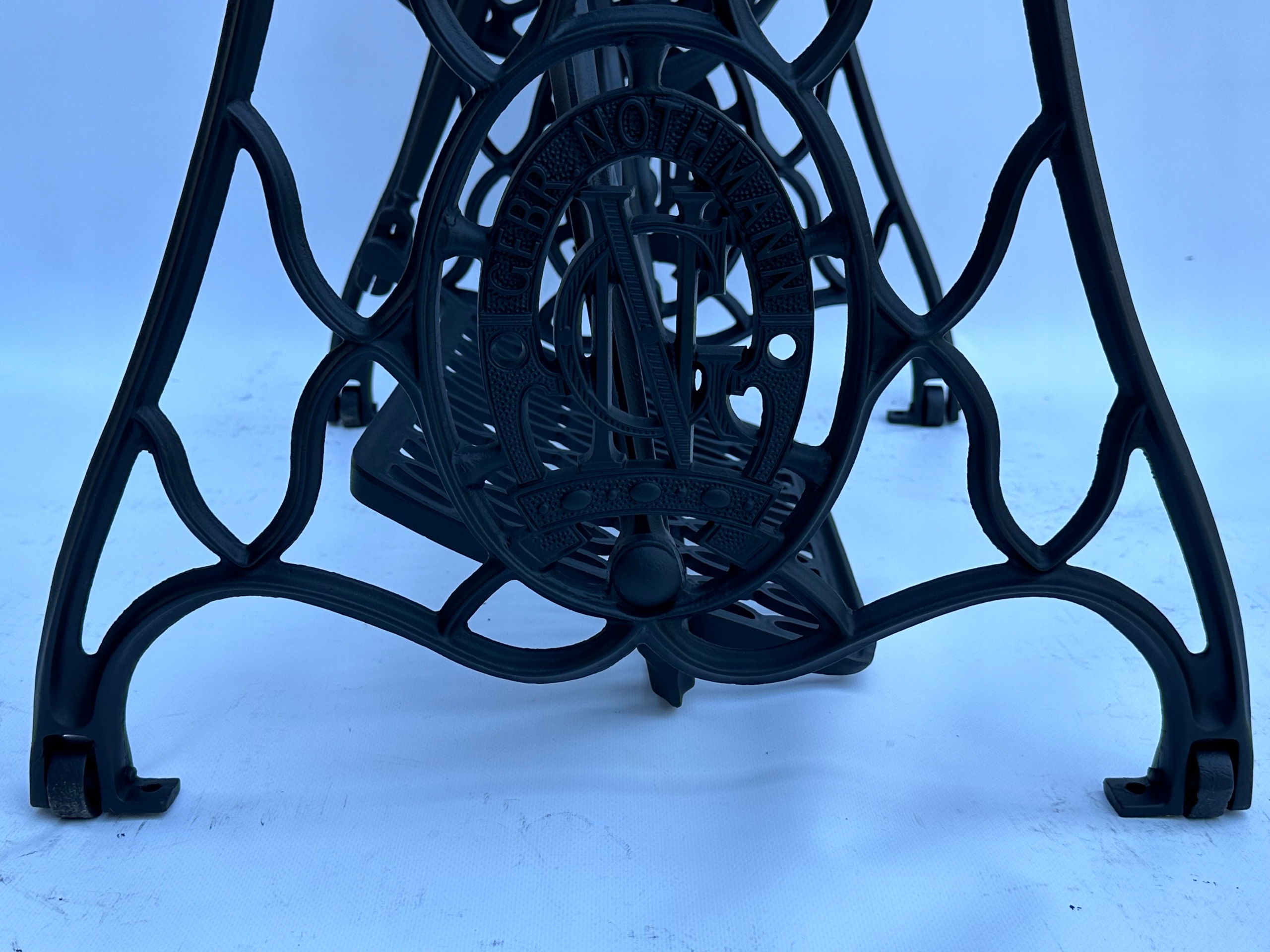 Предмет продажу стара чавунна основа від швейної машинки GEBR. NOTHMANN. Дуже гарний візерунок, менш поширений. З боків написи з логотипом компанії. Він має всі 4 колеса в нижній частині основи.
