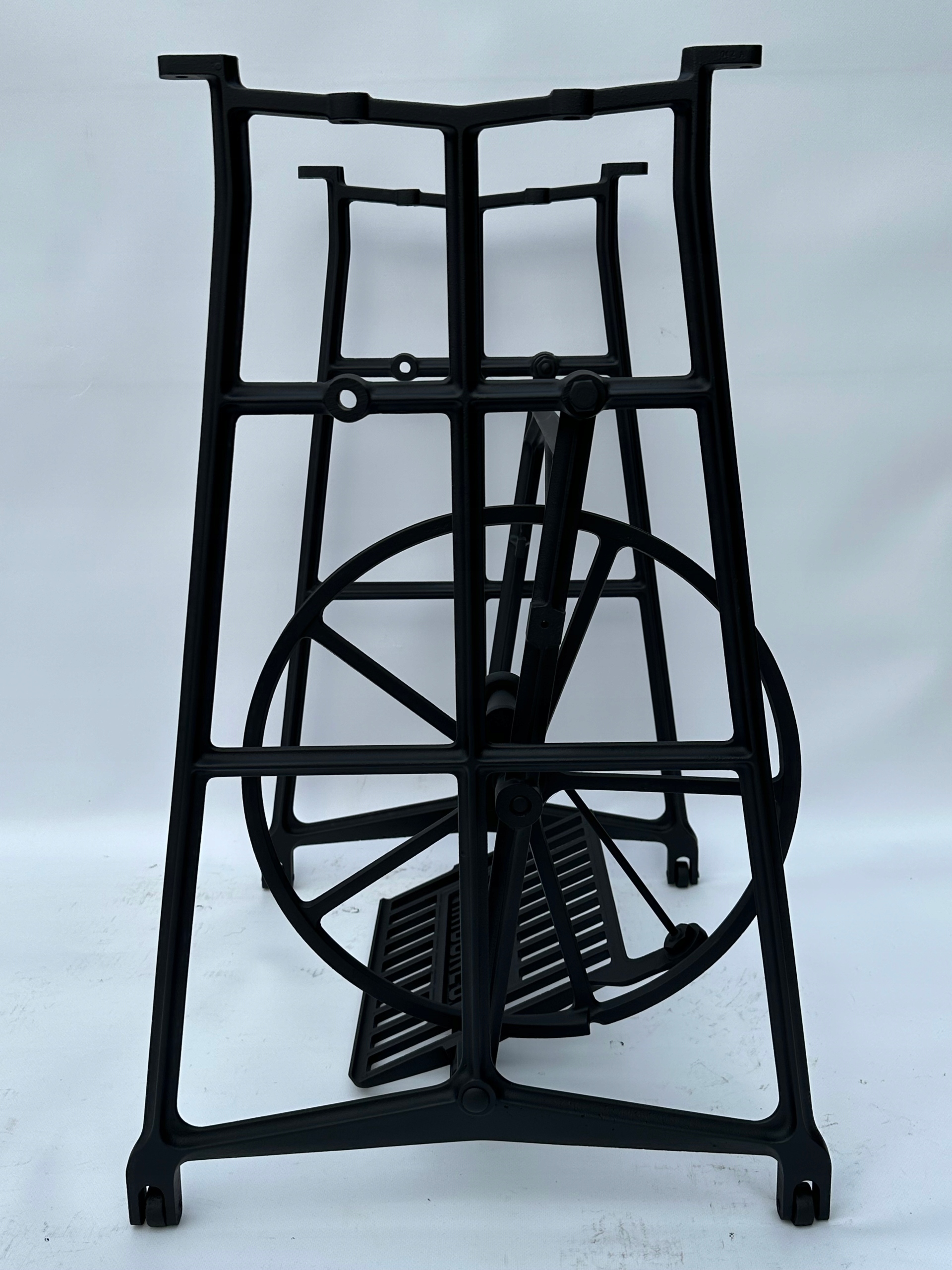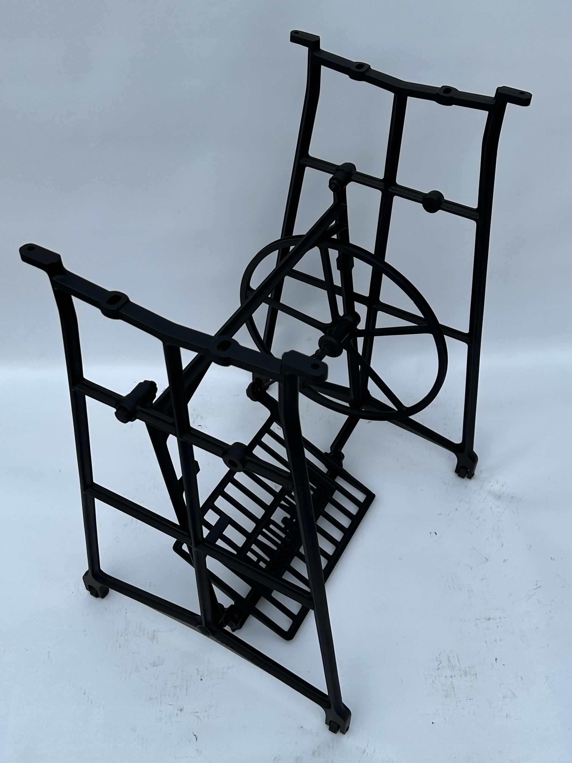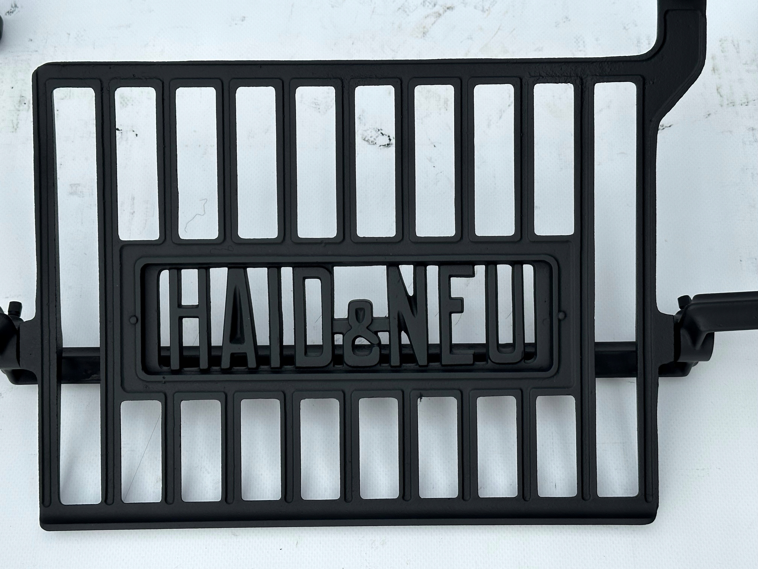 Предмет продажу стара чавунна основа від швейної машини HAID & NEU. Дуже гарний візерунок. Посередині напис з логотипом компанії. У нього всі 4 колеса внизу. Додатковою перевагою є металевий елемент, який з’єднує колесо з педаллю приводу, тому ми можемо бути впевнені, що його не з’їдять дровоєди, що можливо в базах з дерев’яним елементом.